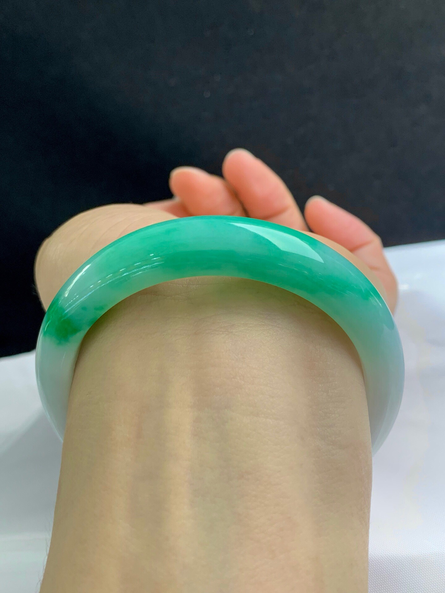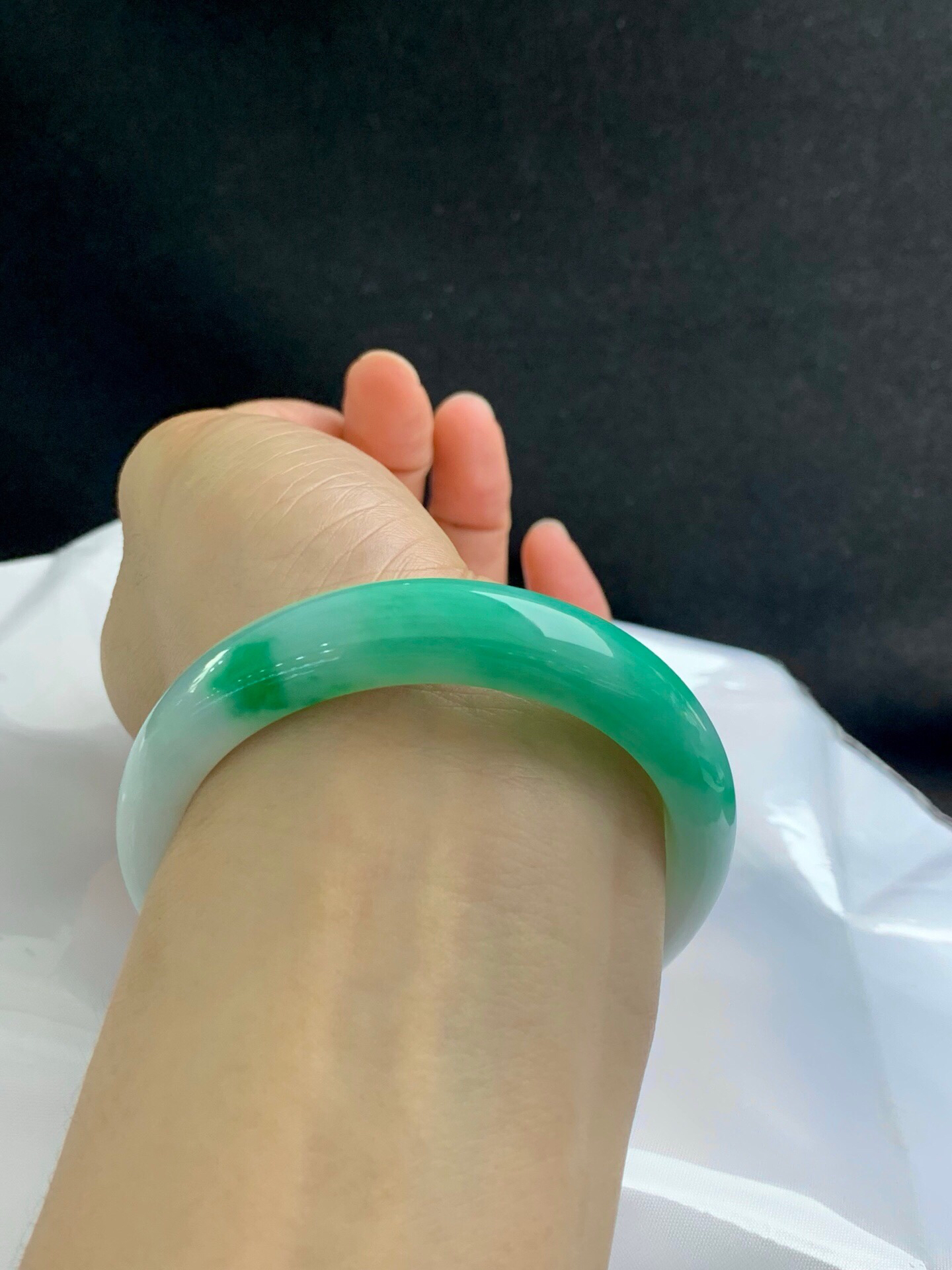 620406,56.7圈口,飘绿正圈平安镯,白底飘一截绿,色阳,底子细腻,完美,尺寸:56.7-13.1-8.1,超值价💰61300 #优石客珠宝#香玉荟萃
