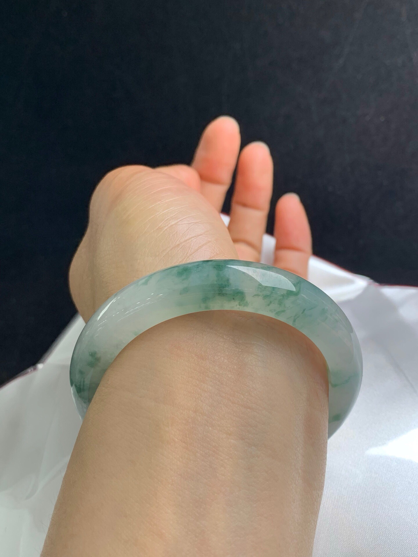 612613,55.3圈口,冰飘花正圈平安镯,老种,冰透起光,白底飘蓝花,条形秀气,完美无裂,尺寸:55.3-11.6-8.6,超值价💰72000 #优石客珠宝#香玉荟萃