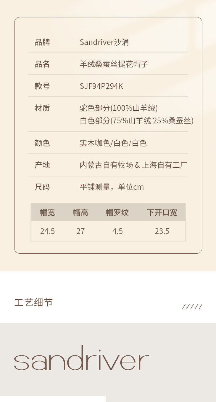历年在巴黎时装周亮相,享誉世界的艺术羊绒品牌[Sandriver 沙涓]由羊绒布道者郭秀玲女士创立。阿拉善自有牧场纯种羔羊绒,日本国宝设计师小筱顺子,上海自有基地精工细作。承载羊绒情怀,坚持匠人品质。