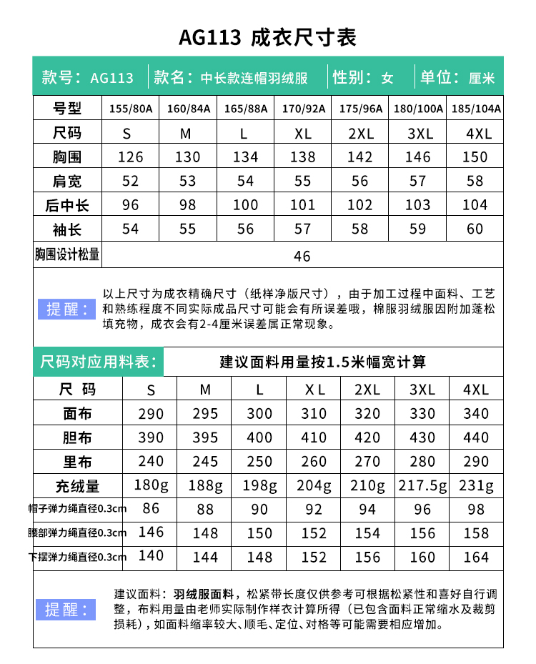 裁缝学苑AG113 羽绒服纸样女中长款女装衣服打版裁剪服装样板图纸