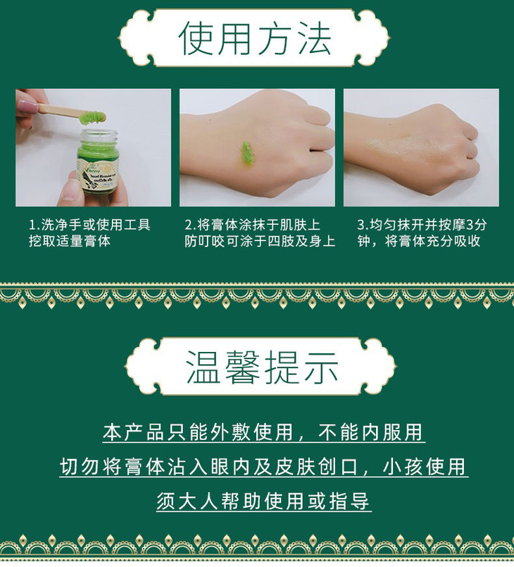 泰国VINCERE(胜利牌)的香茅青草膏,采用天然配方,泰国古法配制,包含了香茅、薄荷、丁香叶油、艾叶提取物、忍冬花提取物和茶叶提取物等植物配方。香茅,温可散寒,辛能驱风,芳香可醒脾祛湿,还带有柠檬香气;薄荷的清凉不言而喻,能疏风散热,闻一闻就精神气爽;丁香和艾叶,经过萃取加工后,驱蚊能力也是一流。作为润肤膏,还特别加入了忍冬花提取物和茶叶提取物,对皮肤也有很好的滋润效果。多种植物精心配合,浓缩调配成这小小的青草膏,香味浓郁又不失宜人,我们一闻提神醒脑,蚊子一闻则避之不及!