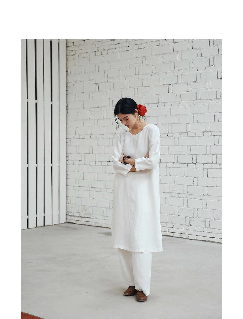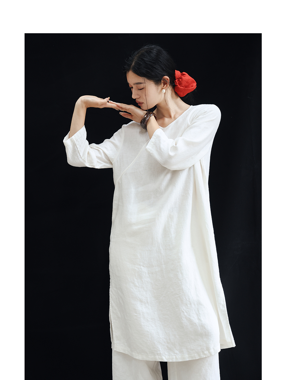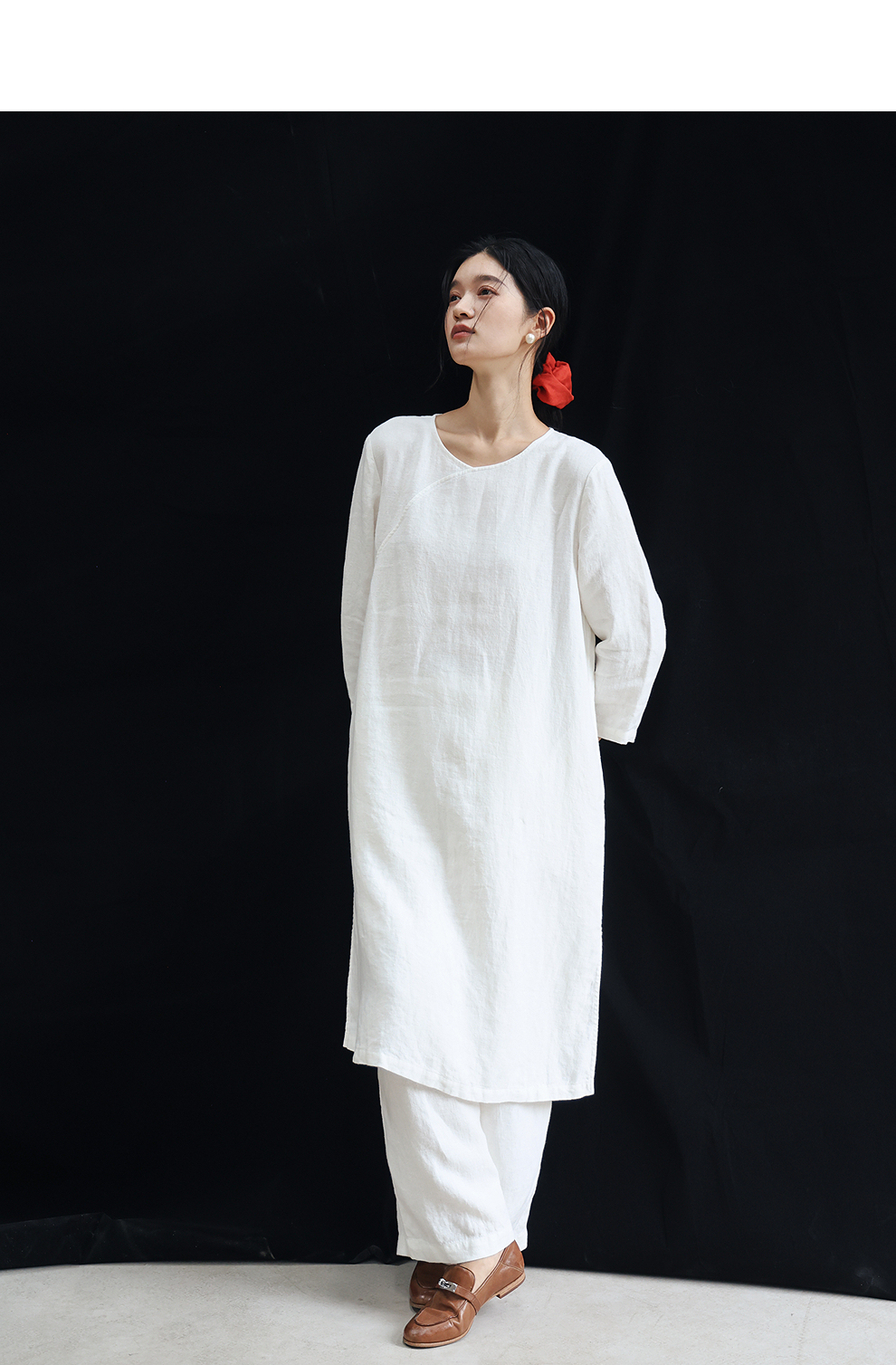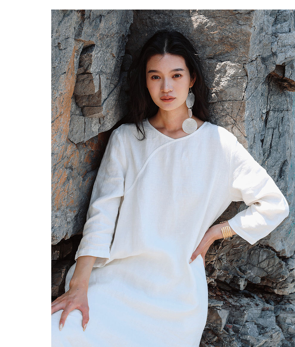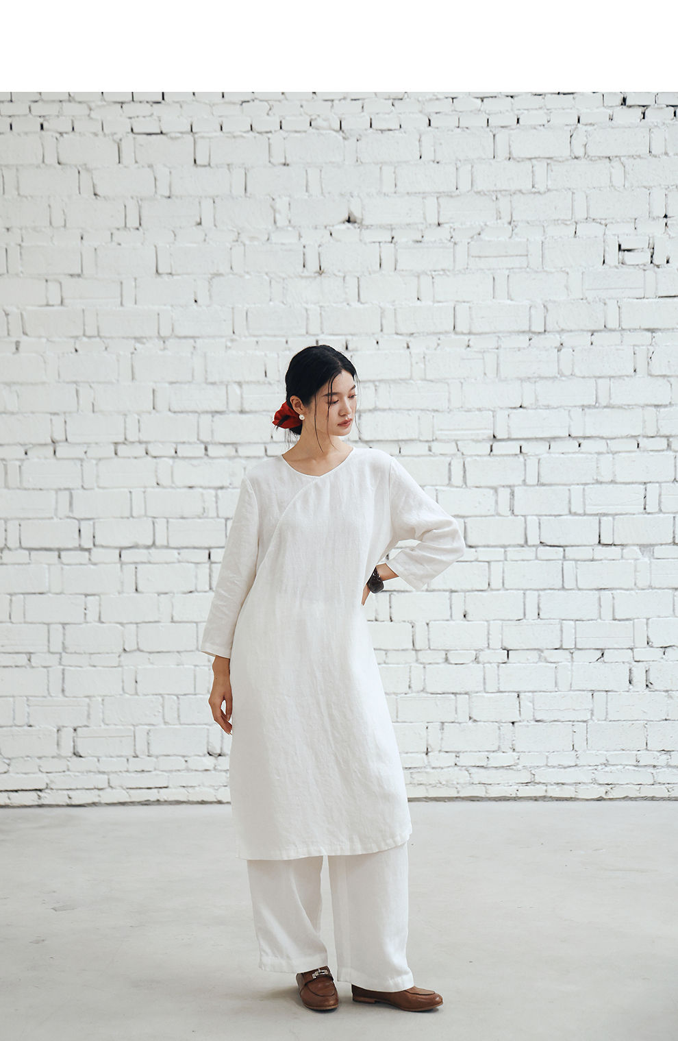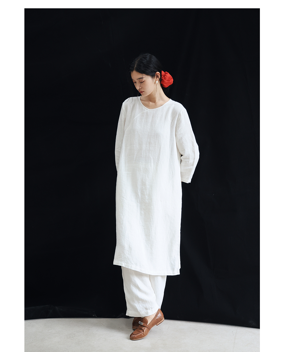 绽放女装448朵/【黑白灰系列】纯汉麻砂洗斜襟高开衩显瘦连衣裙女