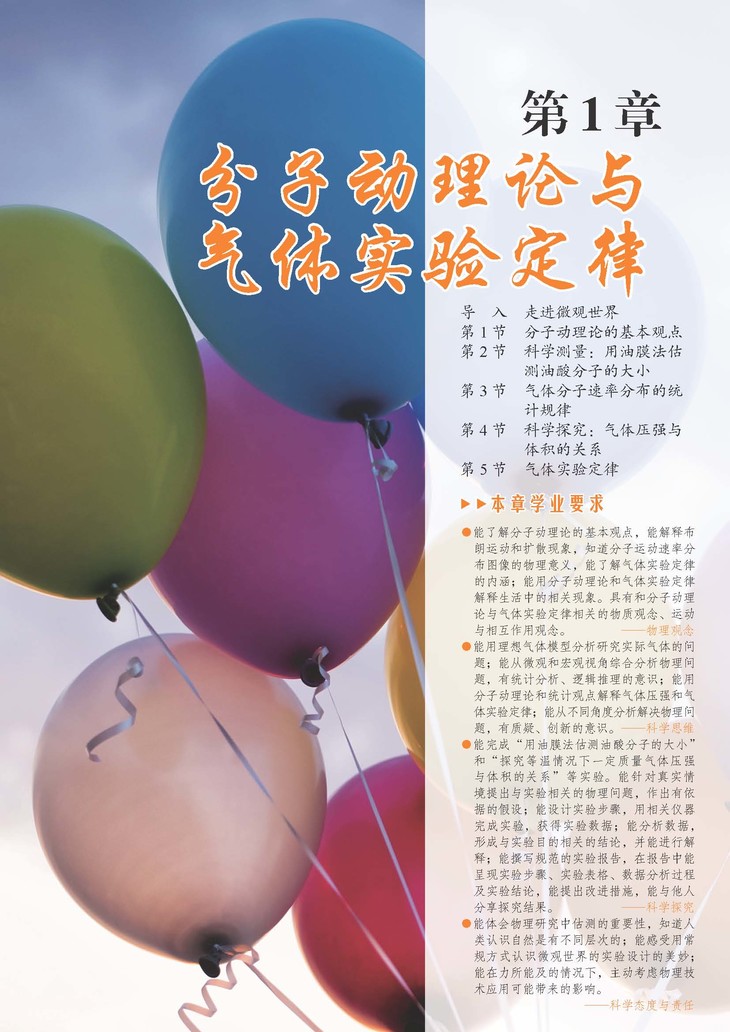 《选择性必修第三册》侧重热学和原子物理,含固体、液体和气体,热力学定律,原子与原子核,波粒二象性方面的内容。本模块通过对以上内容的学习,引导学生了解固体、液体和气体的微观结构及热力学定律等内容;认识光及实物粒子的波粒二象性,进一步认识光的本性;完善对物质的认识,形成相对完整、科学的物质观念;体会和掌握测量微观量的思想和方法,能利用不同的方法和手段分析和处理信息;注重运用气体实验定律、热力学定律等分析和解决实际问题;广泛了解核能等对人类生活和社会发展的影响。进一步促进学生的物质观念、运动与相互作用观念、能量观念和物理模型建构等物理学科核心素养的形成。