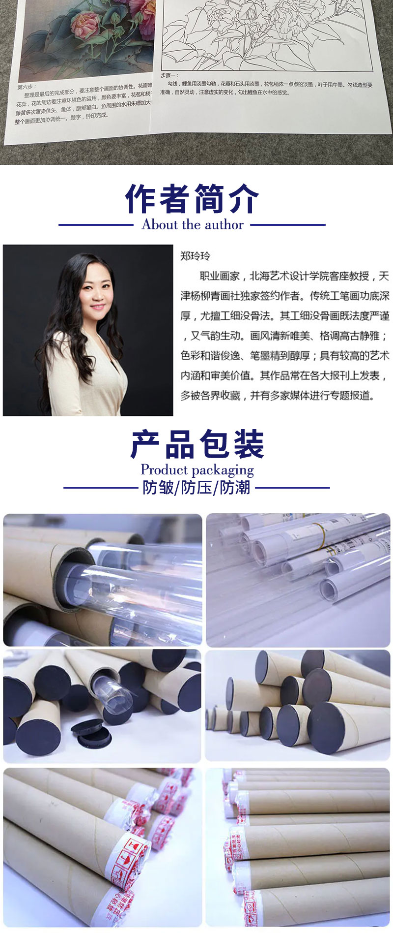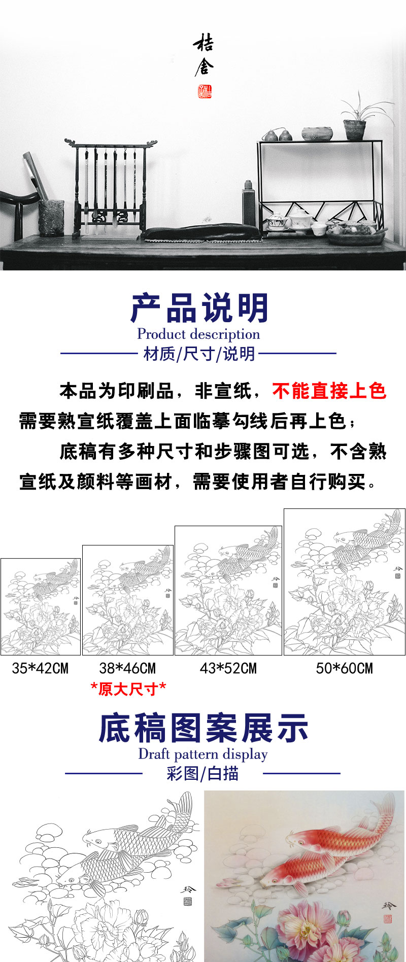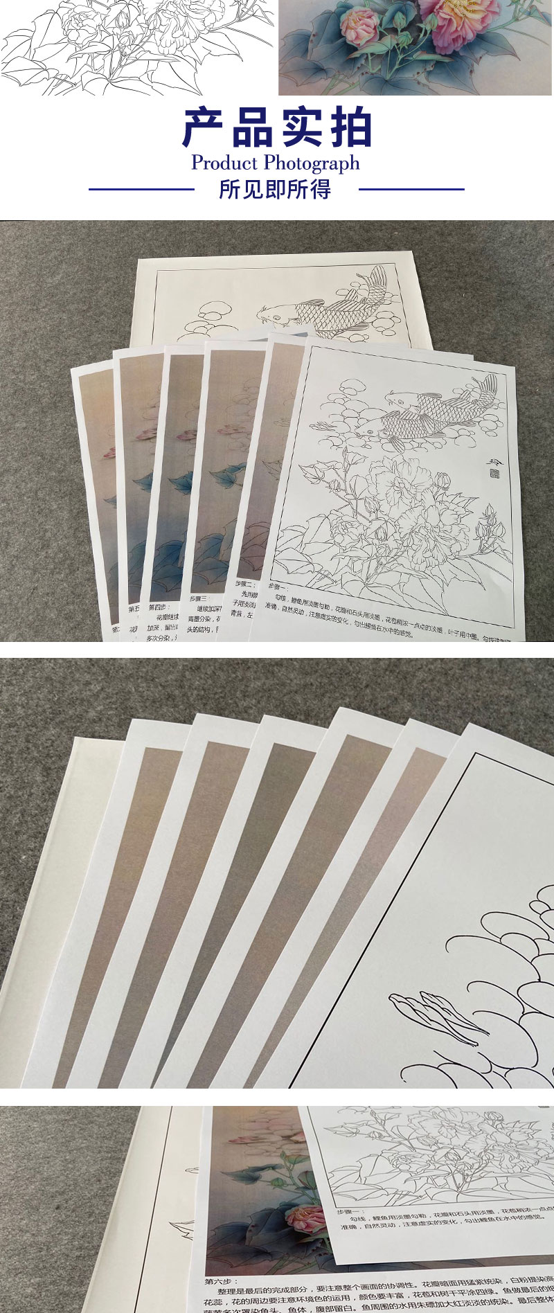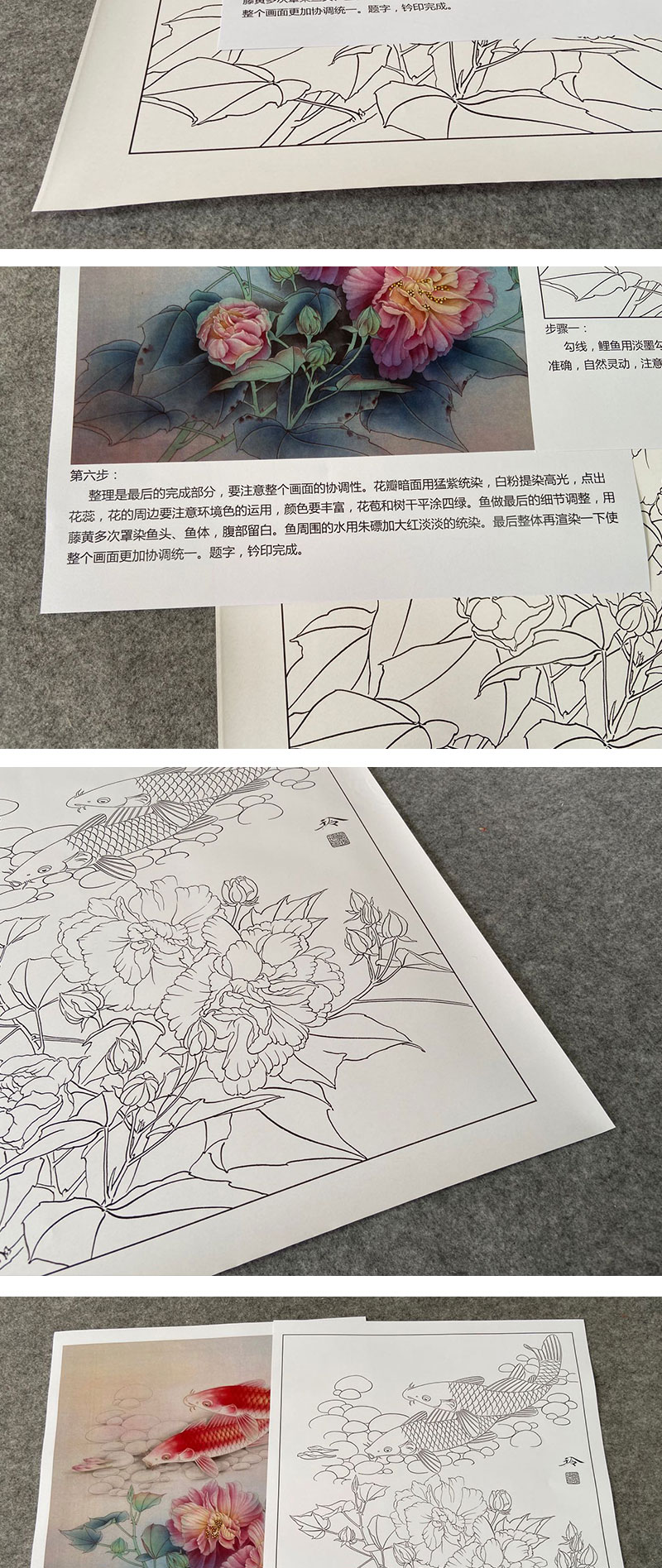 【有步骤、大彩图】郑玲玲工笔画白描底稿《梦里花开》牡丹鲤鱼初学者临摹花鸟线稿ZL37