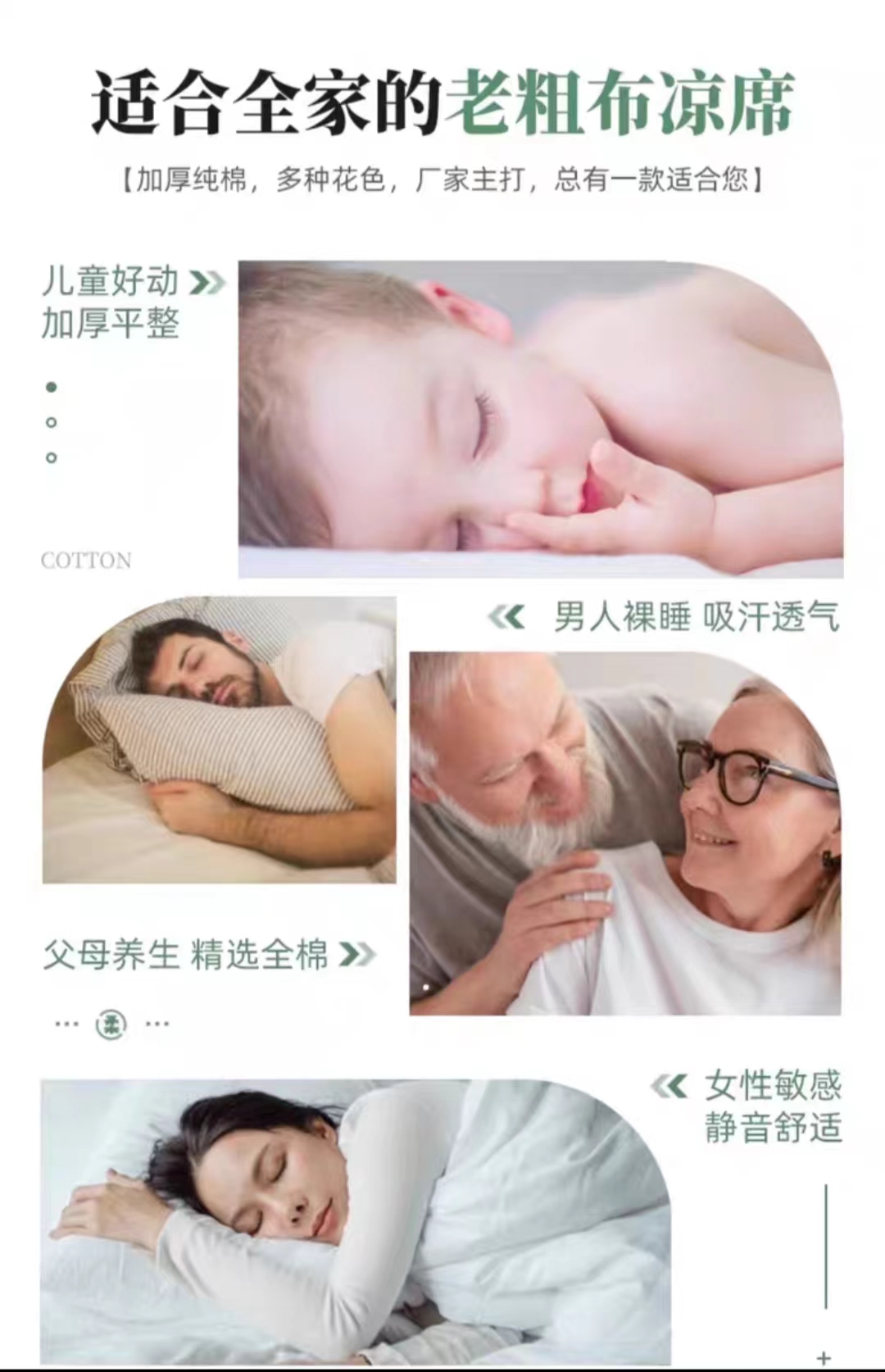 纯棉特厚经典老粗布软凉席这款凉席选用新疆长绒棉纺纱采用传承复古色织工艺,纯棉精梳21织纱线五股并织,具有一定肌理感密度更高厚实挺括平整不打滑纹路清晰紧密结实耐用透气吸汗、干爽不粘身凉而不冰不起球不掉色、不易起皱不起静电经久耐洗绿色环保,老少皆宜花色典雅大方复古风的撞色条纹设计带来回归大自然的美。