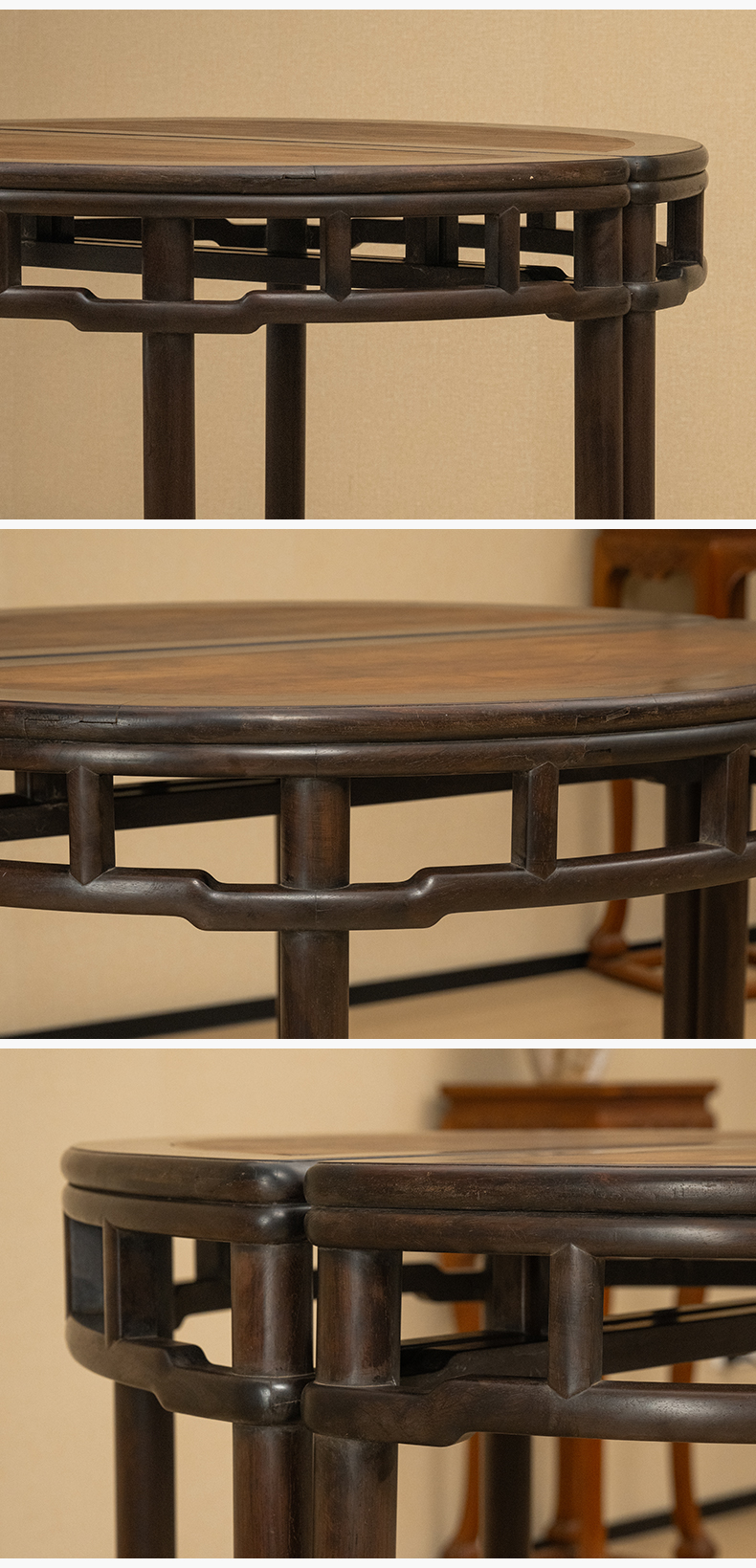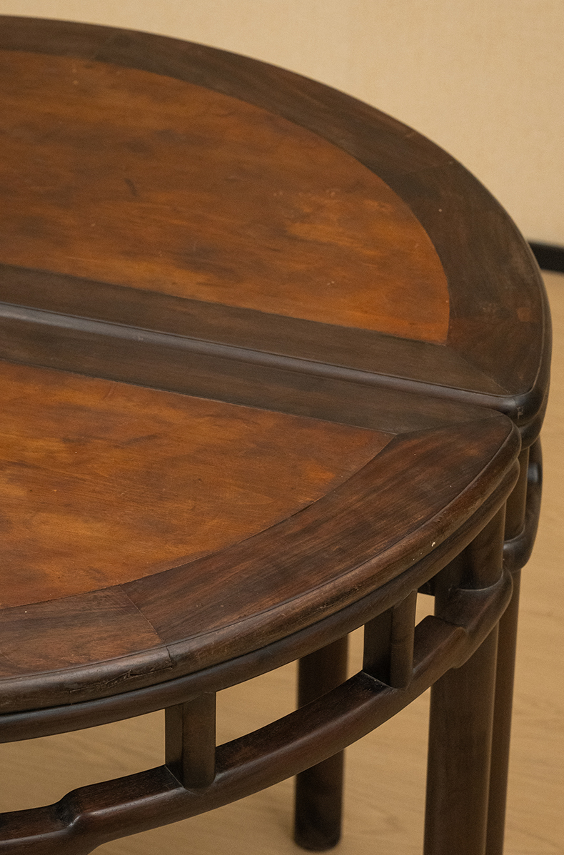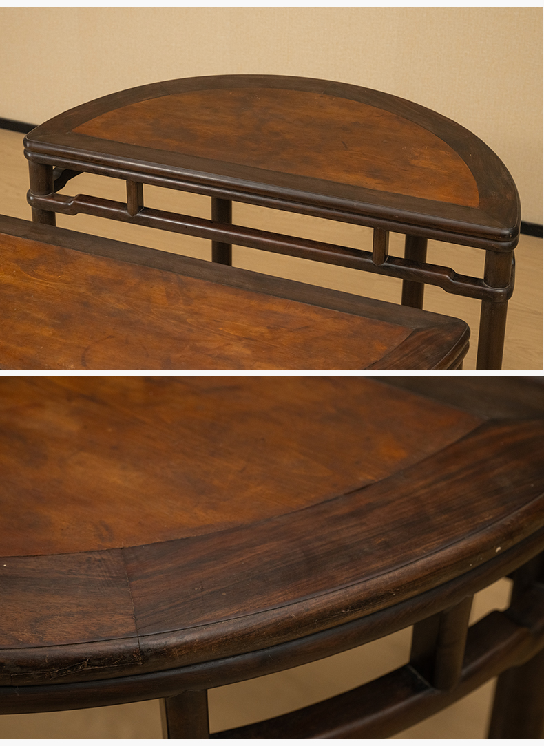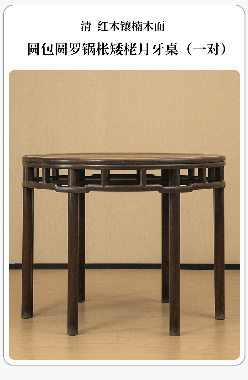 清 红木镶楠木面圆包圆罗锅枨矮栳月牙桌(一对)