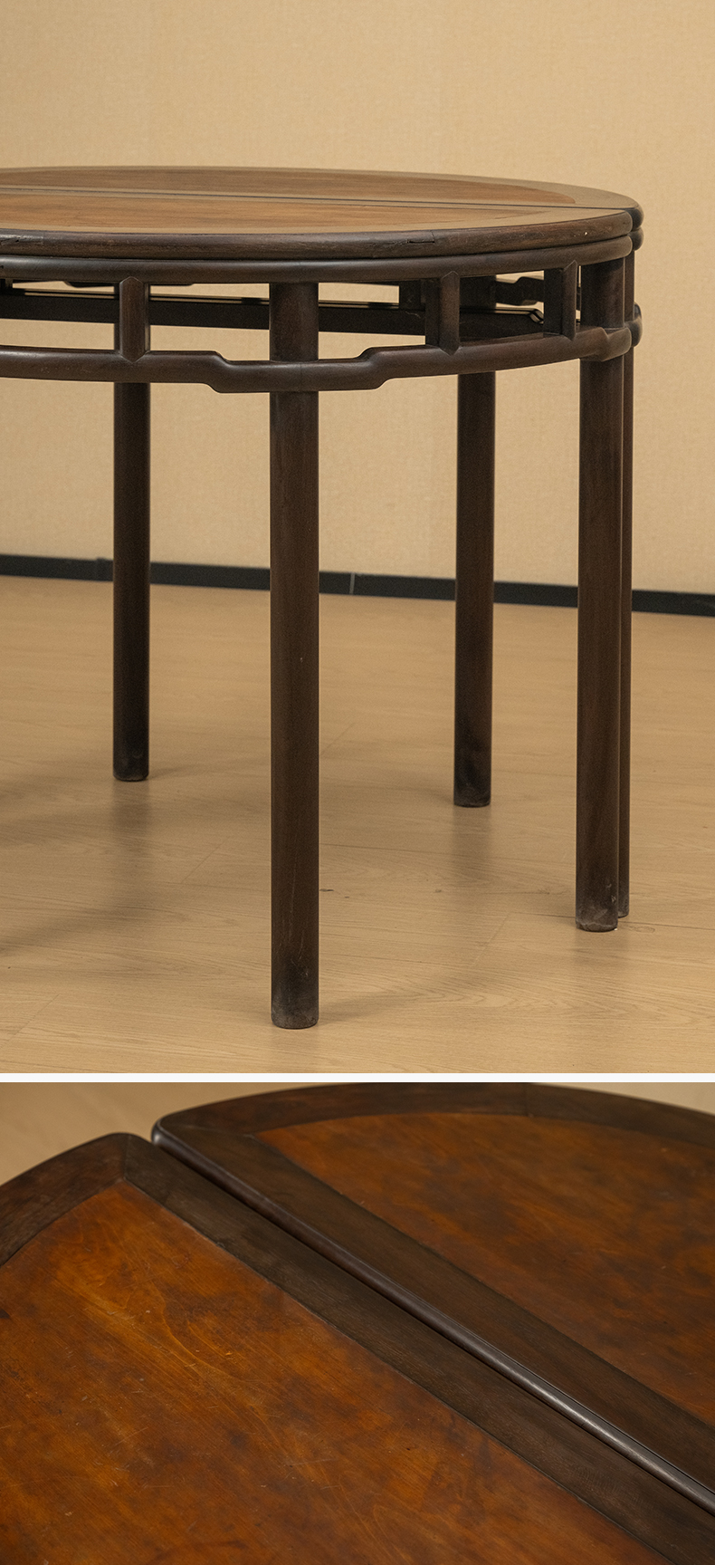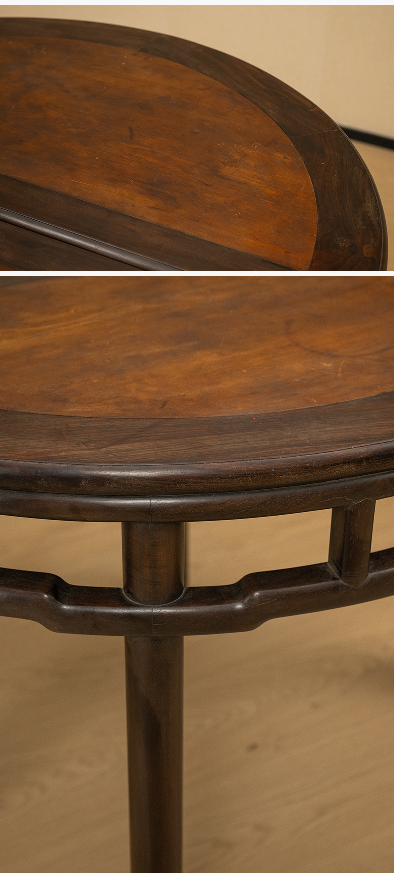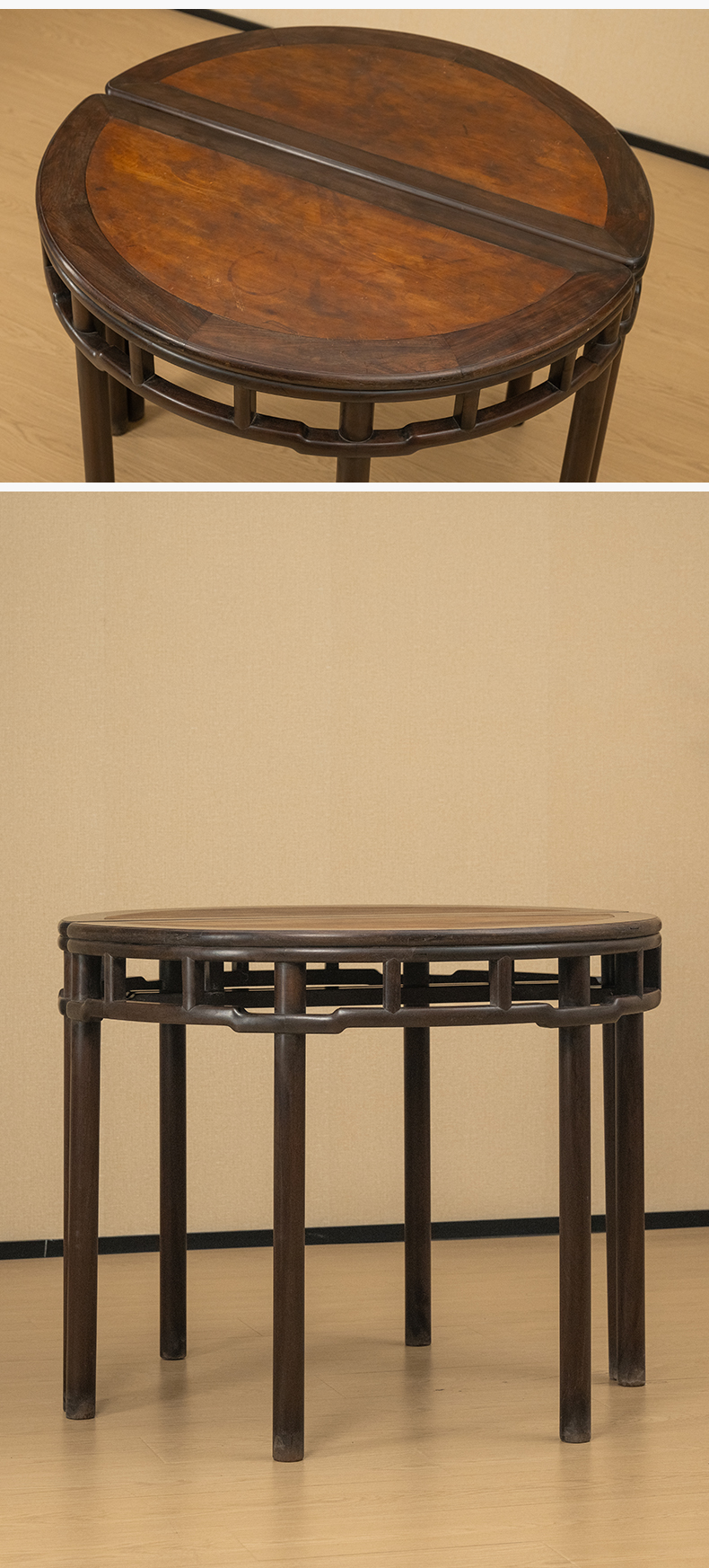 清 红木镶楠木面圆包圆罗锅枨矮栳月牙桌(一对)