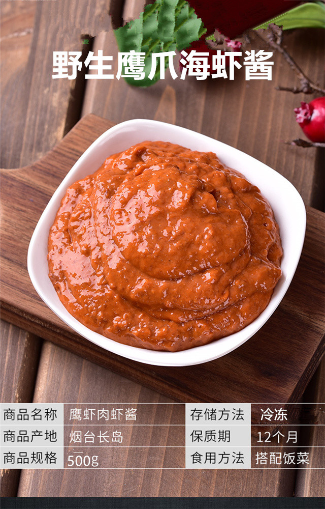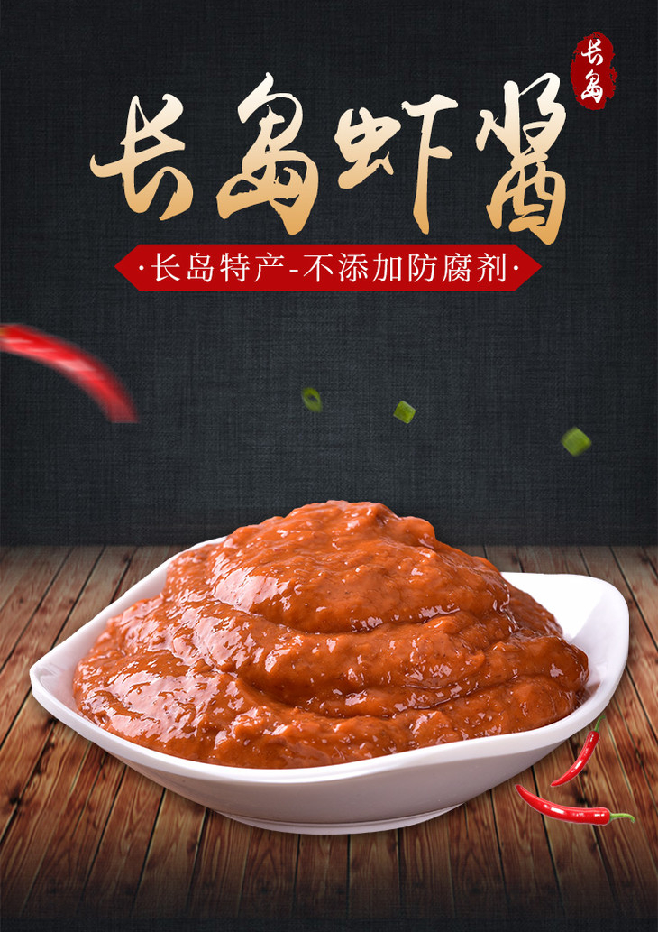 长岛县海虾酱,采用传统制作方式,所使用的原料为比较昂贵稀少金钩海米同款整只鹰爪鲜虾,为了保持鲜味和品质,鹰爪虾捕捞上岸后立即进入车间制作,采用低温轻发酵,所以没有传统蜢虾酱发酵后的重口味(类似于臭豆腐的味道),属于胶东渔民传统自制的口感,低盐鲜香,生菜蘸酱,炒鸡蛋等等都是鲜味无比的口感。