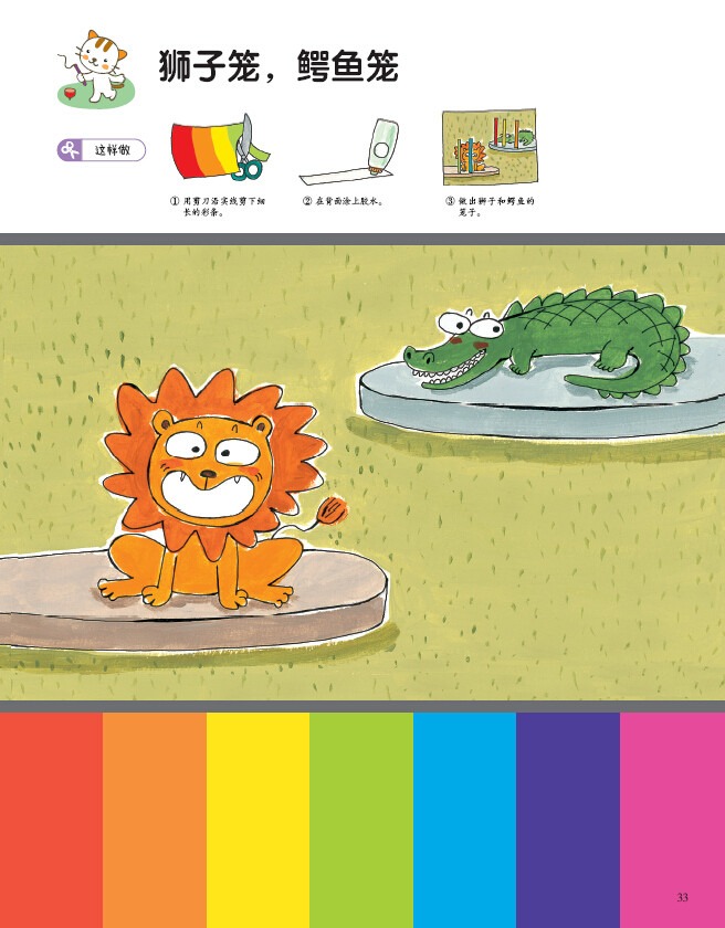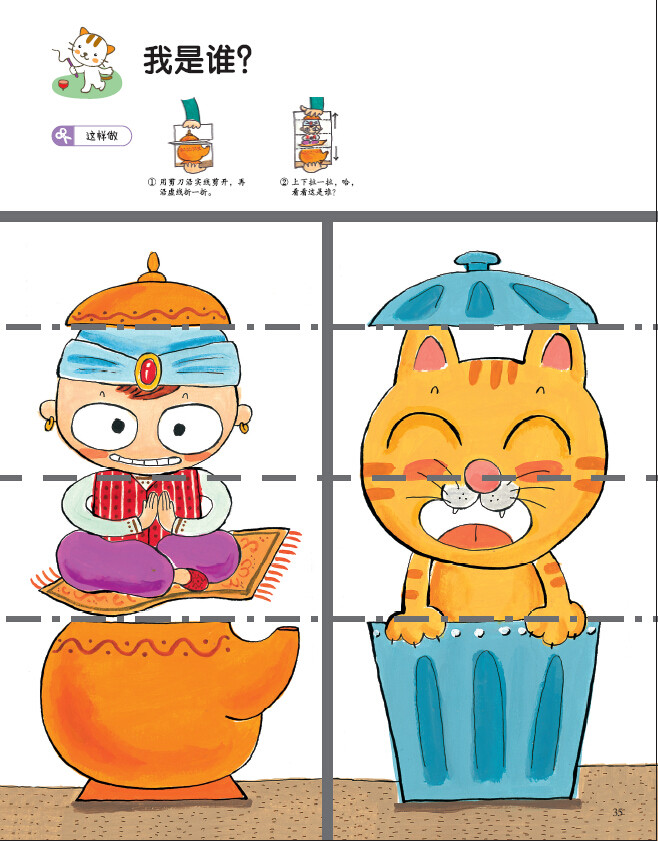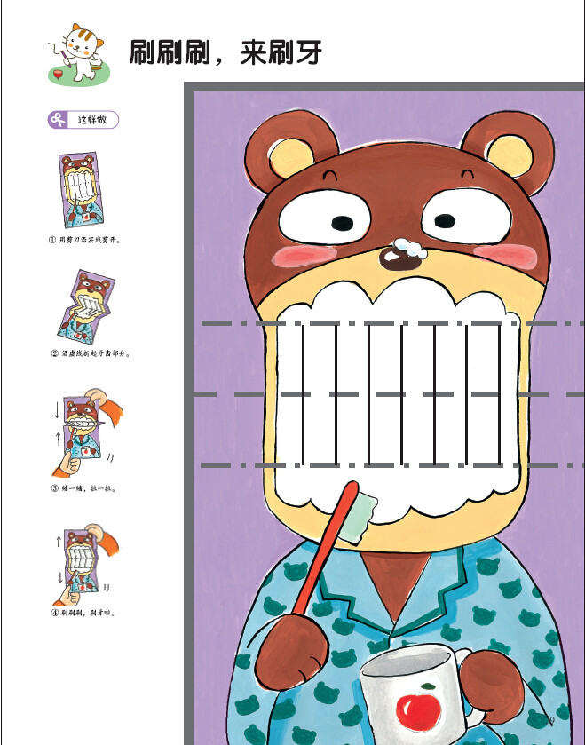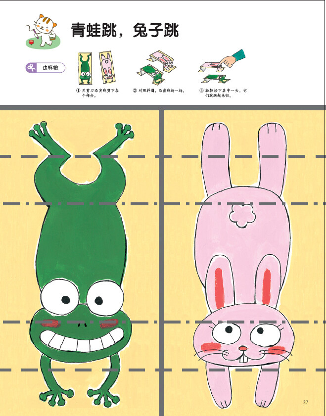 本册书主要是想通过简单的手工游戏,培养儿童立体感和对剪刀的操作能力。儿童从2岁开始,手部小肌肉逐渐发育,能够使用剪刀了。经过剪切和折叠,纸张慢慢变化的样子会让孩子们感到很神奇,看到自己做出的作品也能逐渐学会爱惜、感到自豪。