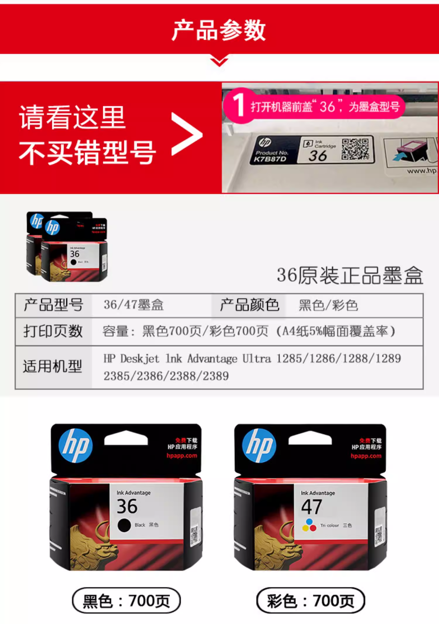 惠普原装36黑色墨盒47彩色墨盒1285 1286 1288 1289 2385 2386 2388 2389打印机黑彩墨水盒9R1W4AA惠普47墨水