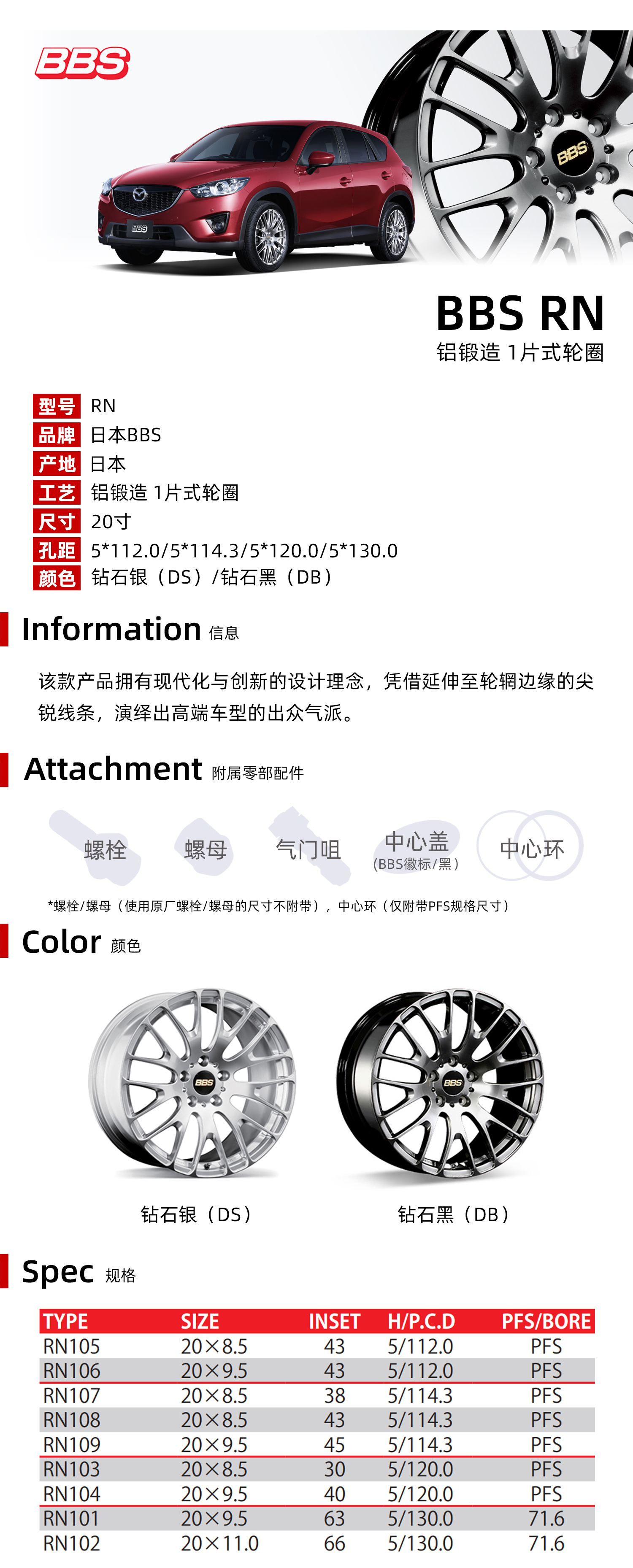 BBS RN型号 一片式铝锻造轮圈 20寸 5*112/114.3/120/130