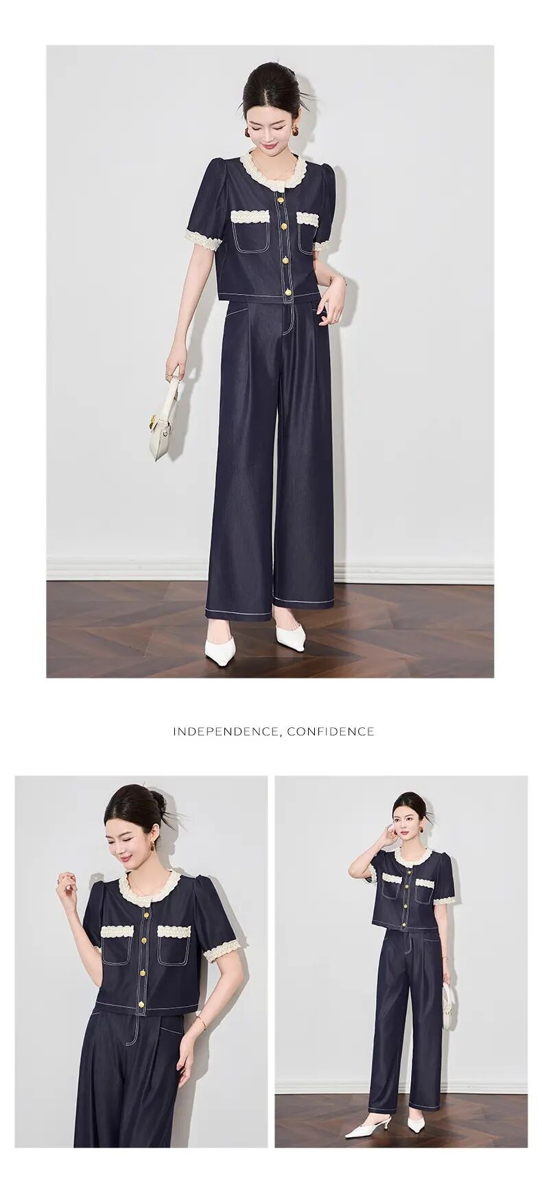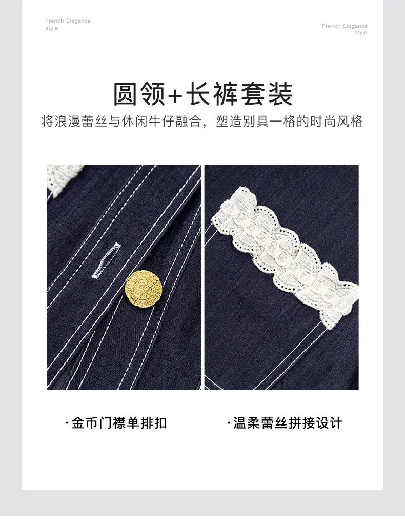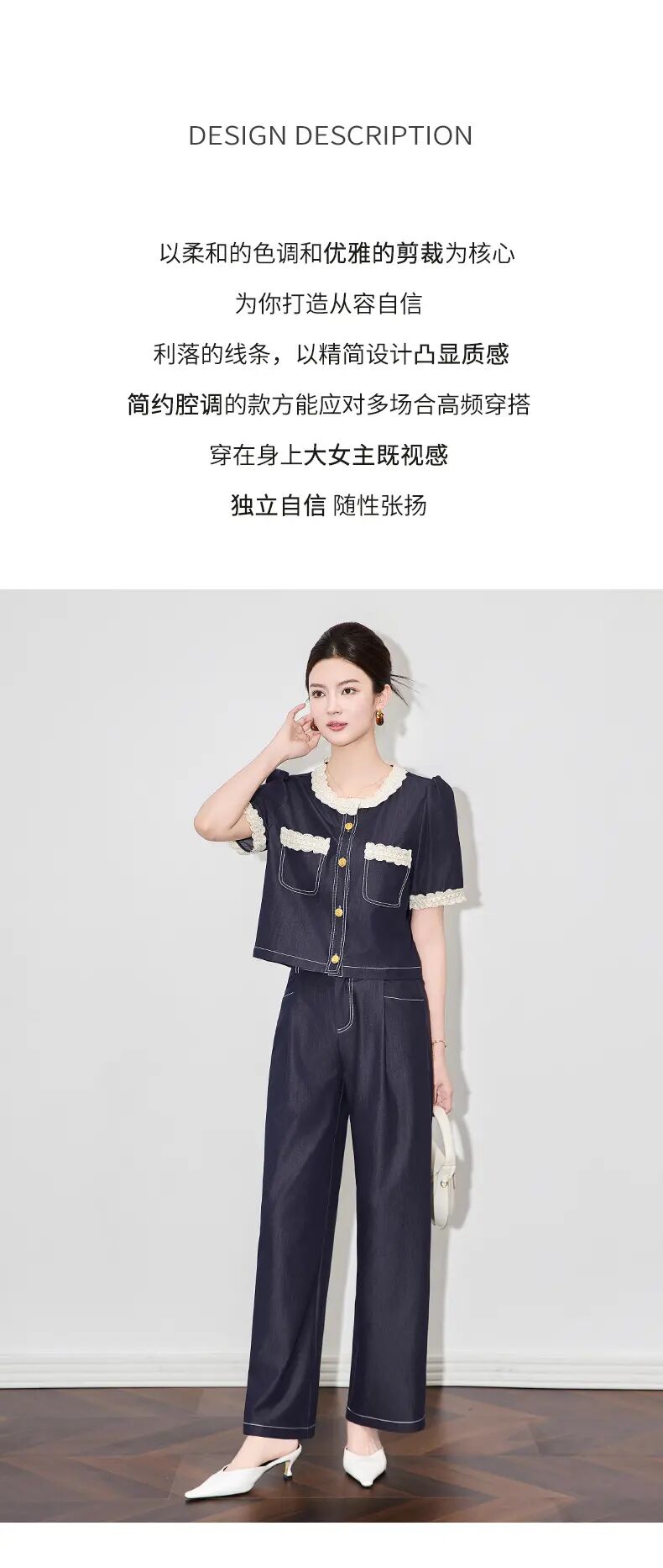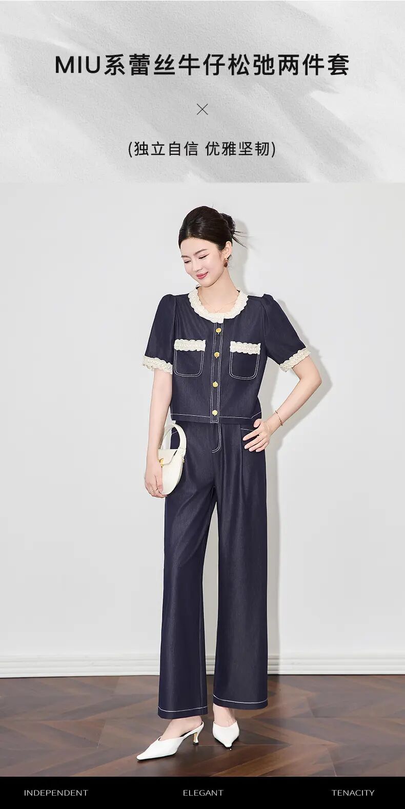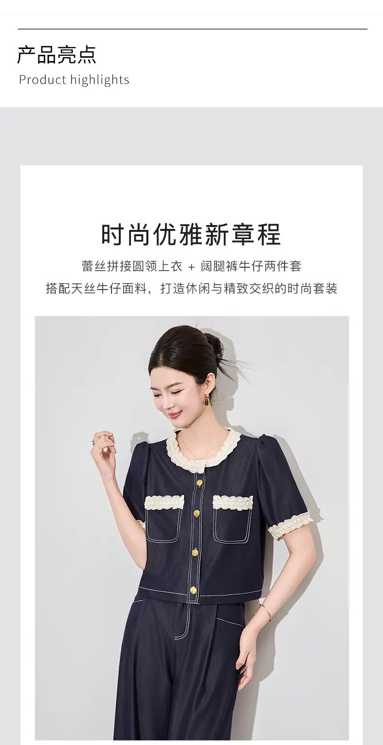 【高货wl】全新升级【铂金会员339/天猫459/差价120】(99415) 洛诗琳时尚花边拼接圆领天丝牛仔上衣休闲阔腿裤女两件套