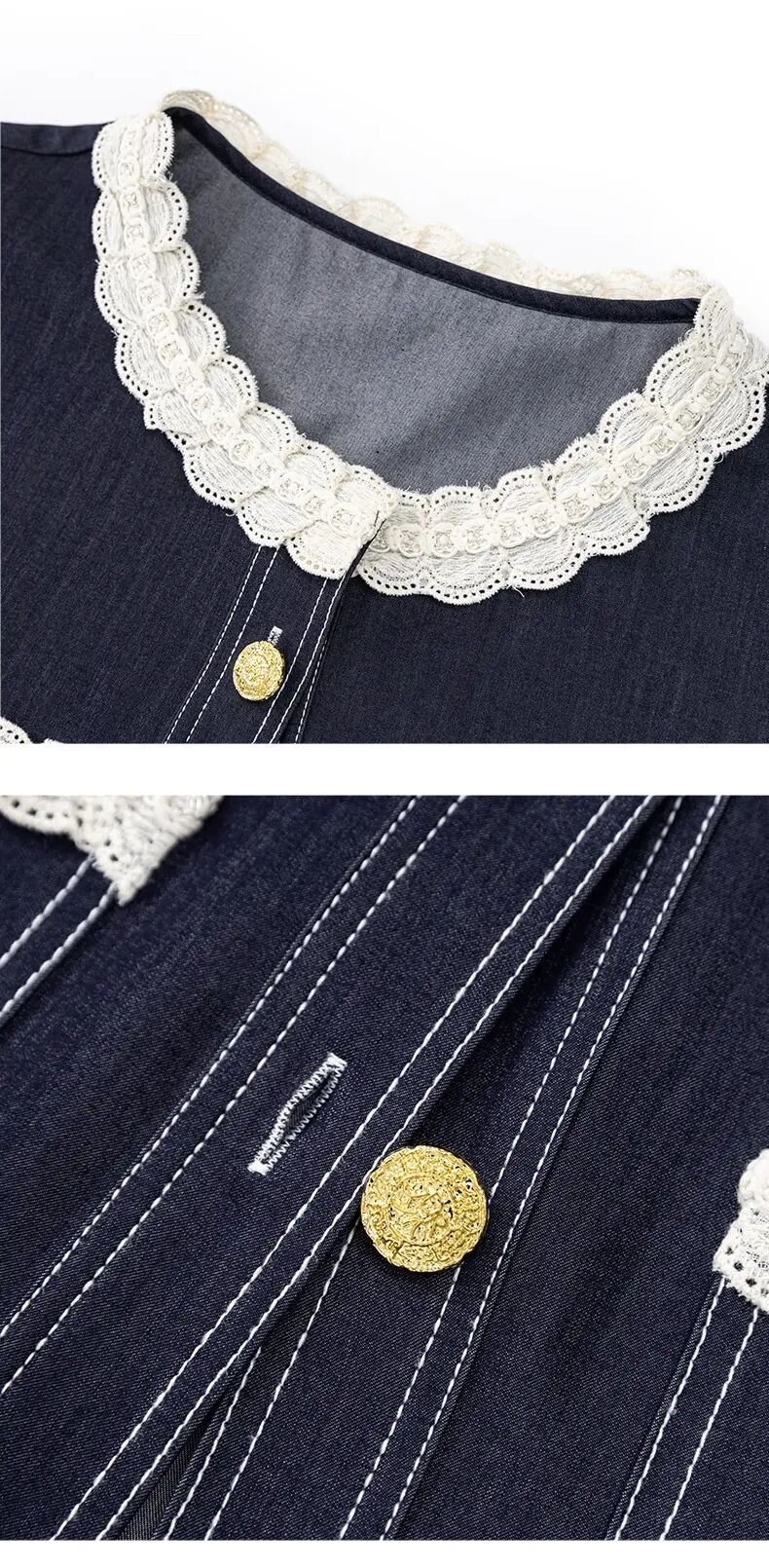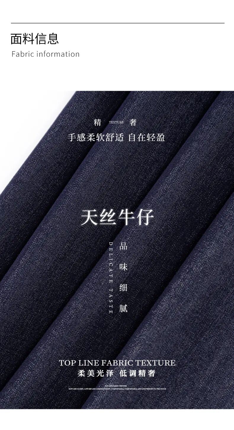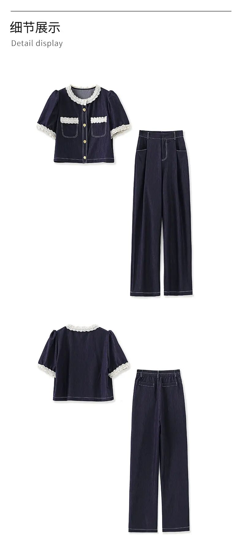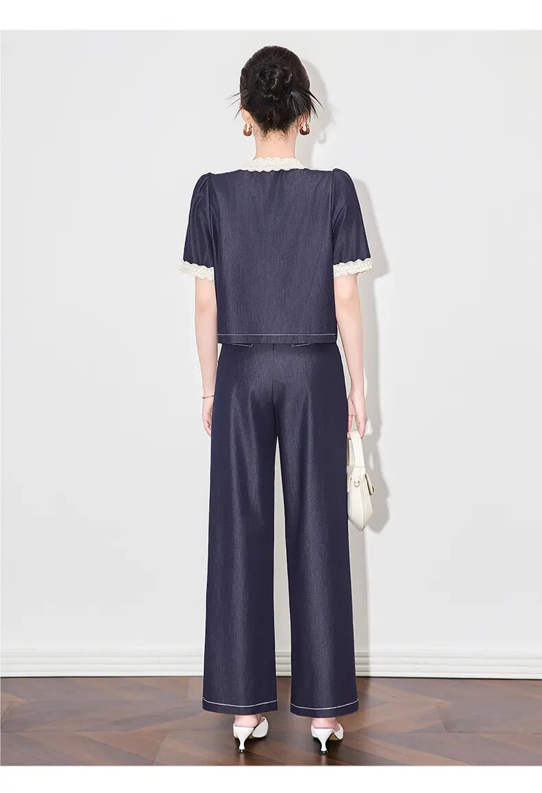 【高货wl】全新升级【铂金会员339/天猫459/差价120】(99415) 洛诗琳时尚花边拼接圆领天丝牛仔上衣休闲阔腿裤女两件套