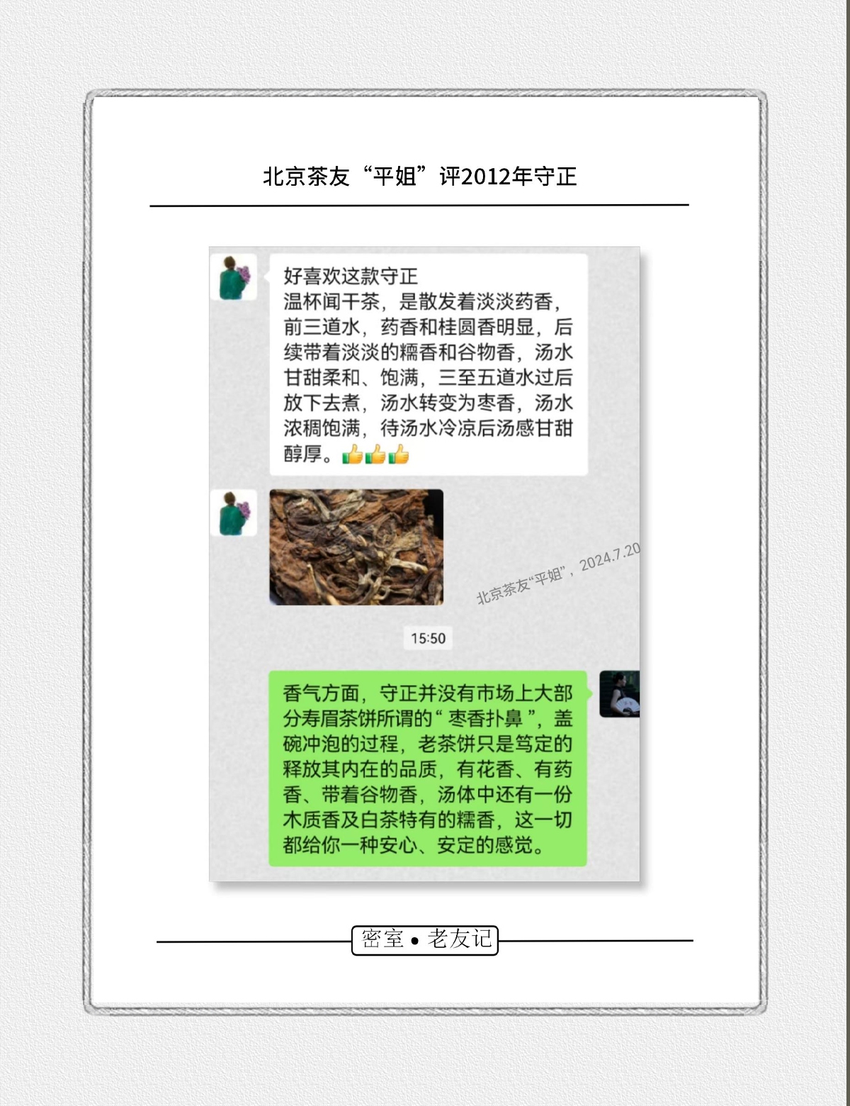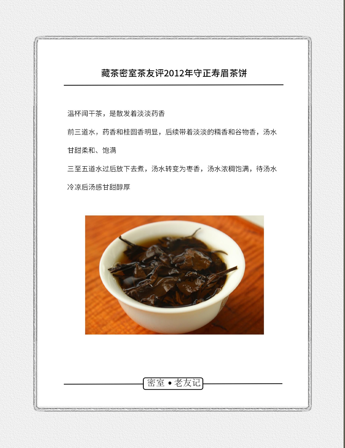 - 2021年,嘉木会创办了“藏茶密室”,开启了全新的藏茶模式,秉持“不将就,不迎合”的理念,通过“选、藏、养、醒”的方式,再度诠释藏茶的深意,沉醉杯汤,苦乐自知,茗透于心,迷之不悔!