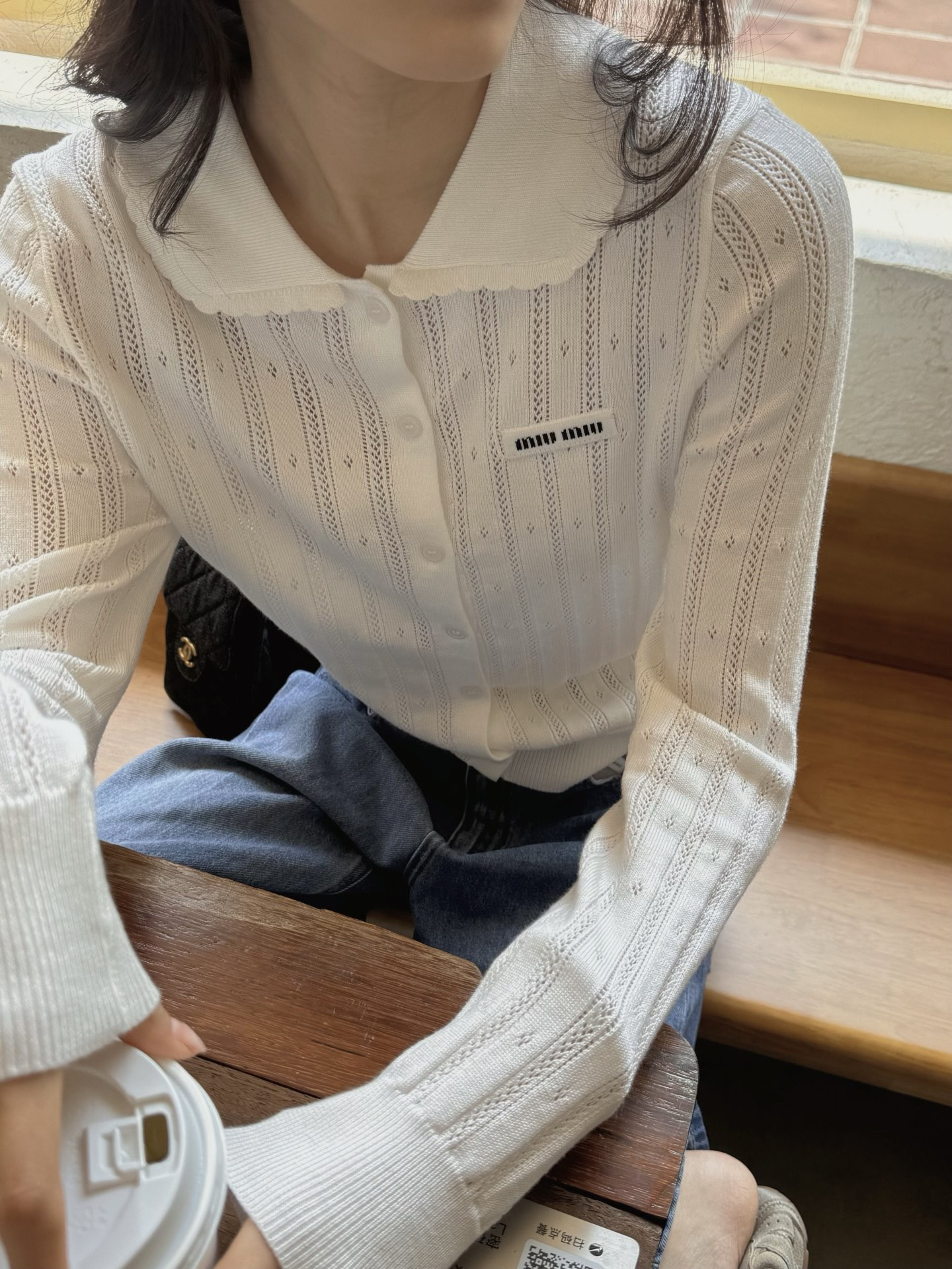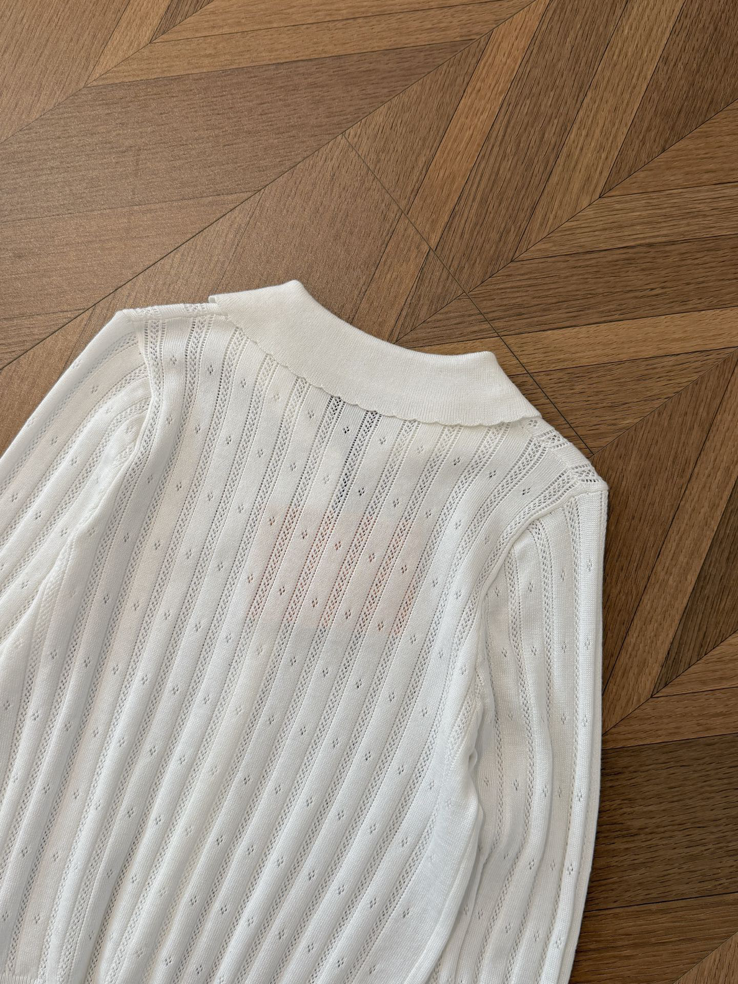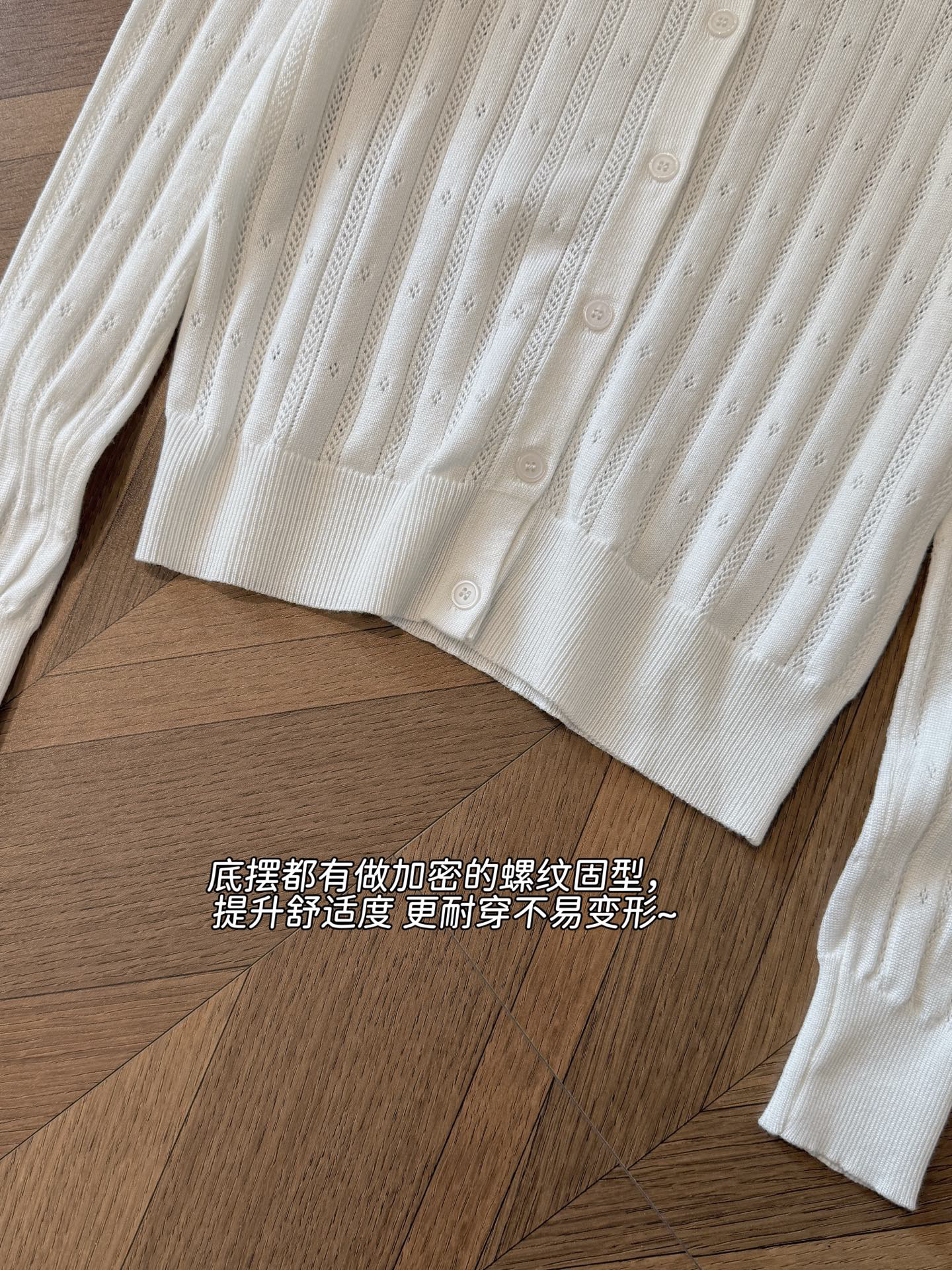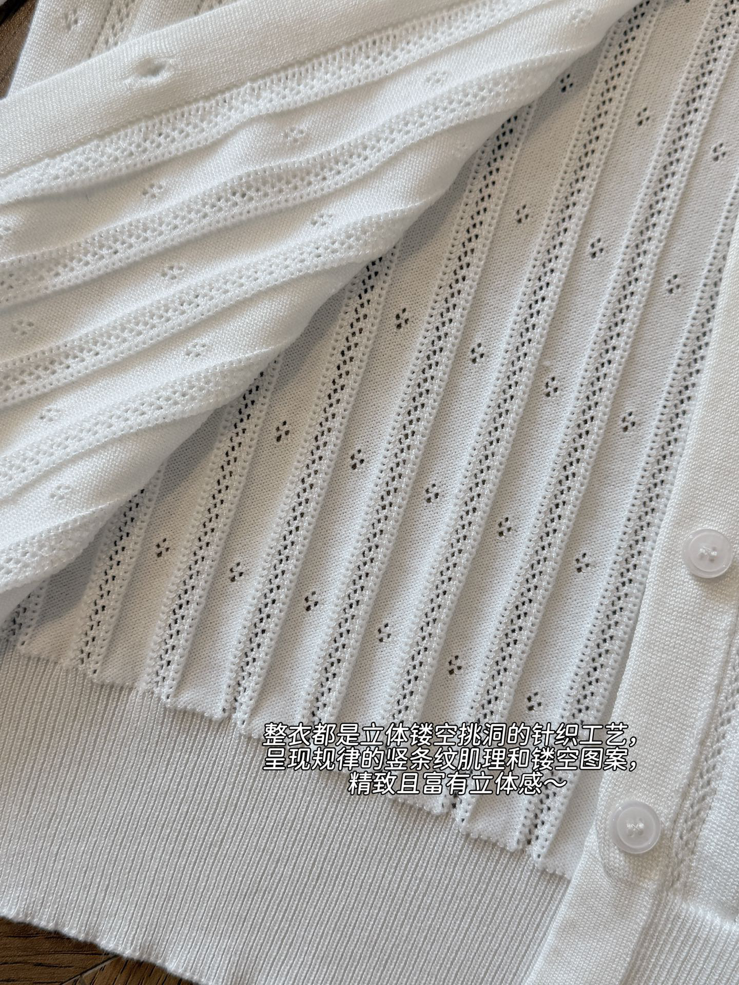 整衣都是立体镂空挑洞的针织工艺,呈现规律的竖条纹肌理和镂空图案,精致且富有立体感。
