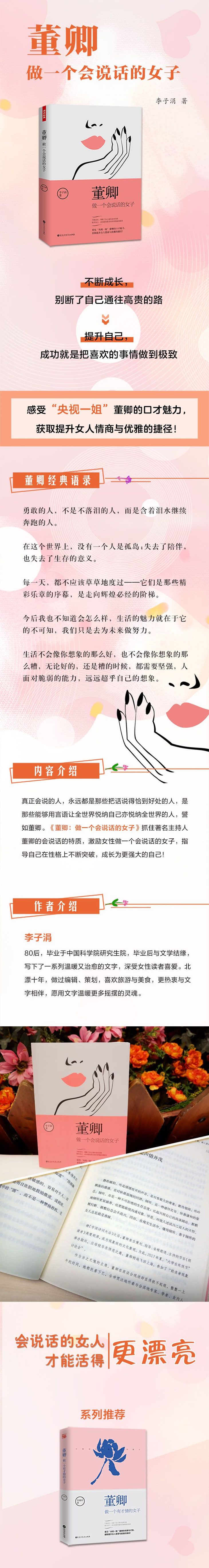 真正会说的人,永远都是那些把话说得恰到好处的人,是那些能够用言语让全世界悦纳自己亦悦纳全世界的人。《董卿:做一个会说话的女子》抓住著名主持人董卿会说话的特质,激励女性做一个会说话的女子,指导自己在性格上不断突破,成长为更强大的自己!