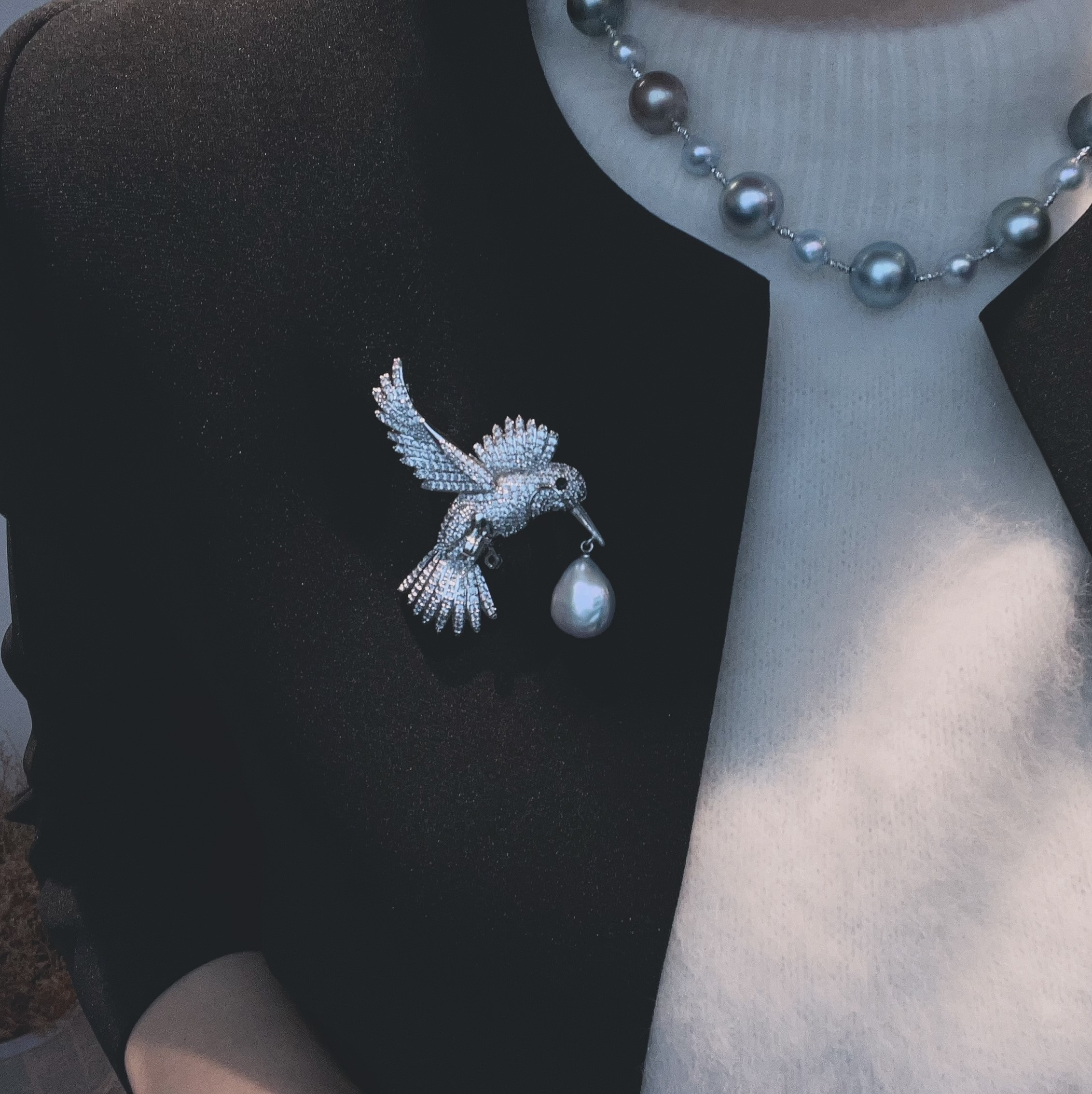 一个白色底彩色几何的珐琅扣,另一个巴洛克蜂鸟珍珠胸针