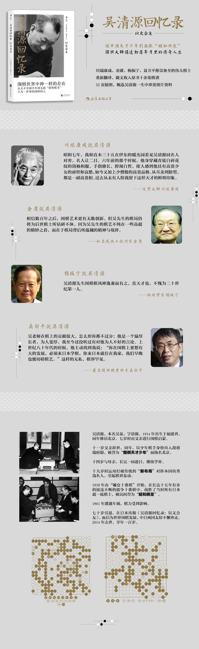 吴清源,本名吴泉,字清源。1914年出生于福建省,同年移居北京。七岁时由父亲进行围棋启蒙。十一岁父亲辞世,同年,以少年棋手身份出入段祺瑞府邸,被誉为“围棋天才少年”而扬名北京。十四岁与母亲、长兄一同赴日,继续学弈。十九岁时运用打破传统的“新布局”对阵本因坊秀哉名人,引起棋界轰动。1939年由“镰仓十番棋”开始,在长达十五年有余的接连不断的擂争十番棋中,战胜了当时所有日本超一流棋士,被民间誉为“昭和棋圣”。1961年遭遇车祸,棋力受到影响。七十岁引退,在日本出版《吴清源回忆录:以文会友》。而后为世界围棋发展、中日两国友好不懈奔走。2014年去世,享年一百岁。