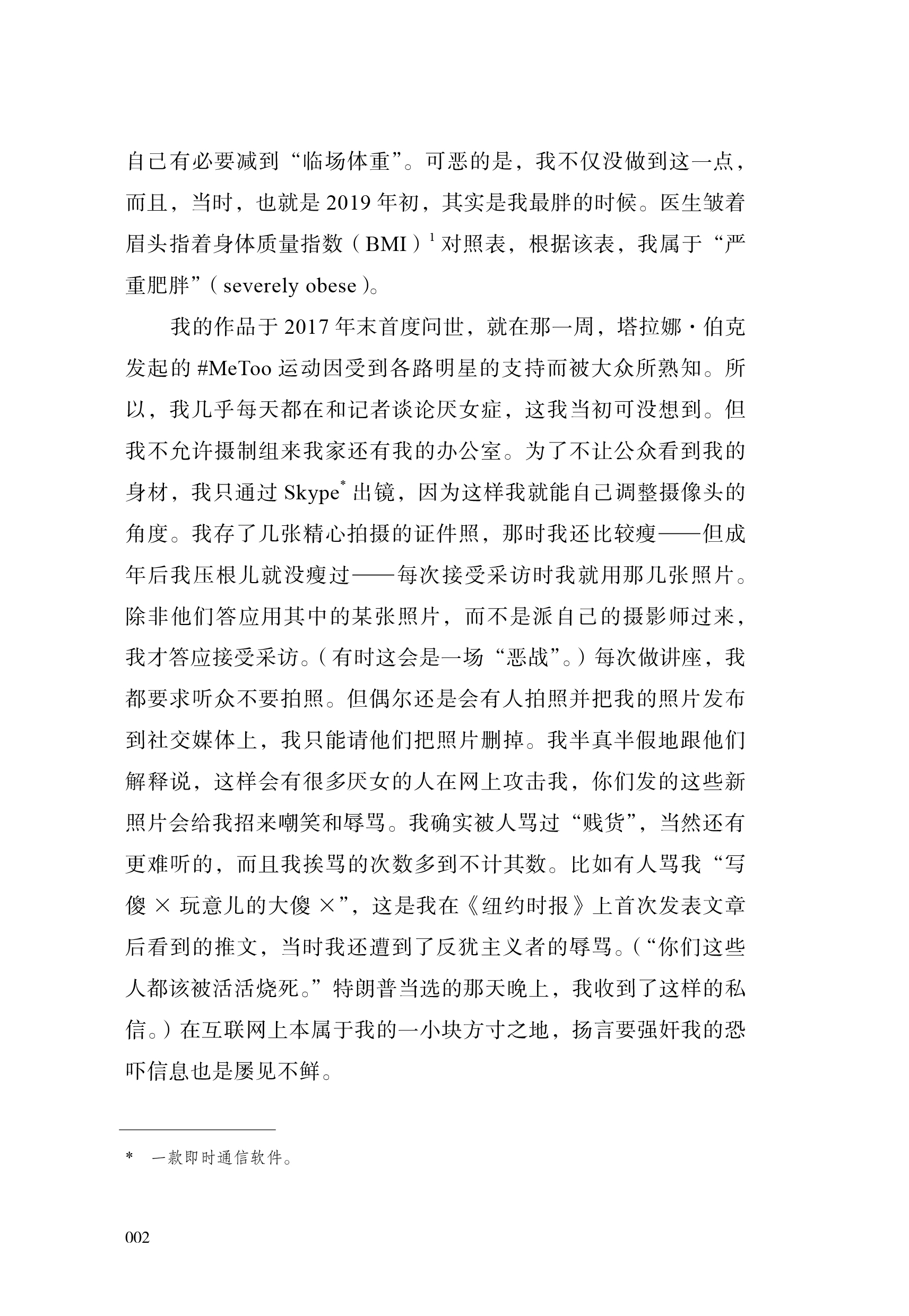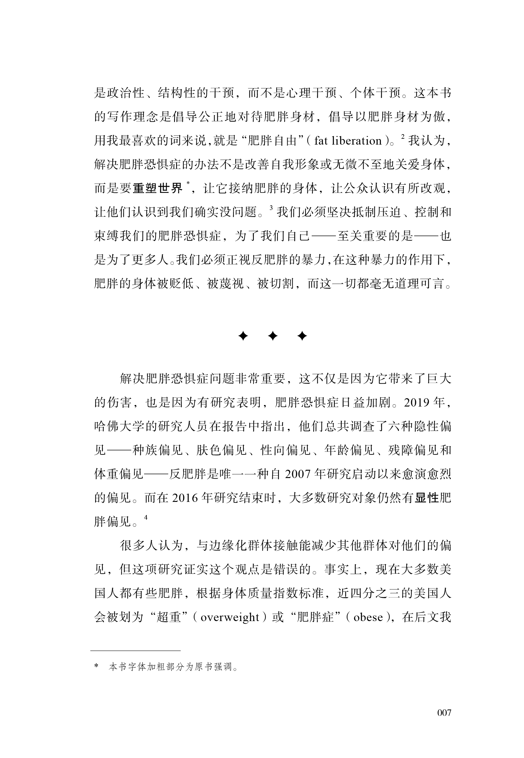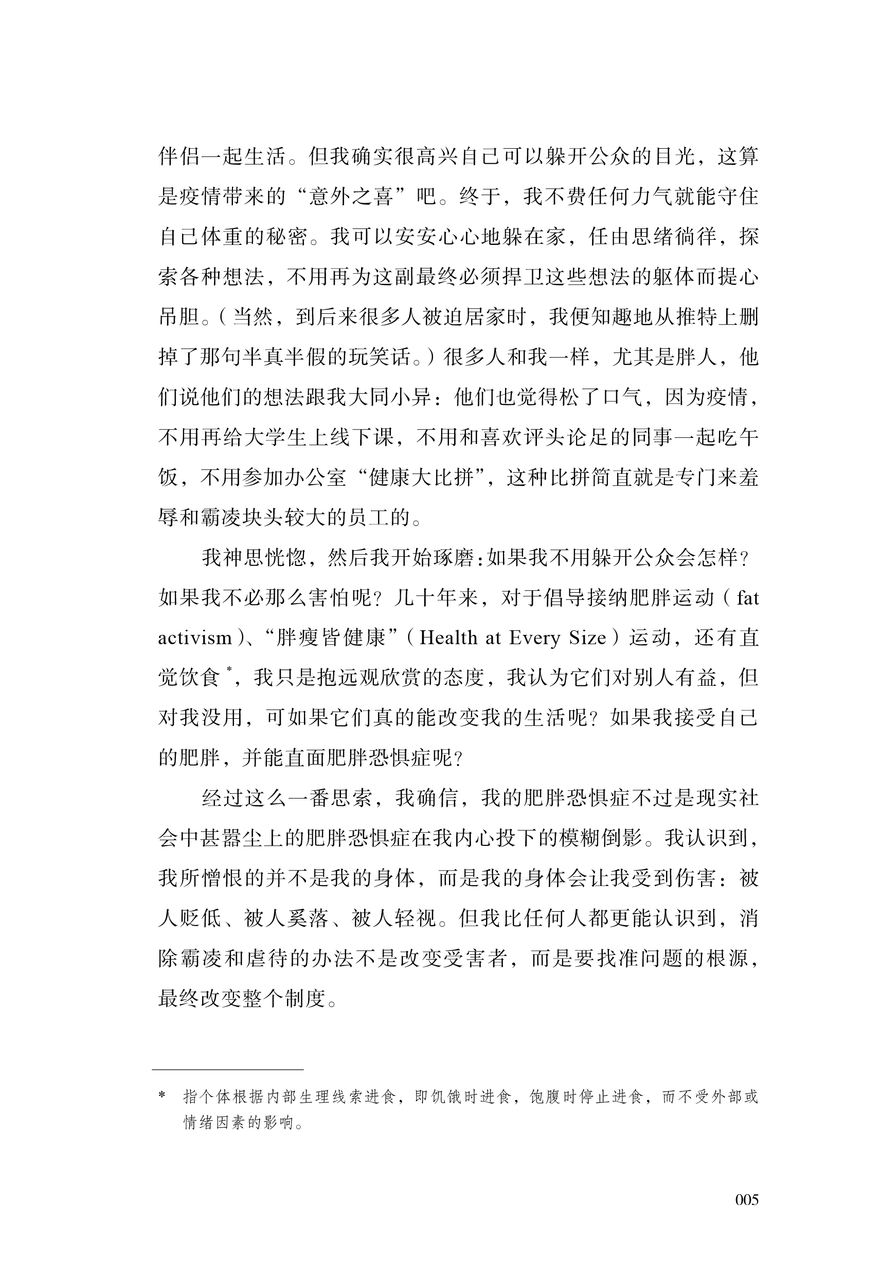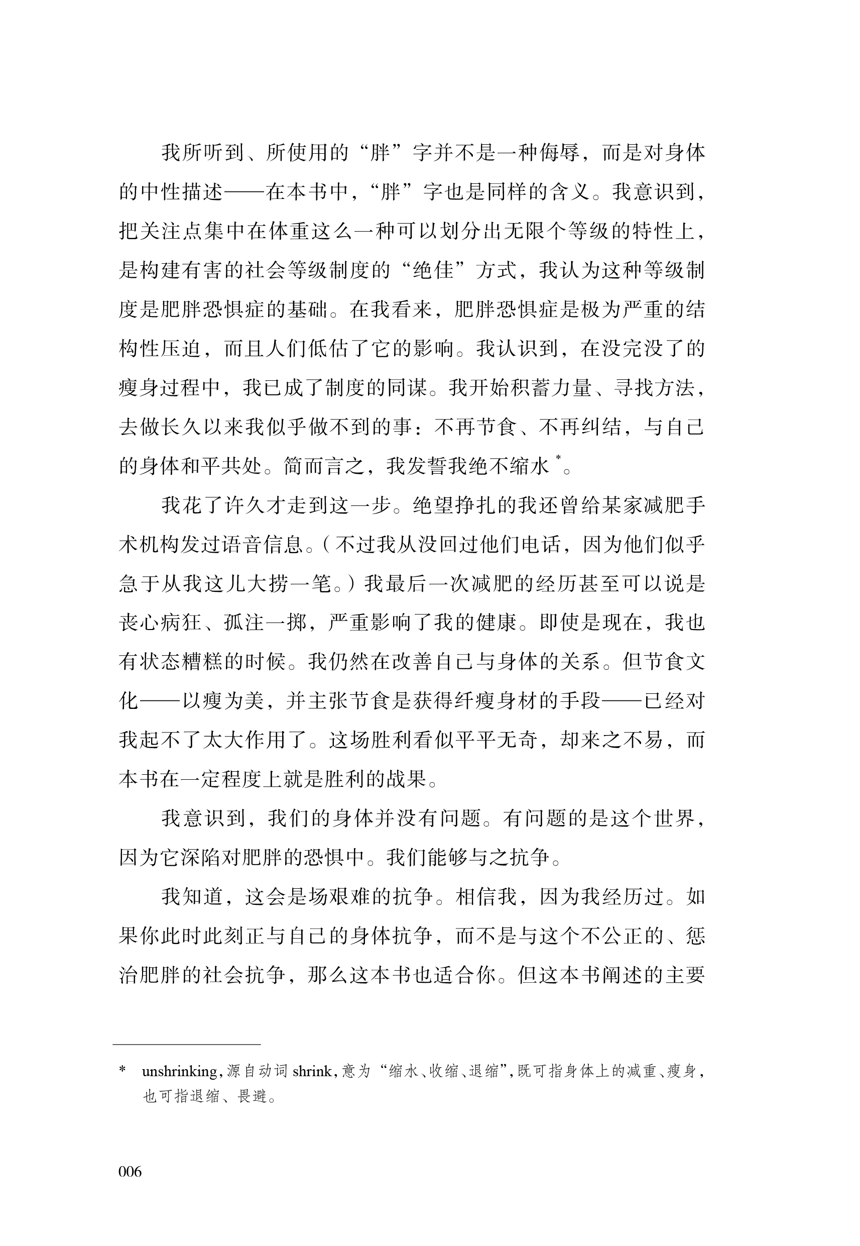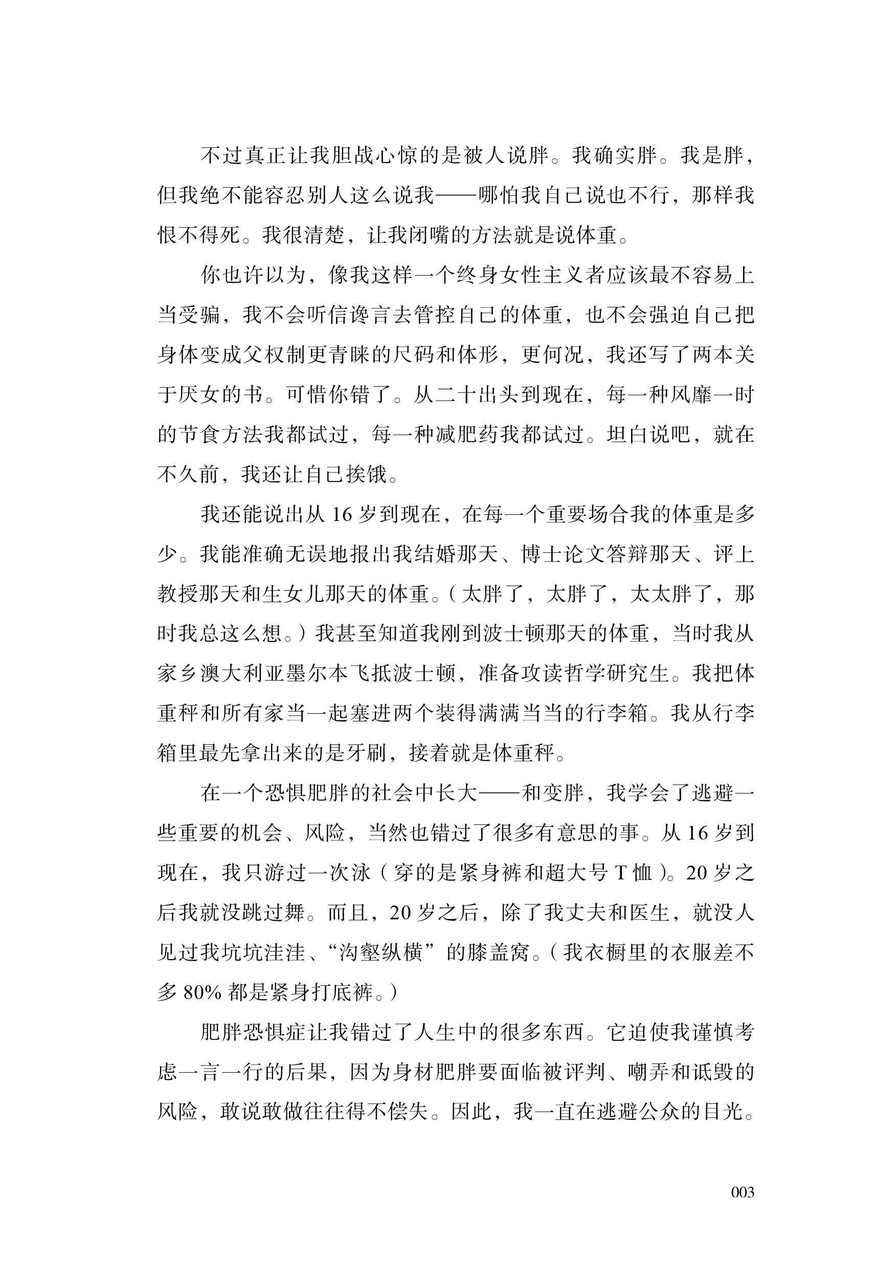3.书中语言浅显易懂、生动风趣,结合大量研究与作者亲身经历,是一本勇敢、坚定、温柔的身体之书,能够引发广泛共鸣。作者勇敢揭开个人过往经历中的伤痕——在节食和暴食之间反复、因身材被羞辱等,揭露肥胖恐惧对自己、对女性、对每个人造成的束缚和伤害,并鼓励读者挣脱“标准”身材的束缚,倾听身体的声音。语言真挚动人又充满鼓舞人心的力量,让所有曾经或仍然被身材焦虑、肥胖恐惧困扰的人都能得到共鸣和慰藉。