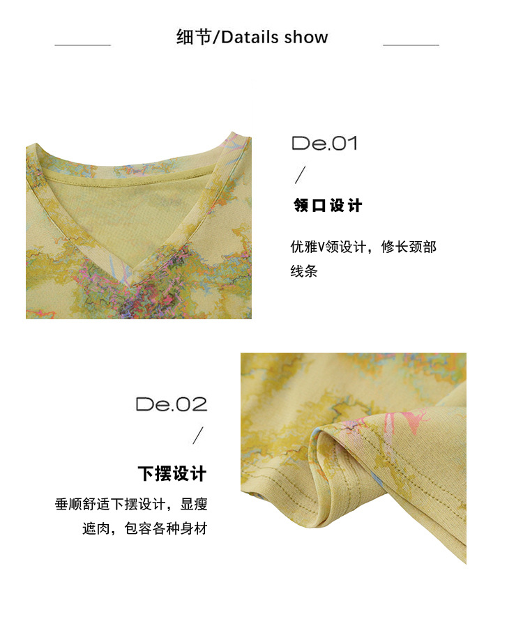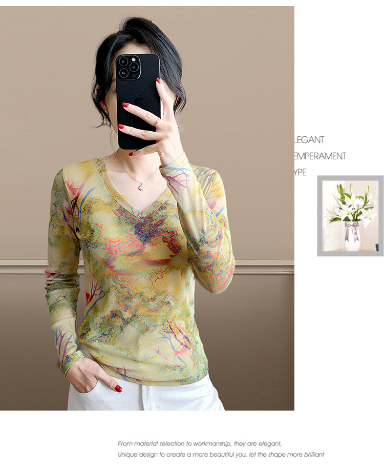 时尚洋气高弹网长袖,印花V领T恤打底衫上衣KQL-A55F8583