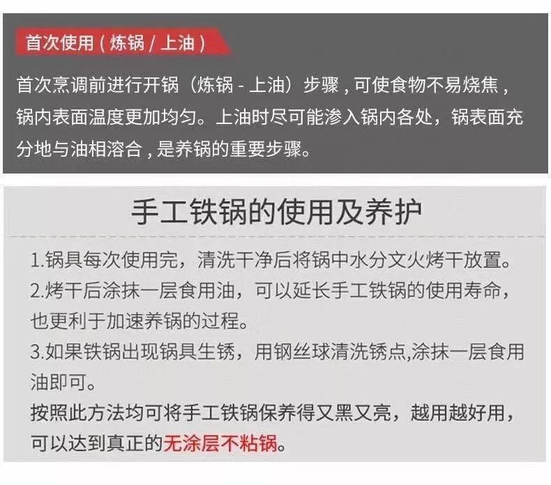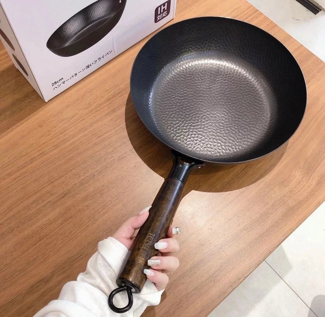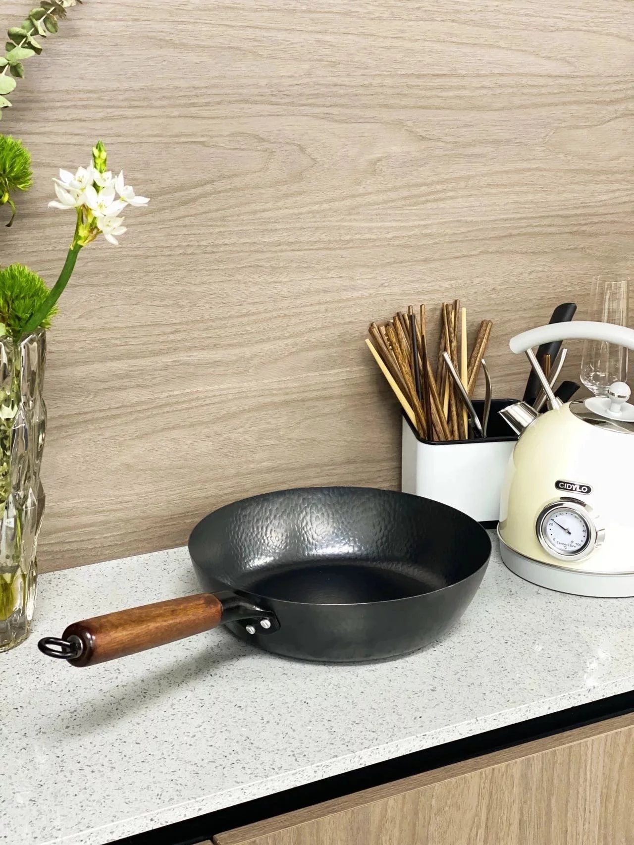 【出口日本铁锅煎炒锅】 这个锅很厉害的!捶打工艺没有任何涂层的铁锅 日本榉木手柄,耐高温,不易开裂、不易吸水 锅身连接处,用不锈钢冲压铆钉固定,三角形的结构,非常牢固。完美解决我们对煎锅、炒锅的的需求!