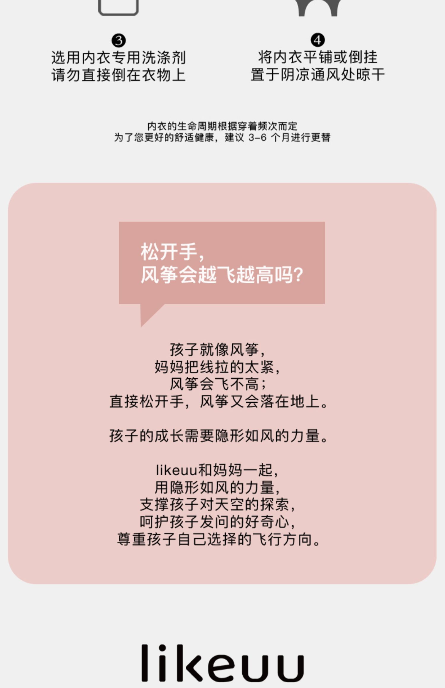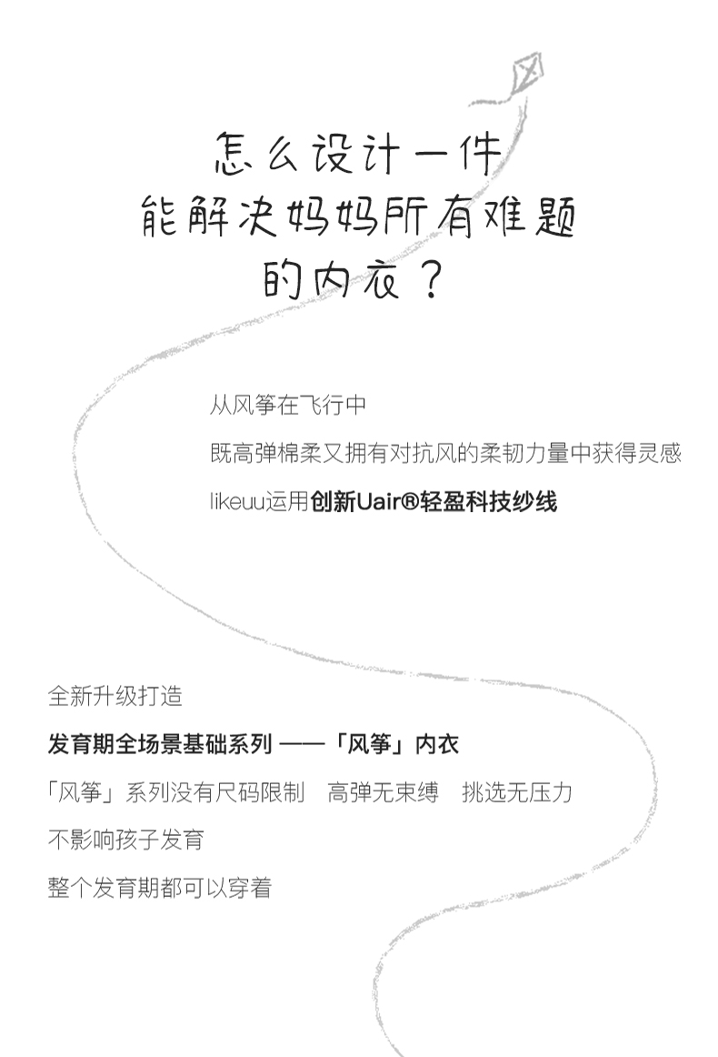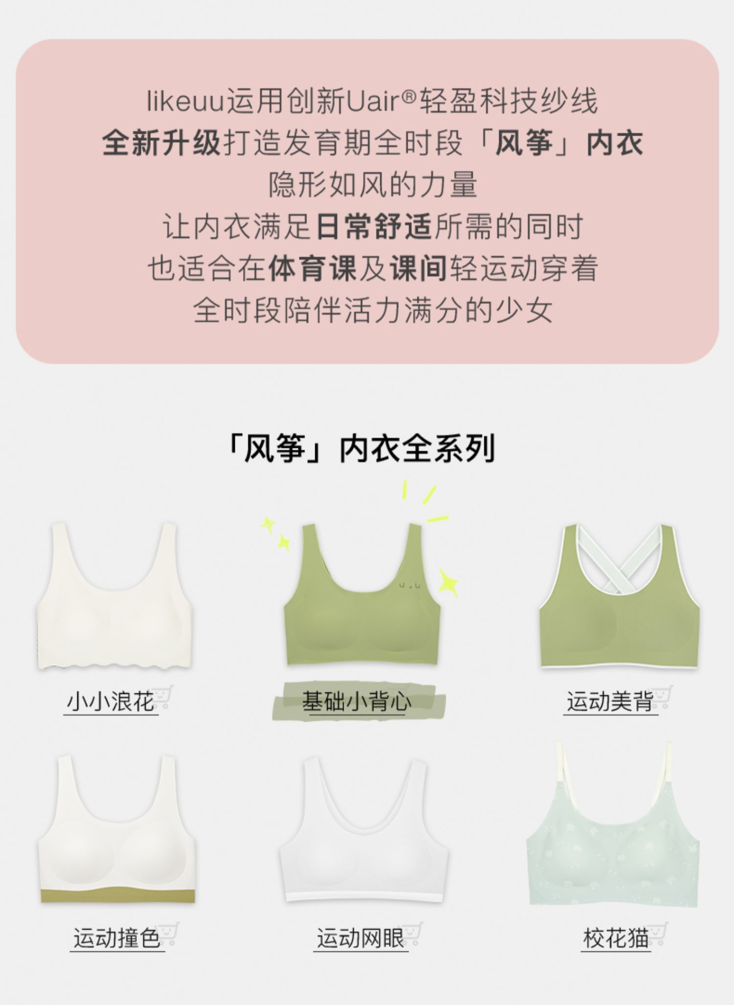 - likeuu是专注于为6~15岁的青少年创造柔软、无束缚的成长体验,以好奇心为灵感的成长发育期贴身衣物品牌。likeuu的产品覆盖内衣、内裤、保暖衣、家居服、运动等品类。