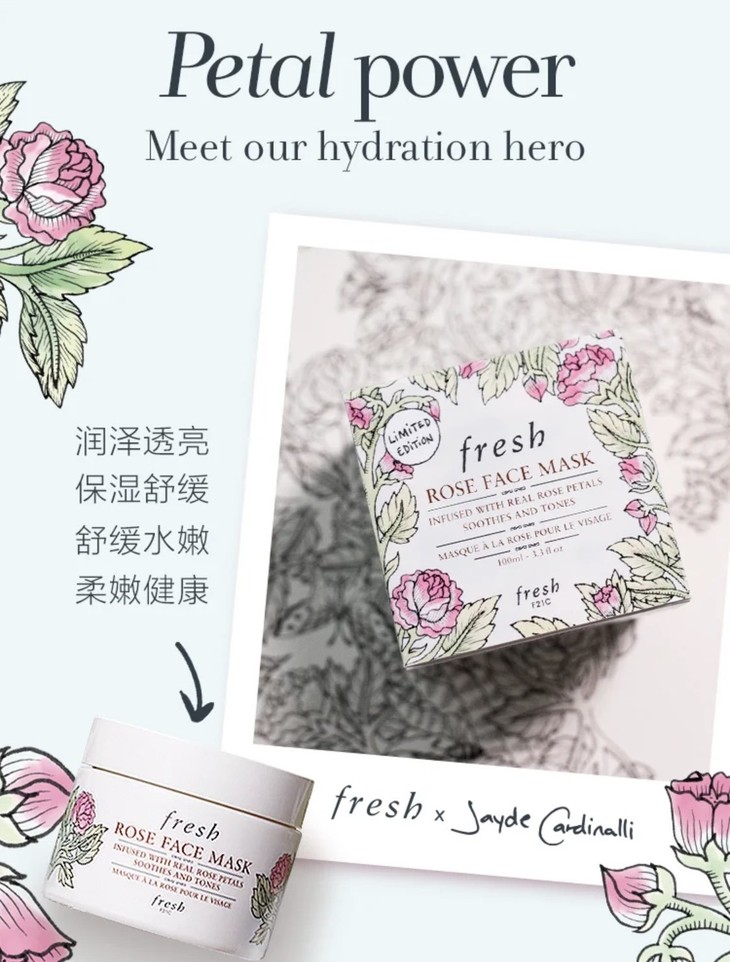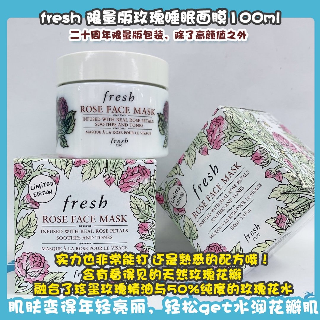 fresh 限量版玫瑰睡眠面膜100ml👍二十周年限量版包装,除了高颜值之外,实力也非常能打👊,还是熟悉的配方哦!含有看得见的天然玫瑰花瓣🌹,融合了珍玺玫瑰精油与50%纯度的玫瑰花水。有效为肌肤深层补湿💦,并舒缓紧张、受压及敏感肌肤,提升肌肤光泽和水分,肌肤变得年轻亮丽,轻松get水润花瓣肌👼。孕妇哺乳期和敏感型皮肤均可使用。