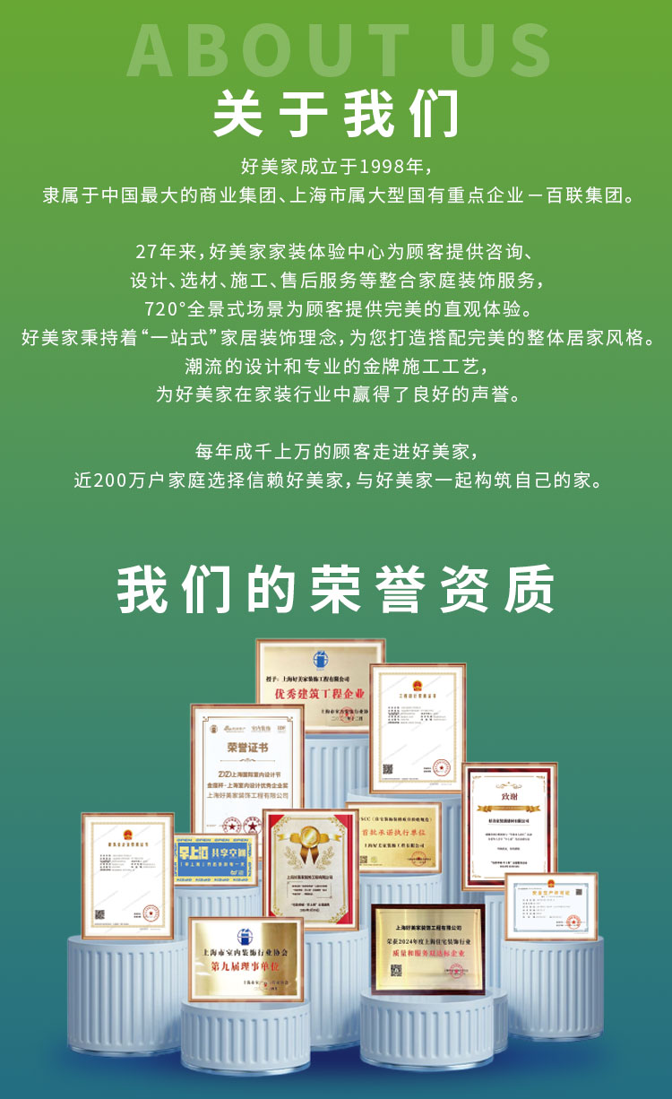 - 好美家装潢中心为顾客提供咨询、设计、陪同选材、施工、售后服务等一条龙家庭装饰服务。