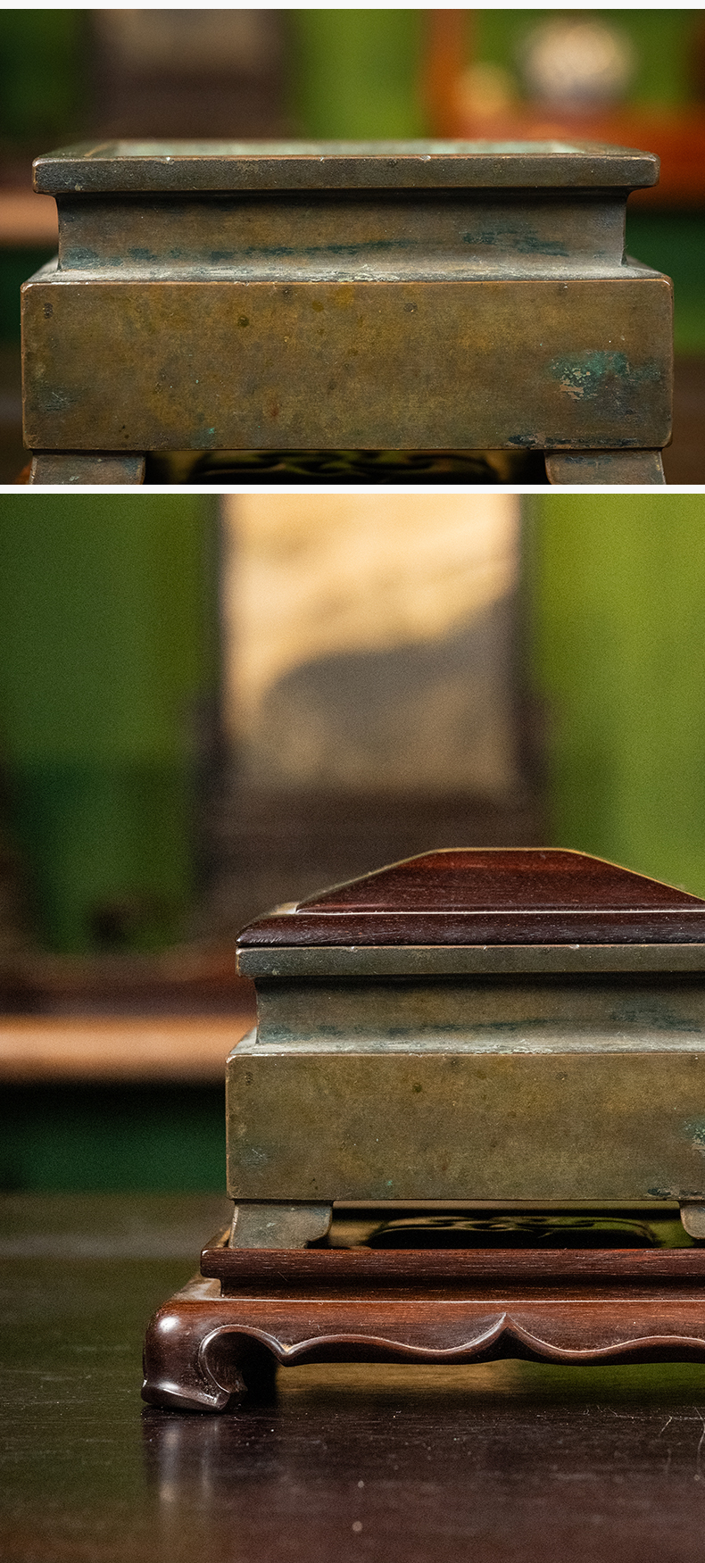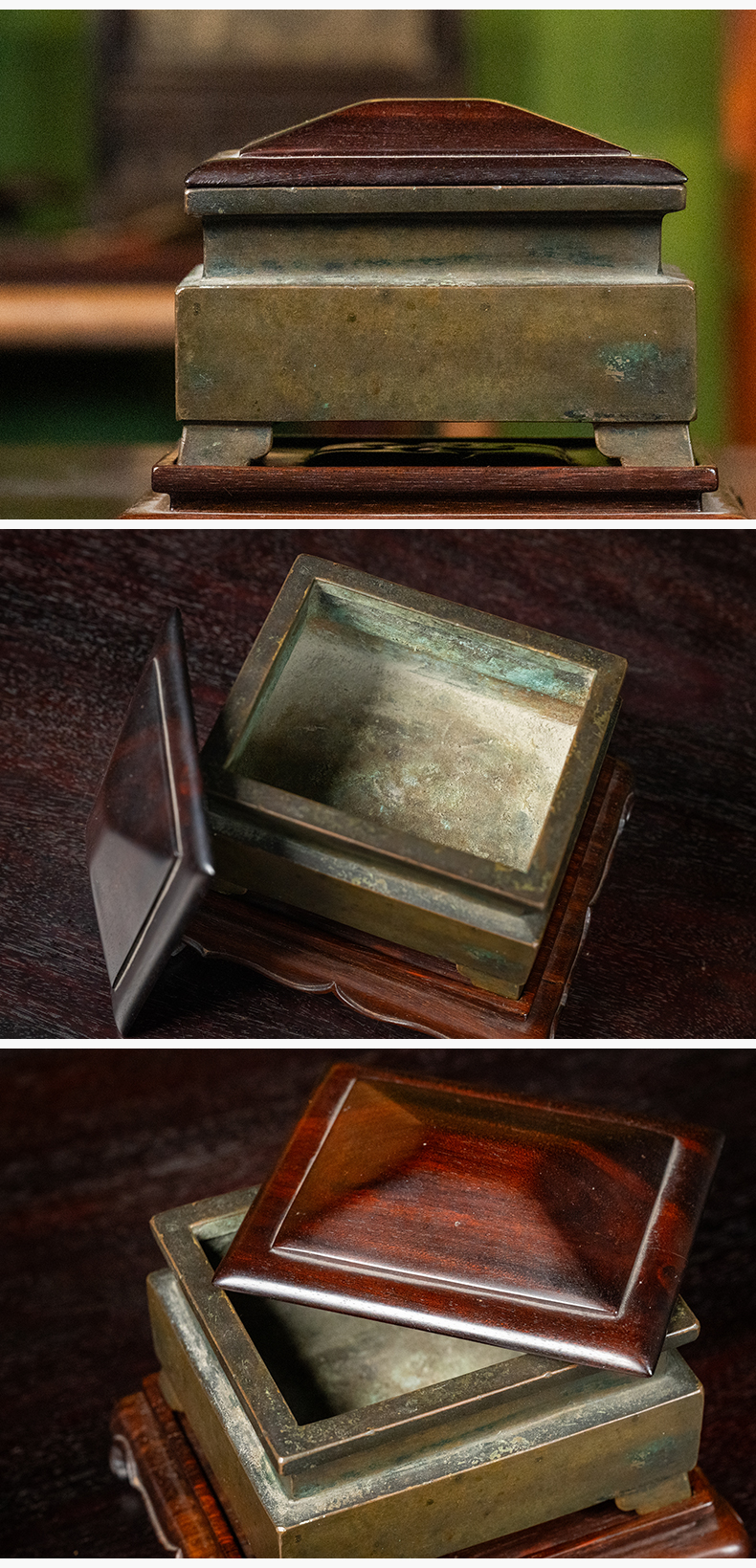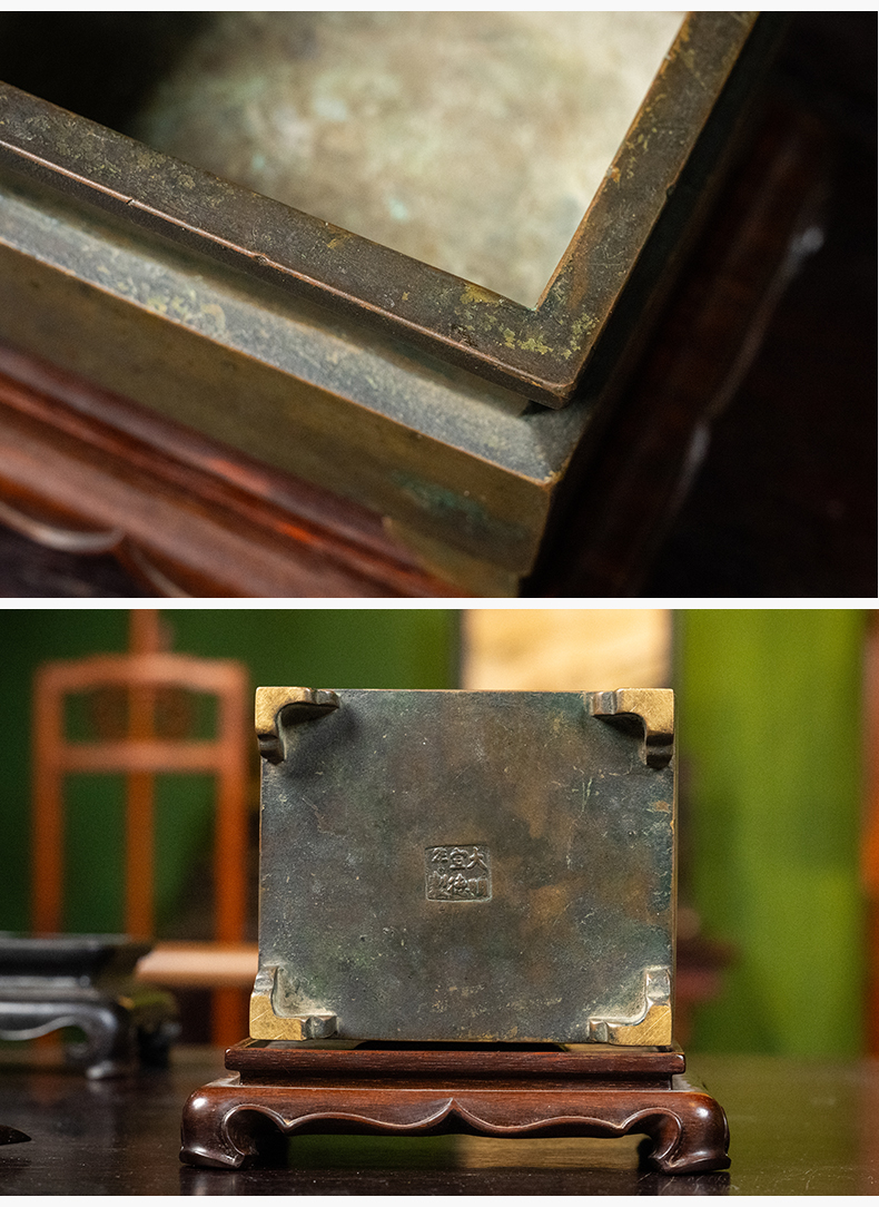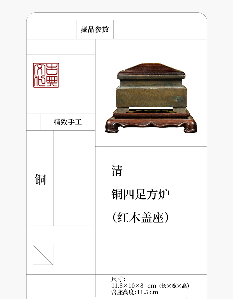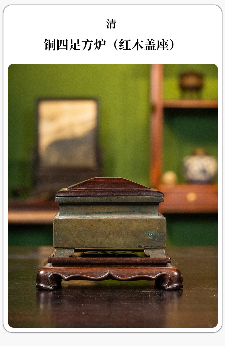 清 铜四足方炉(红木盖座)