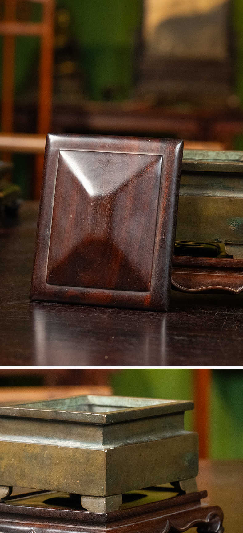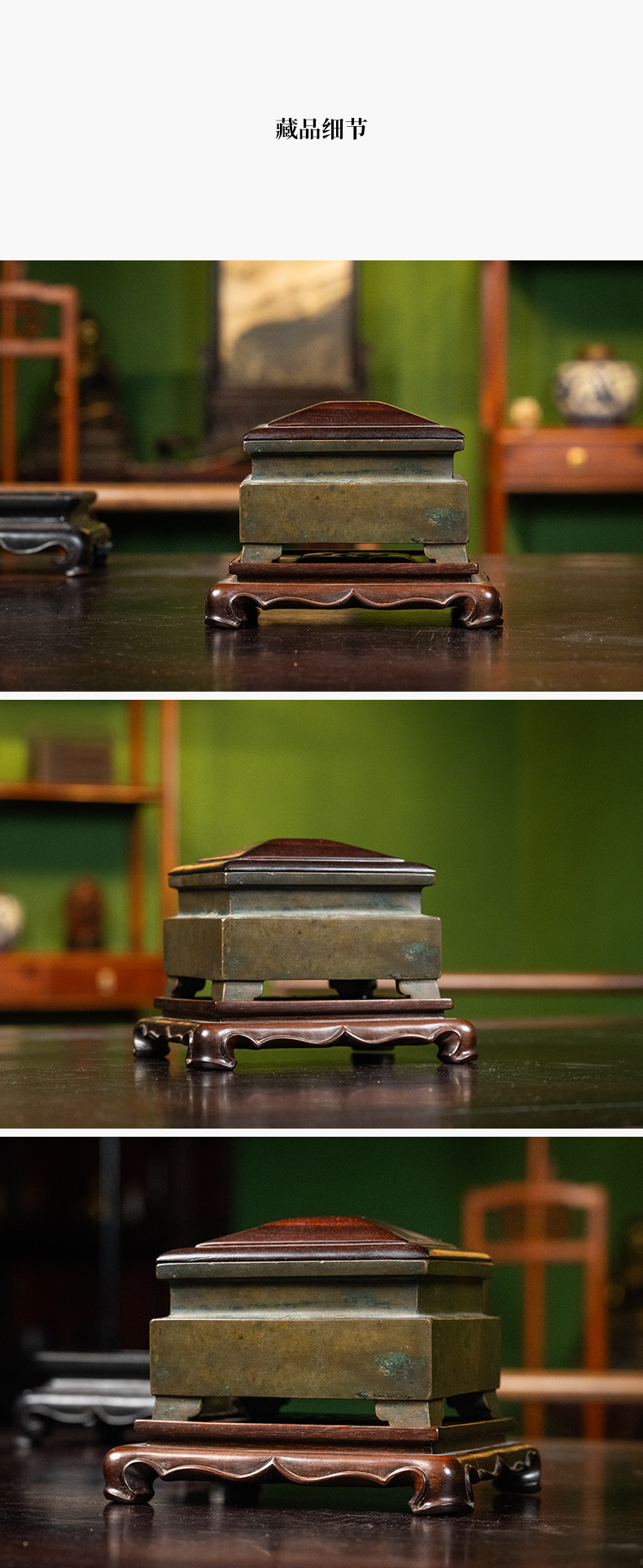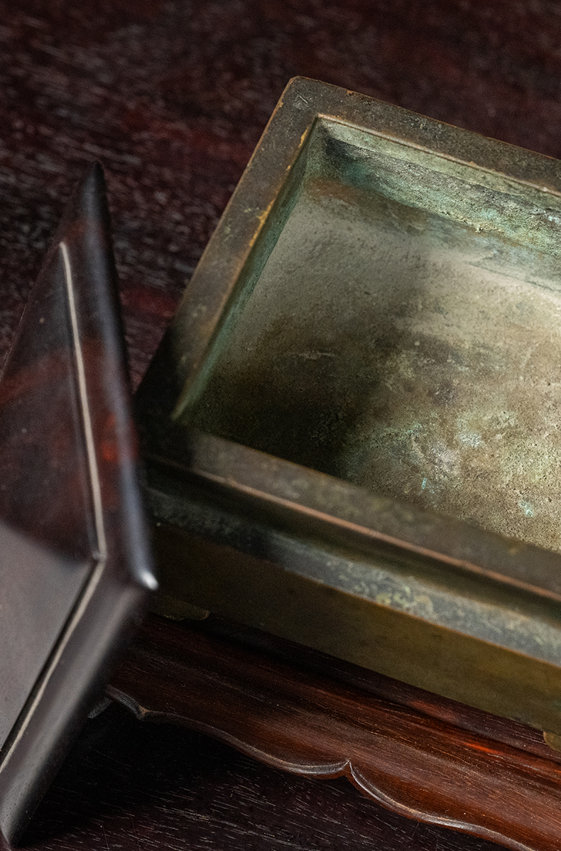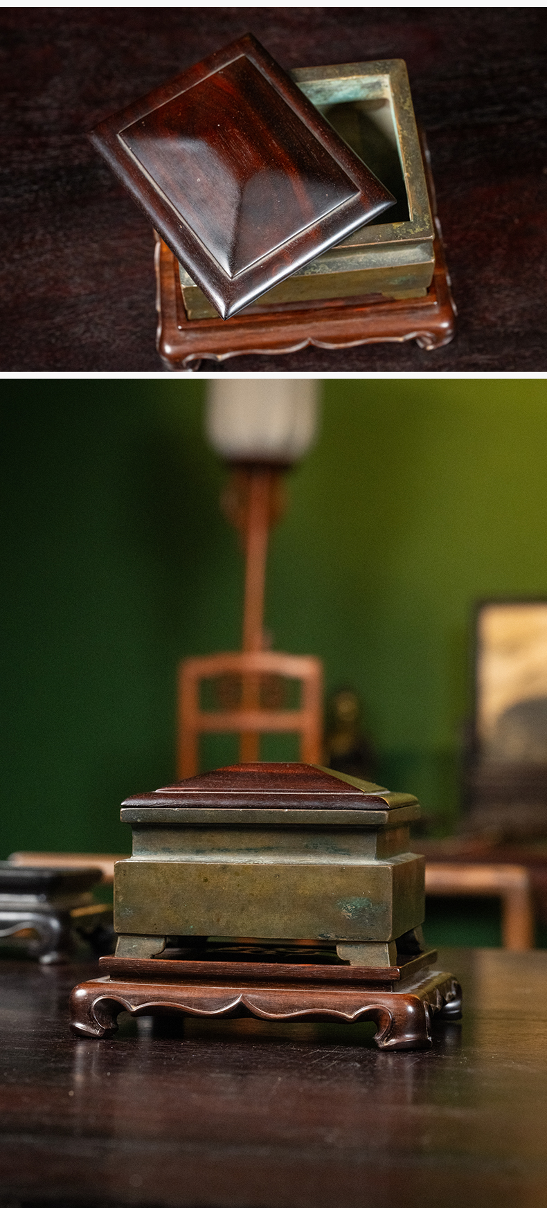 清 铜四足方炉(红木盖座)