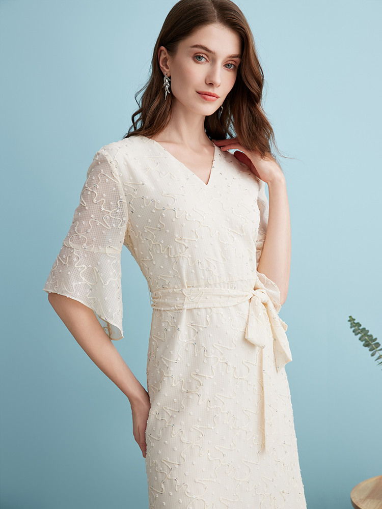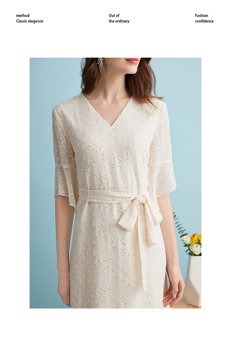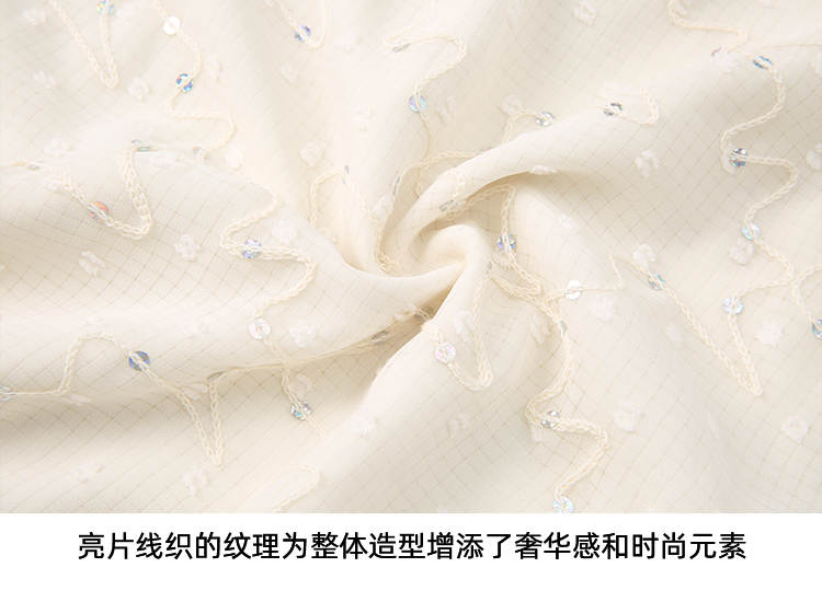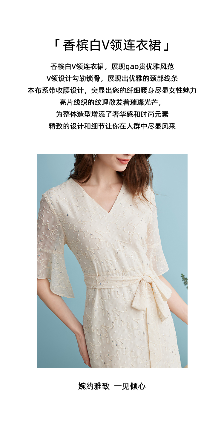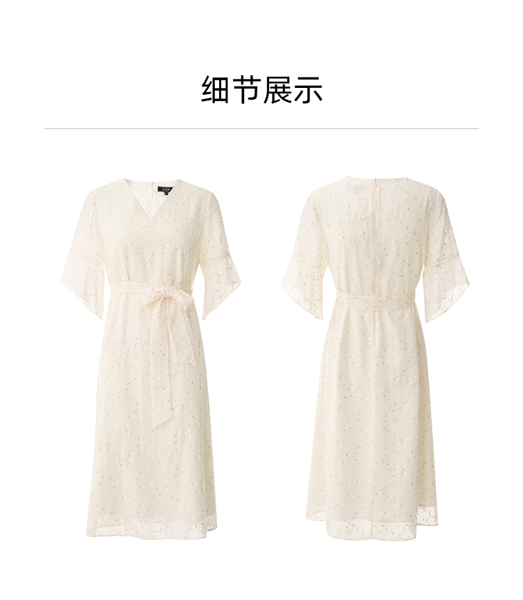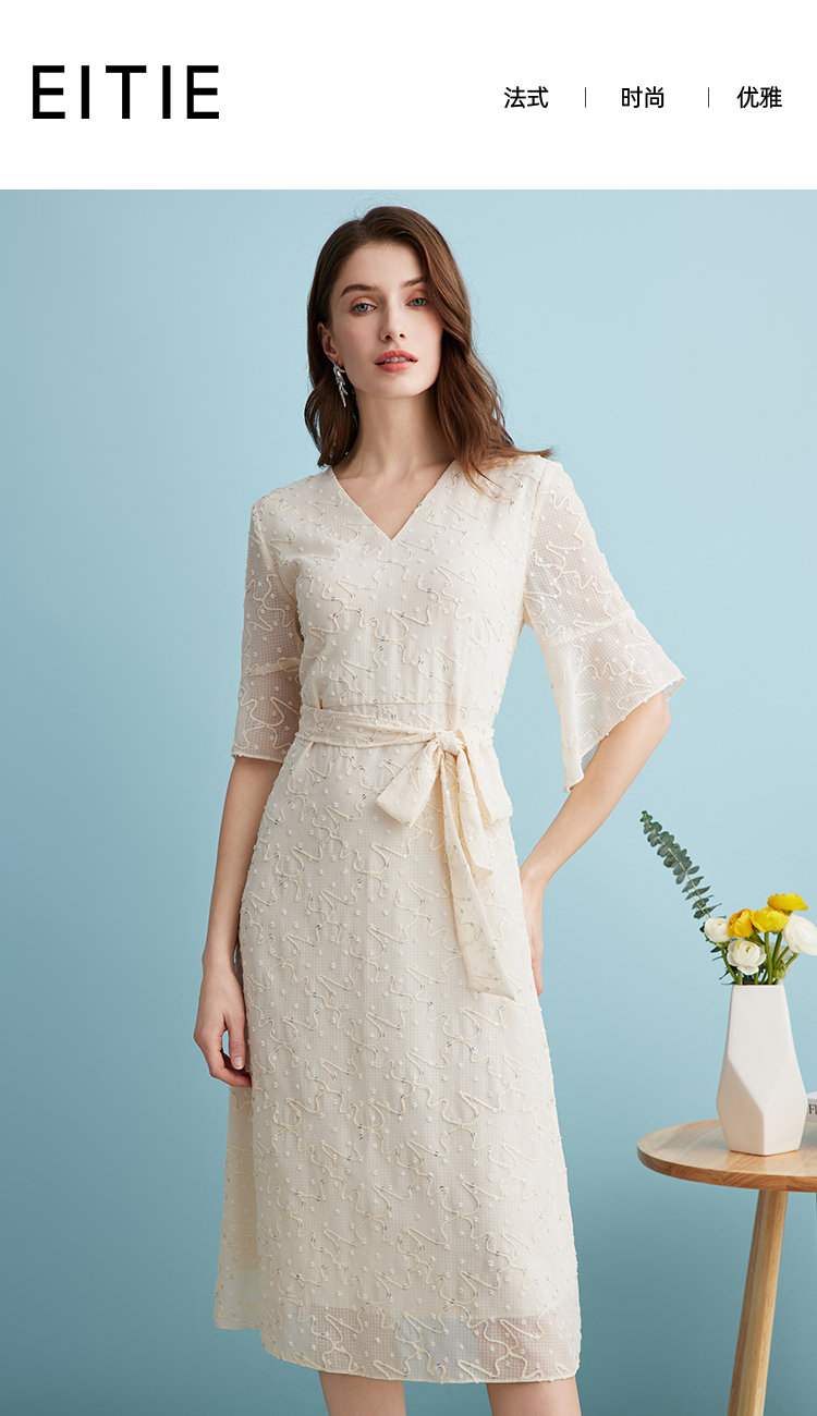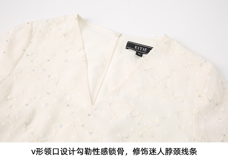 EITIE爱特爱时尚高级感绣花V领显瘦亮片中袖连衣裙夏新款B2407328