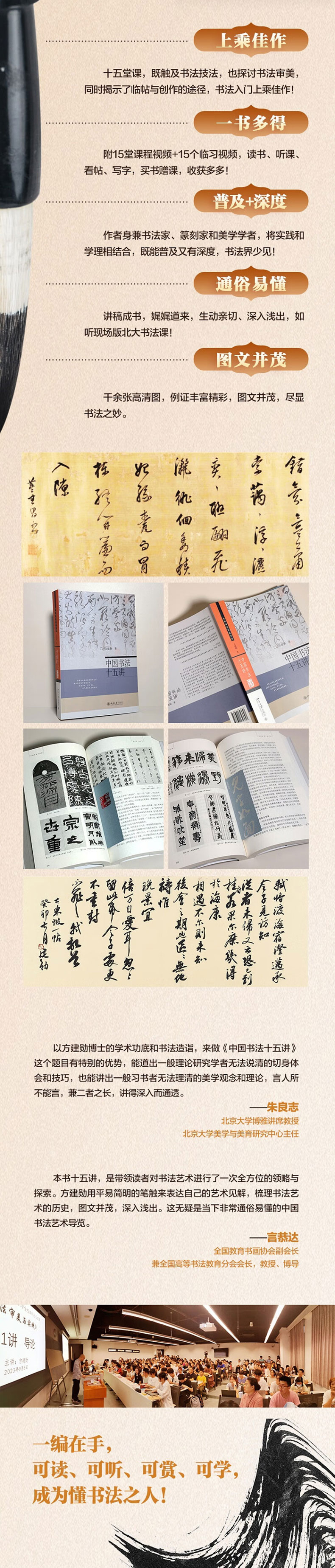 本书是北京大学书法公开课“书法审美与实践”的讲稿整理。这十五讲内容,既触及书法基础的笔法、结字与章法布局等技法层面,也探讨书法的风格、神采与气韵等审美层面,同时还揭示了书法学习经的临帖、创作之方法与途径。作者以亲身、独得的经验和体悟,给出了修习、欣赏书法的秘钥。全书保留了讲稿的现场感、亲和力,行文生动活泼,例证丰富精彩,以超千幅高清图,抉发幽微,尽显书法之妙。每讲附有课程视频,视频以“北大书法公开课”之名流传网,点击过万,颇受广大书法爱好者的喜爱。书后附有专门录制的古代碑帖临习视频,可随之挥毫落纸,可观之悦目赏心。如此,一编在手,可读、可赏、可学、可写,成为懂书法之人。