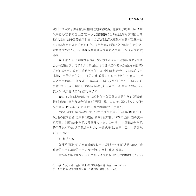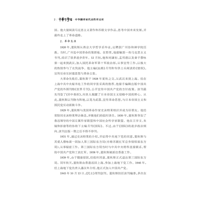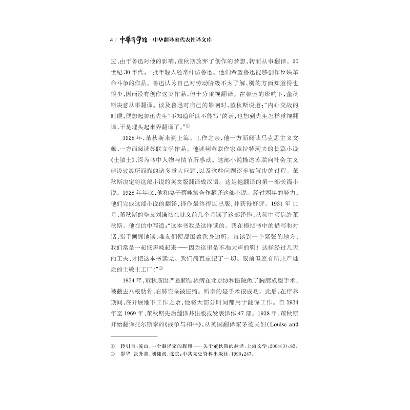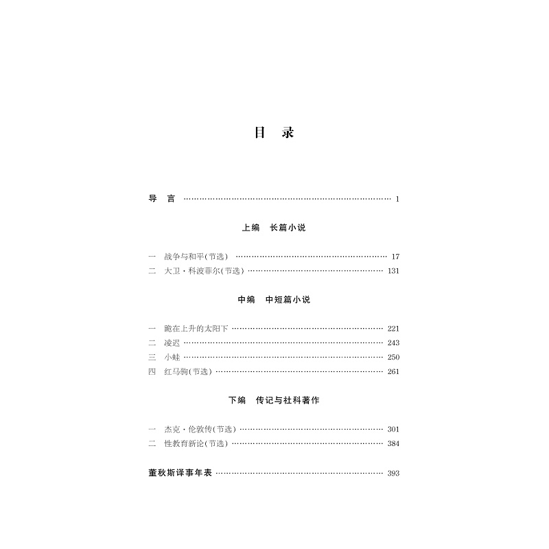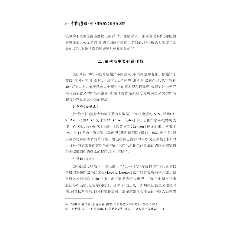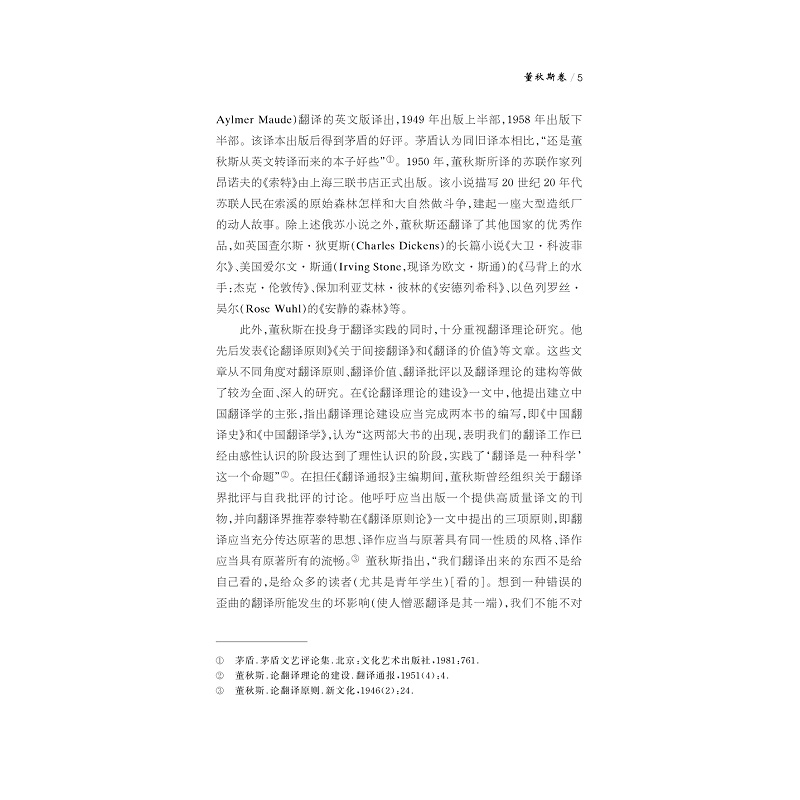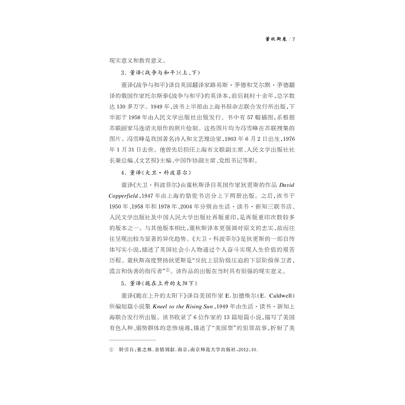 本书为“中华译学馆·中华翻译家代表性译文库”之一。本书为董秋斯卷。本书主要分为三大部分:前言、代表性译文和译事年表。前言包括董秋斯生平介绍、董秋斯翻译思想、对董秋斯的相关研究、代表性译文选择的原因、对所选译文的介绍与研究等。第二部分为董秋斯代表性译文,分为三种,即:汉译英语小说节选、汉译英语短篇小说、汉译英语散文(回忆录)。第三部分为董秋斯译事年表,把董秋斯所有的翻译实践活动按时间顺序排列,包括年代与发表渠道。