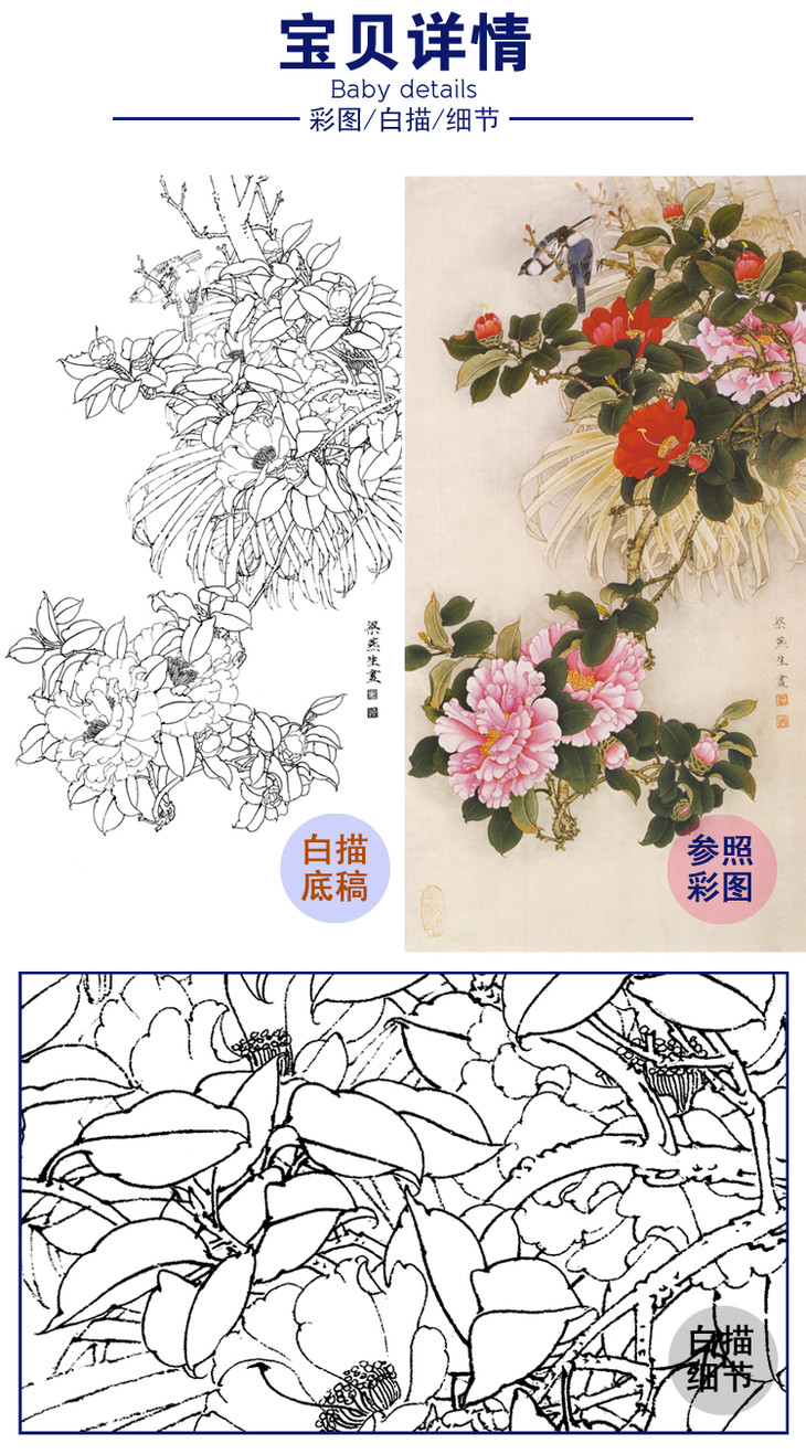 竖幅工笔花鸟白描底稿-梁燕生-山茶花-多种白描尺寸可选-A122