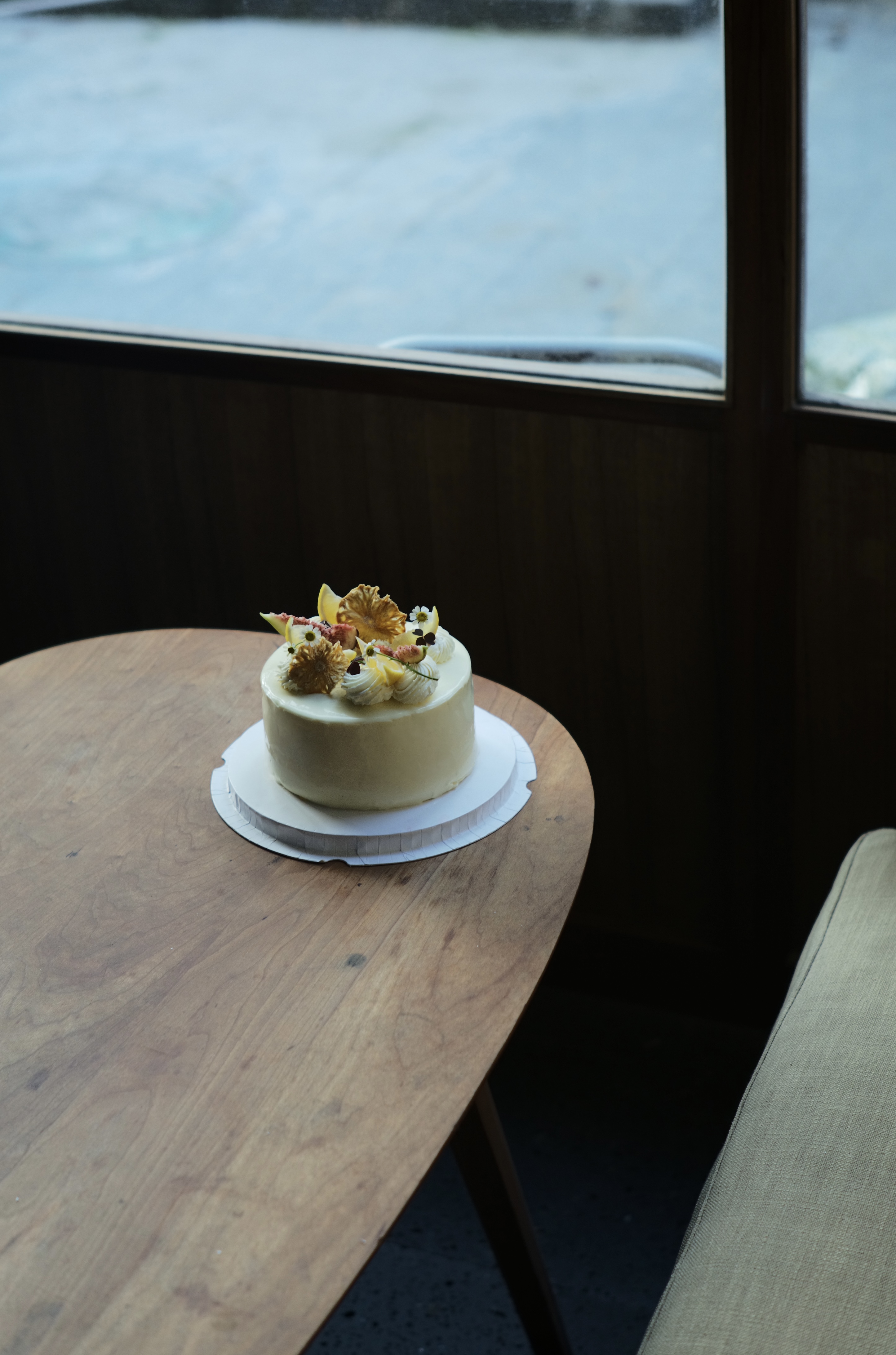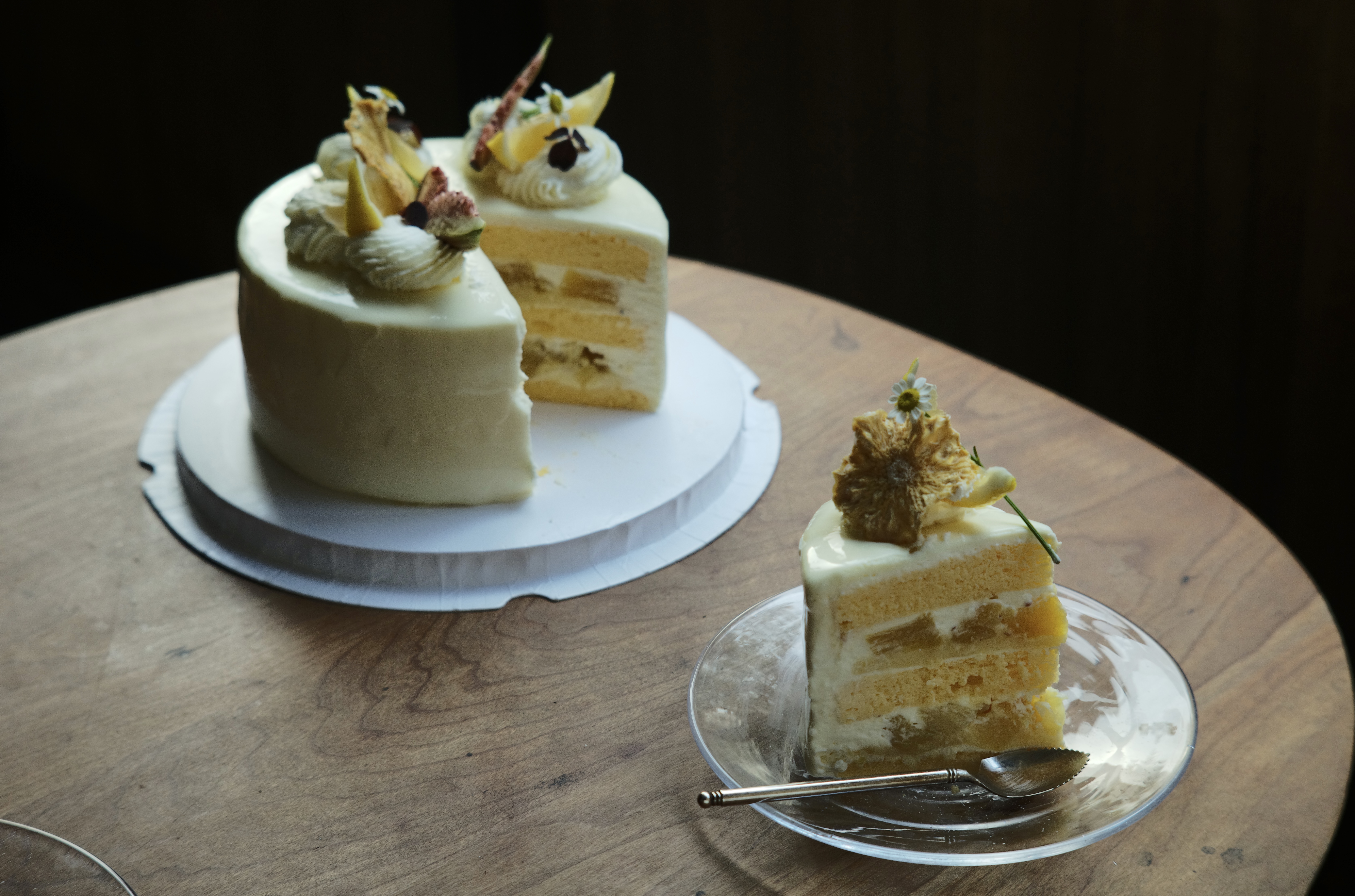 新鲜制作的柔软但有骨架的戚风胚,承托加入了奶油奶酪的香缇奶油与新鲜凤梨果肉。乳酪的少许咸味、两种不同维度的酸与香甜交织融合。乳酪使得原本轻盈的香缇奶油变得更为顺滑厚重,与果肉较韧的凤梨相得益彰。