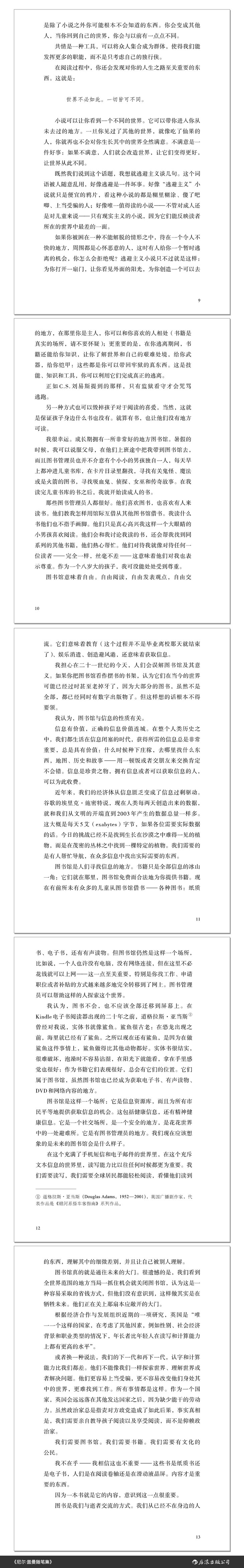 “这本书并不是《尼尔·盖曼非虚构全集》。相反,这是一堆形形色色的演讲和文章、前言与随笔。有的严肃,有的肤浅,有的真诚,有的我写下来是为了让人倾听。你没有义务全部阅读,也没有义务按照任何特定顺序阅读。我把它们排列成这样的顺序,感觉有某种道理——开头主要是演讲之类;结尾则是更私人、发自内心的作品;各种乱七八糟的作品、文章与说明,有关文学、电影、漫画和音乐,城市与生活,放在中间。”