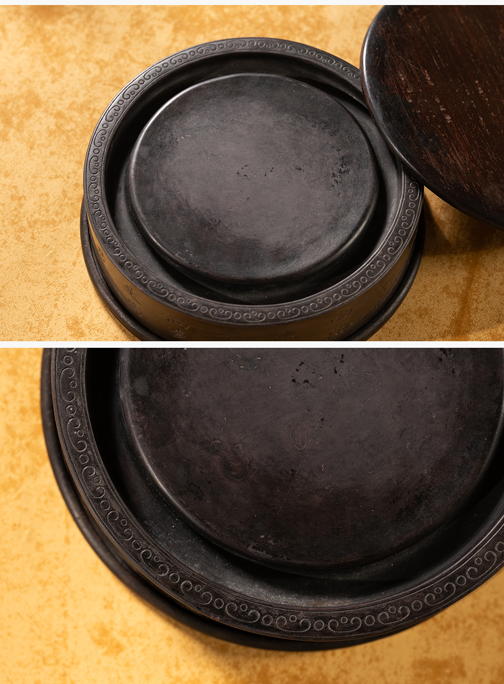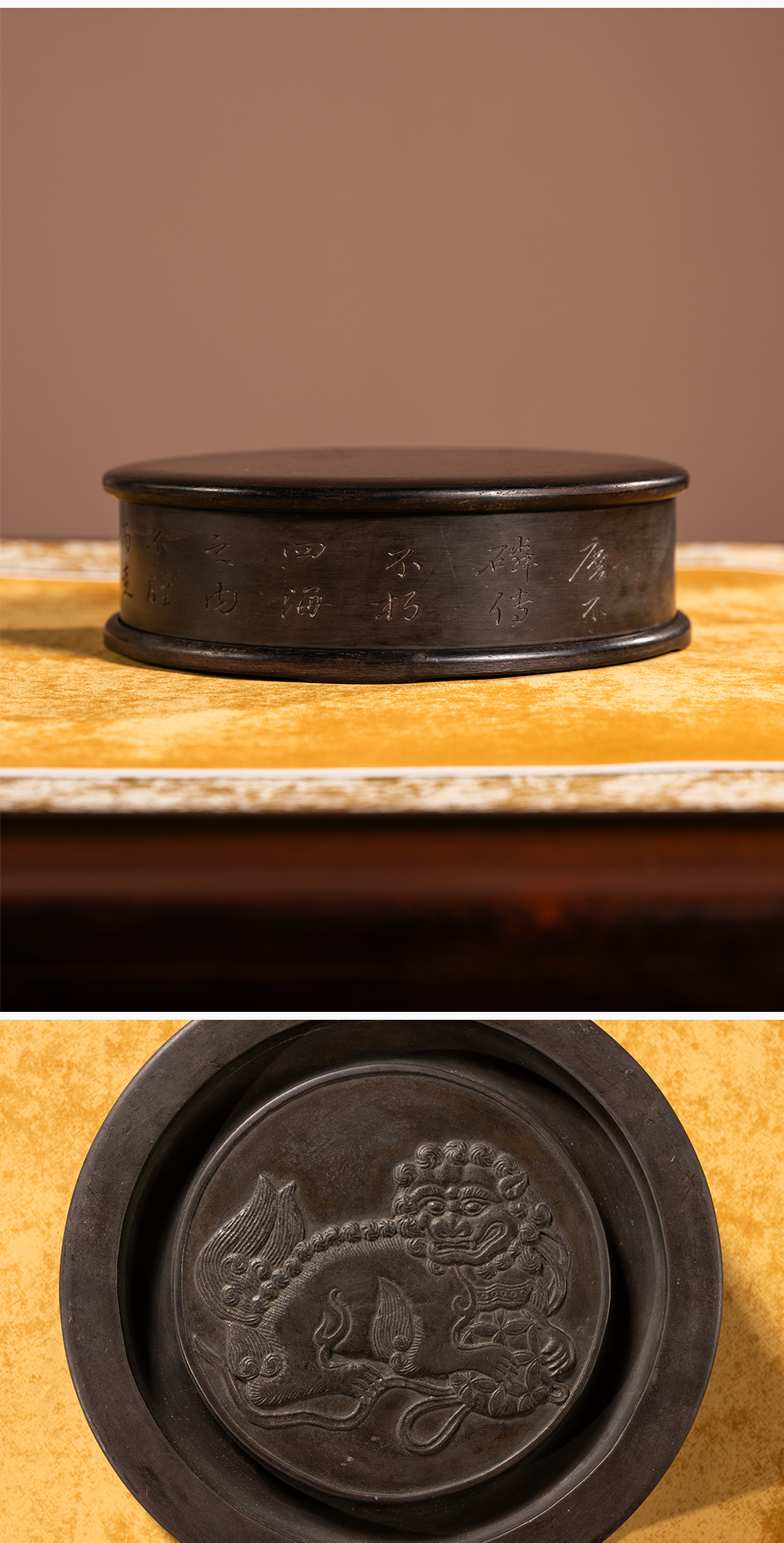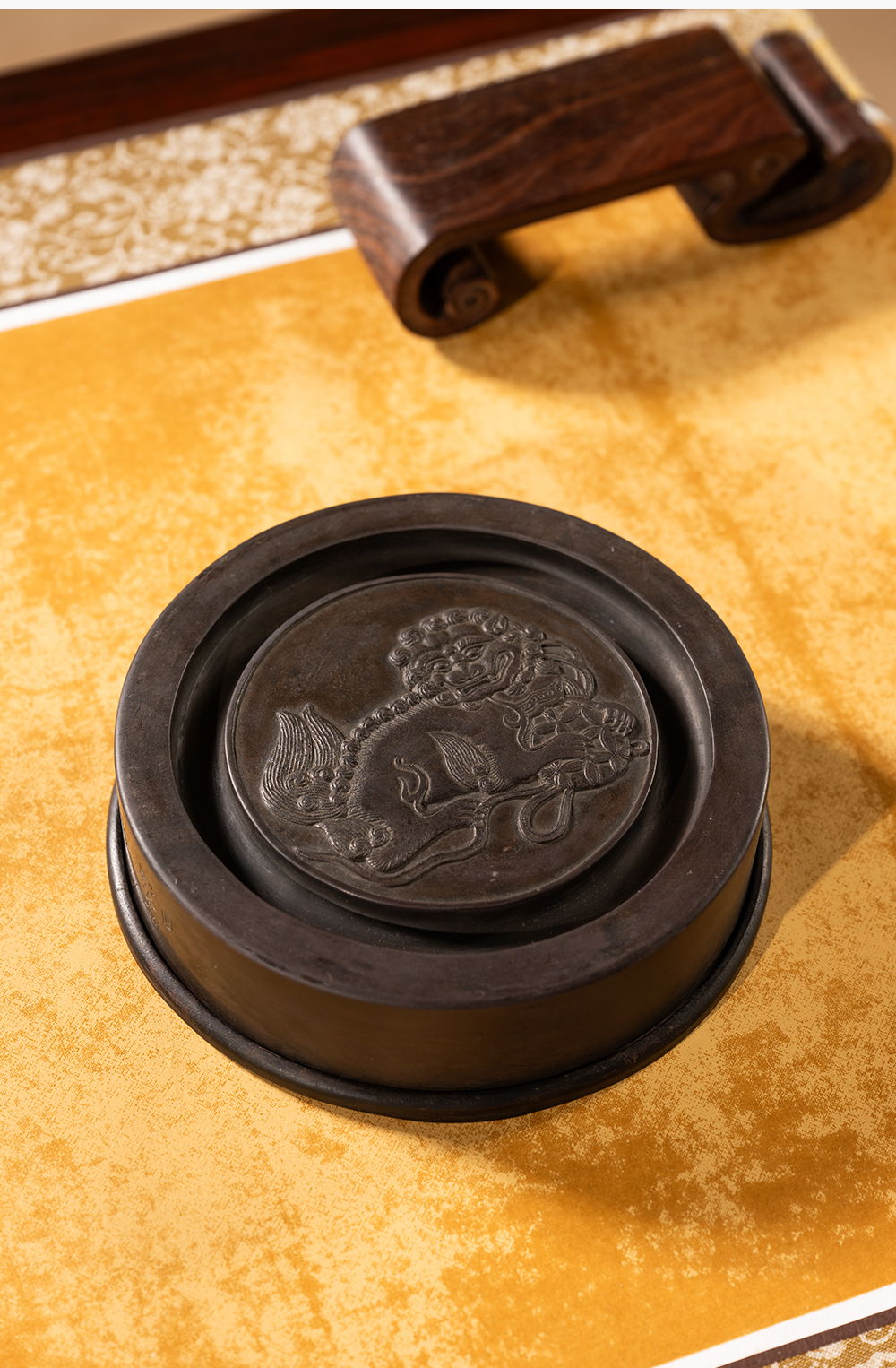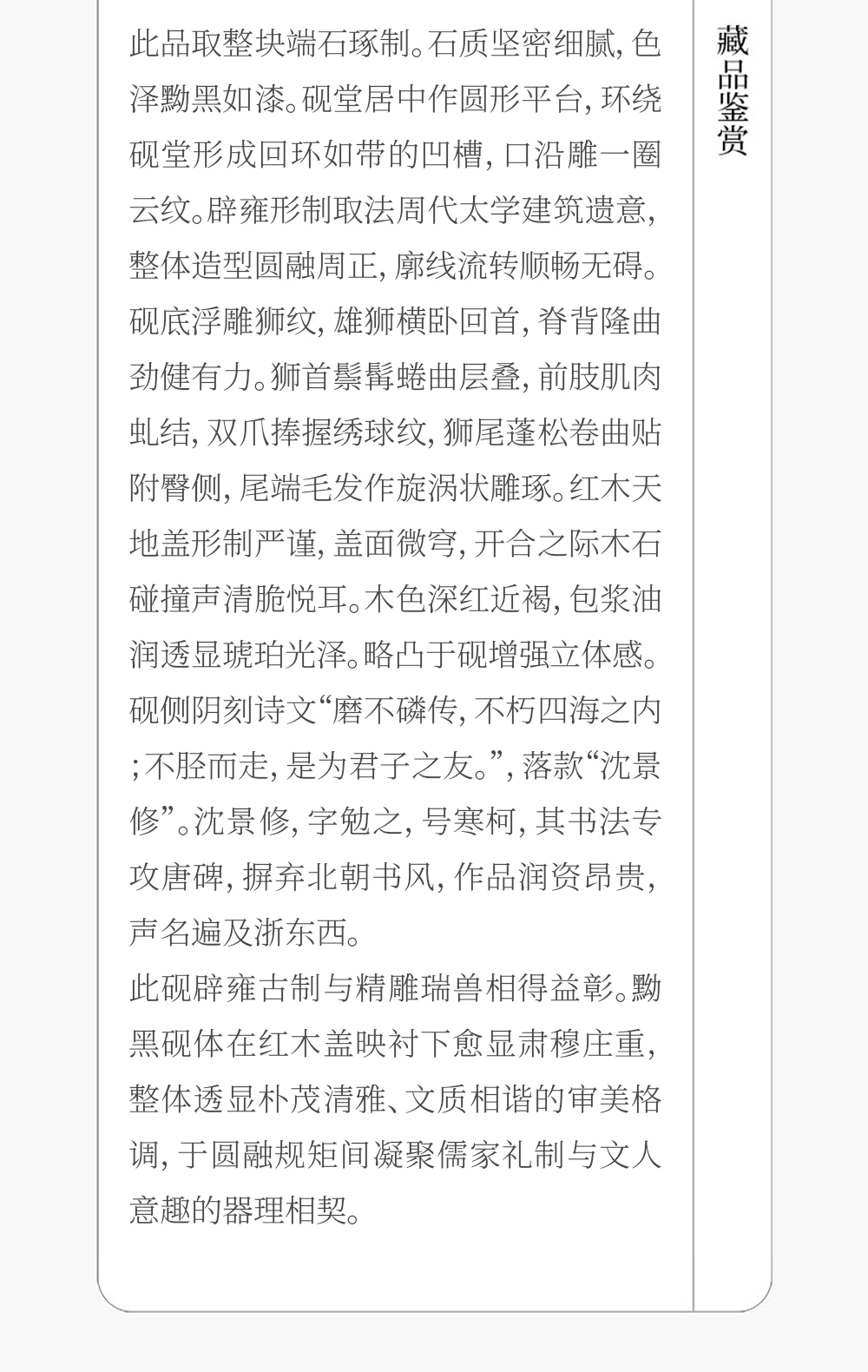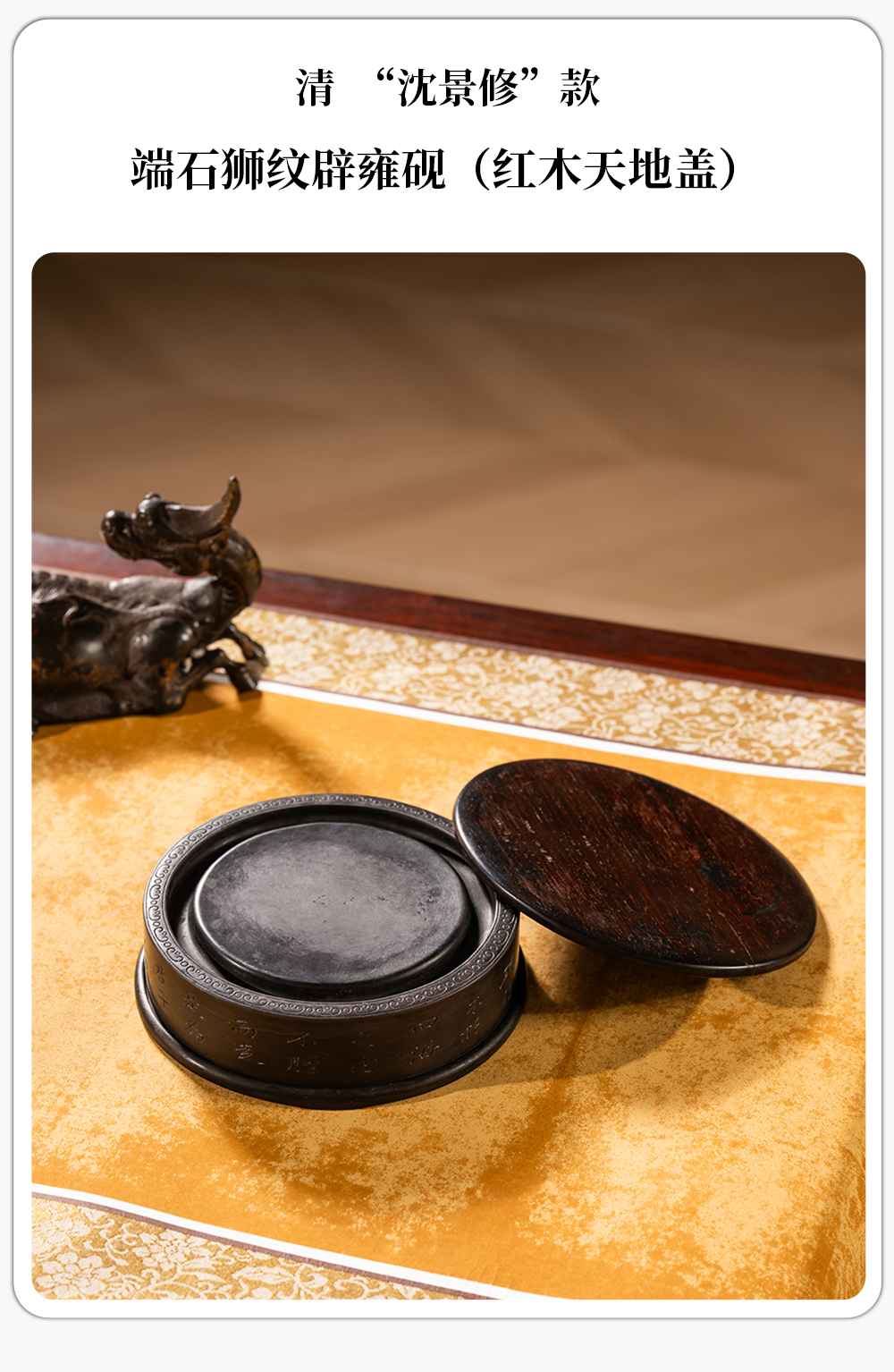 清 沈景修款端石狮纹辟雍砚(红木天地盖)