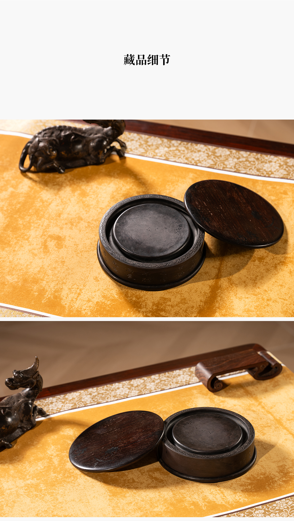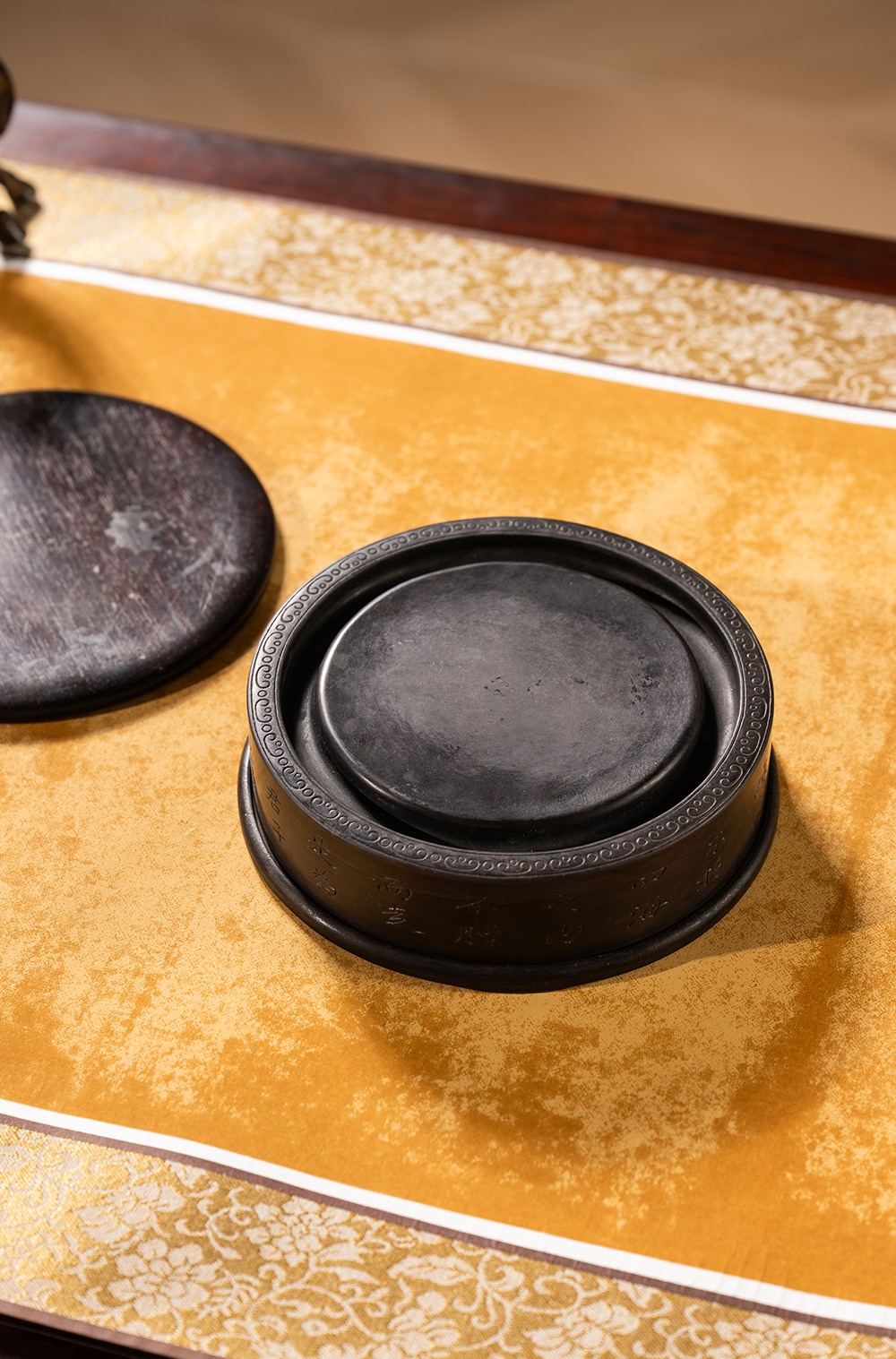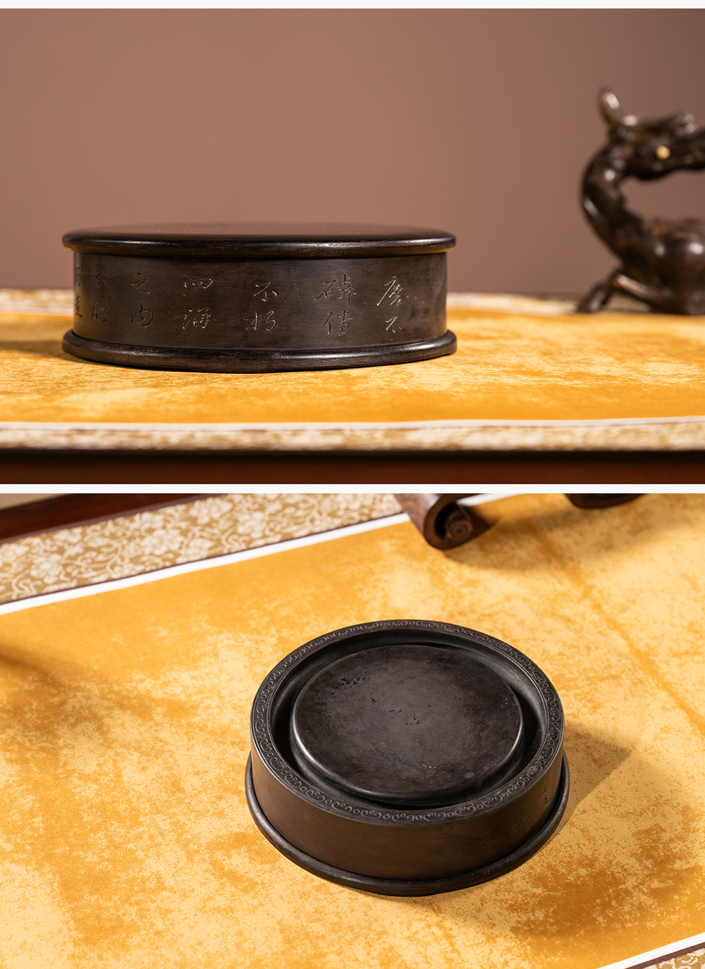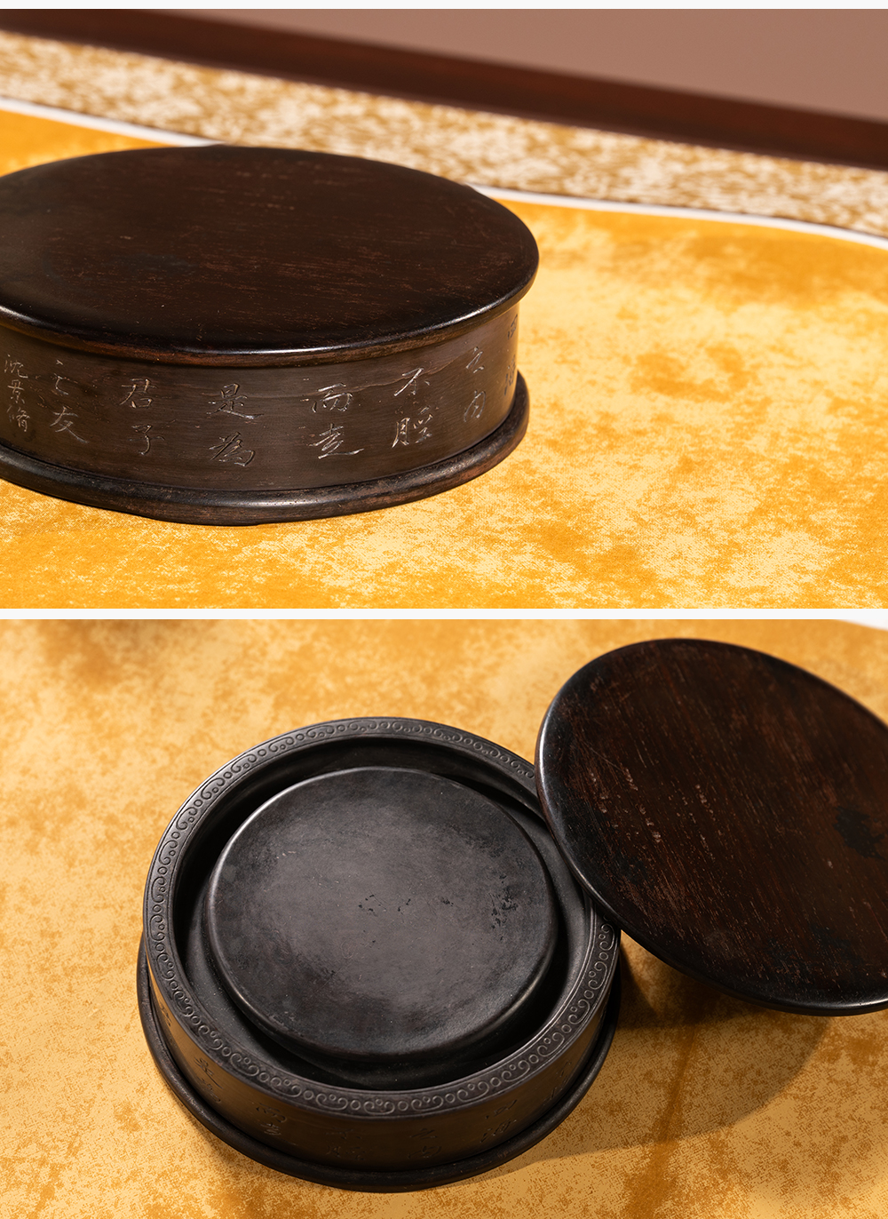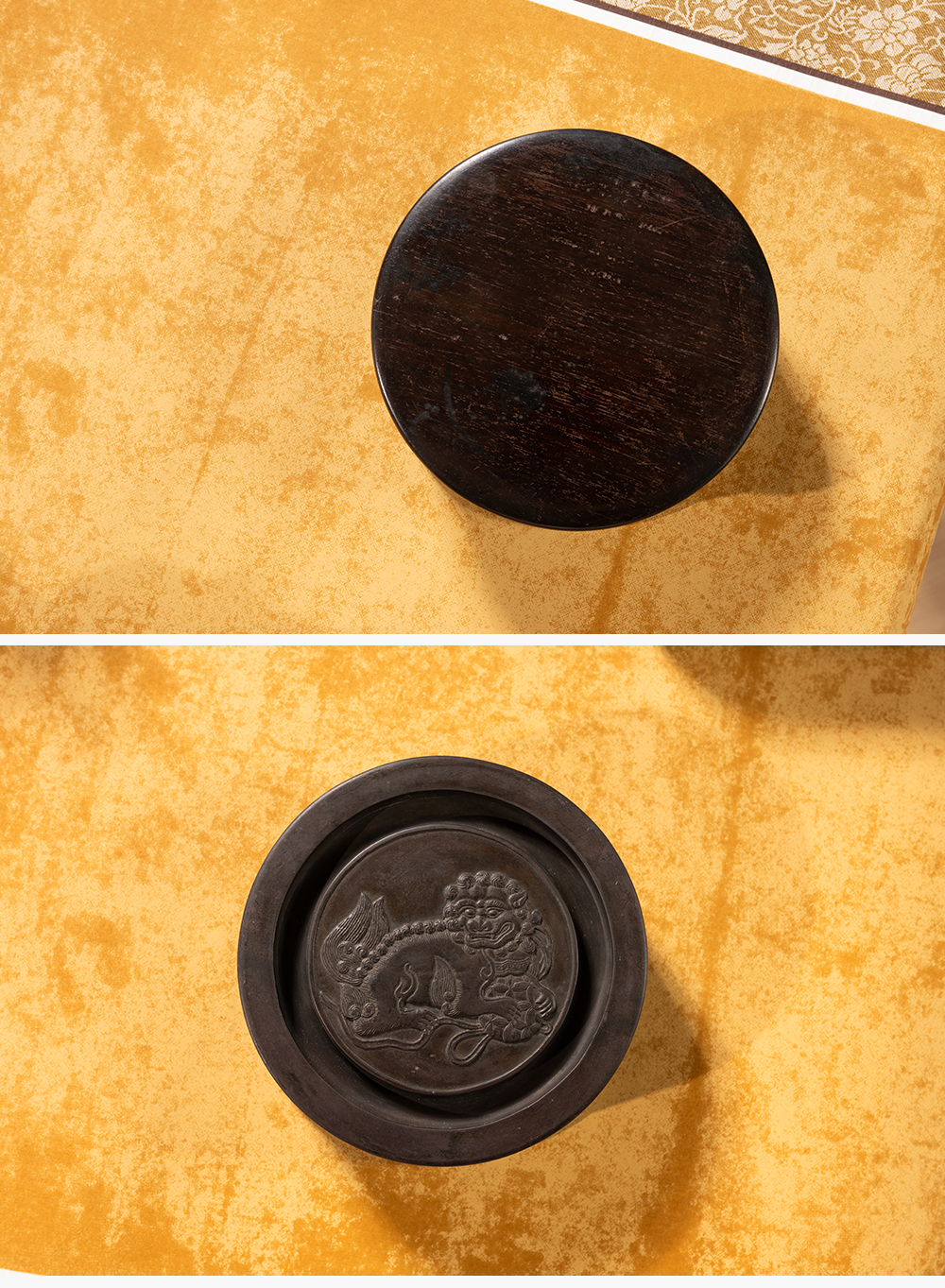 清 沈景修款端石狮纹辟雍砚(红木天地盖)