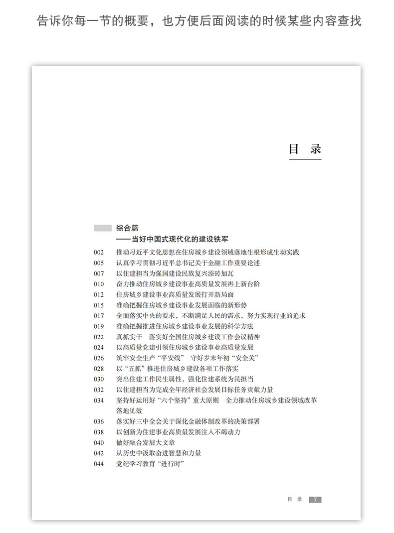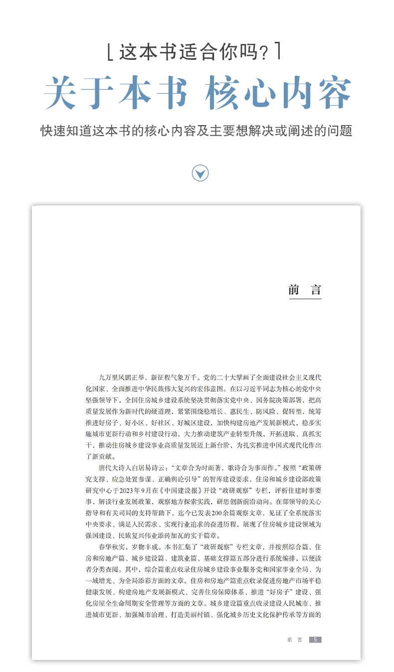 春华秋实,岁物丰成。本书汇集了《政研观察》专栏文章,并按照综合篇、住房和房地产篇、城乡建设篇、建筑业篇、基础支撑篇等五部分进行系统编排,以便读者分类查阅。其中,综合篇重点收录住房城乡建设事业服务党和国家事业全局,为一域增光、为全局添彩方面的文章。住房和房地产篇重点收录促进房地产市场平稳健康发展、构建房地产发展新模式、完善住房保障体系、推进“好房子”建设、强化房屋全生命周期安全管理等方面文章。城乡建设篇重点收录建设人民城市、推进城市更新、加强城市治理、打造美丽村镇、强化城乡历史文化保护传承等方面文章。建筑业篇重点收录中国建造、建筑业新质生产力、建筑市场和质量安全监管、建筑节能降碳等方面文章。基础支撑板块重点收录住房城乡建设领域法治、标准、科技、人才、国际交流合作等方面文章。