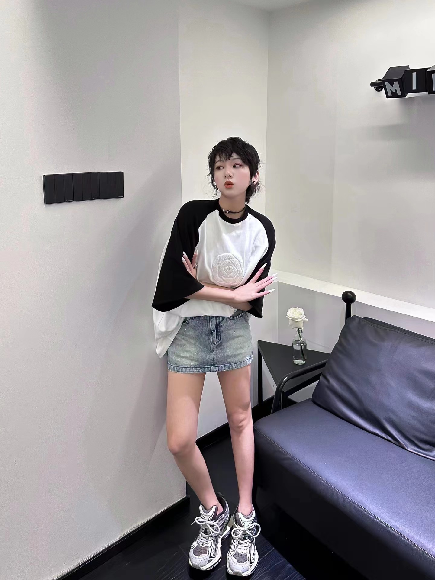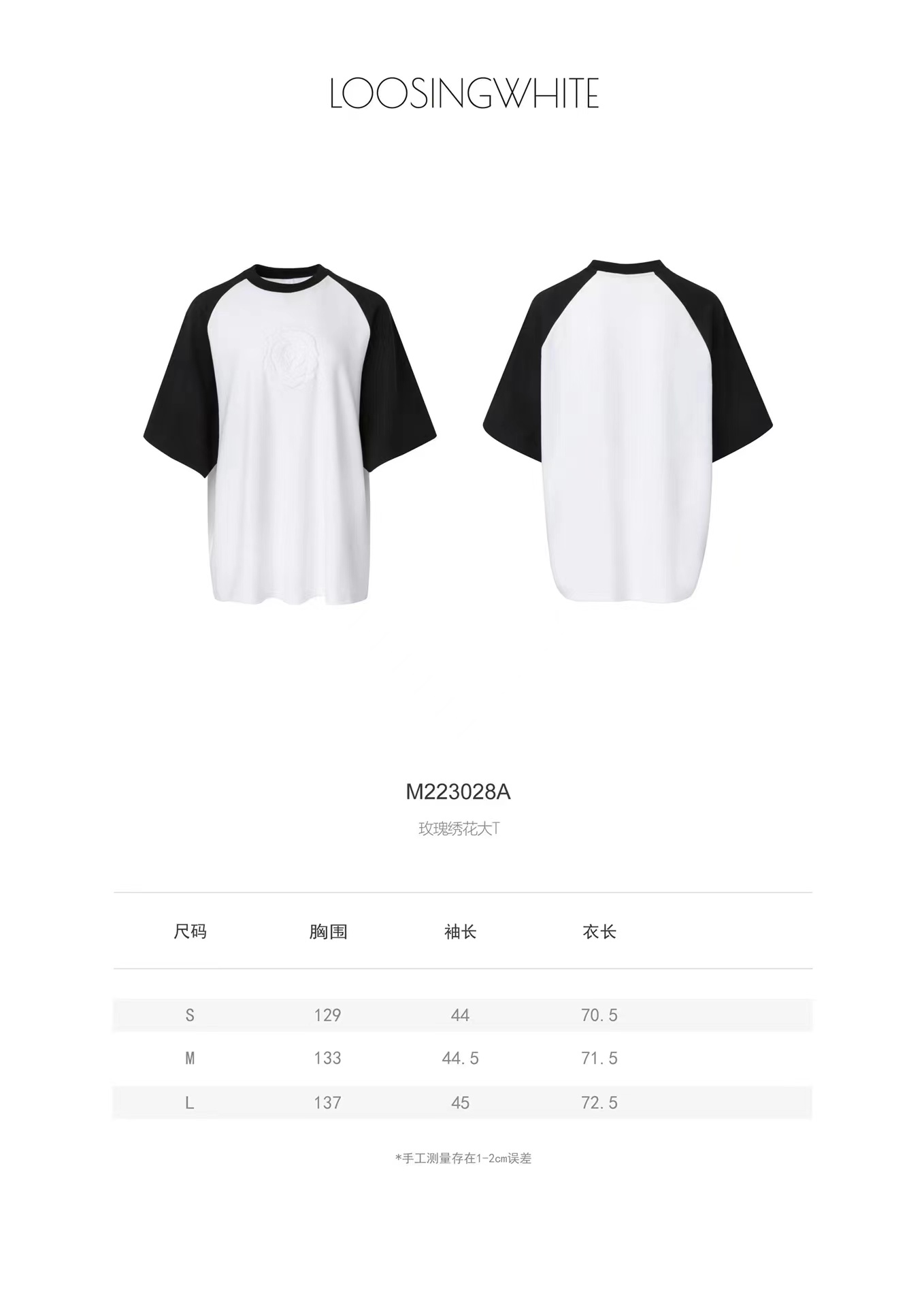 分镜头集成店LOOSINGWHITE春夏系列玫瑰绣花大T恤拼色宽松短袖