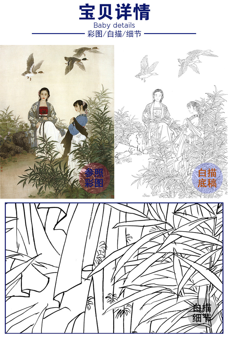 工笔传统仕女人物白描底稿-王美芳《八月》-斗方小品册页-多种白描尺寸可选-B149
