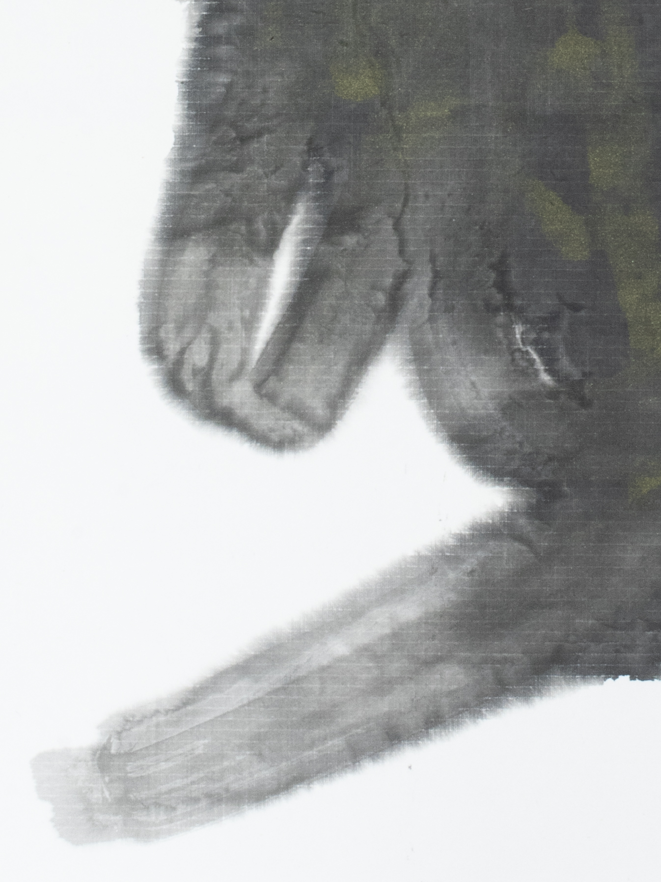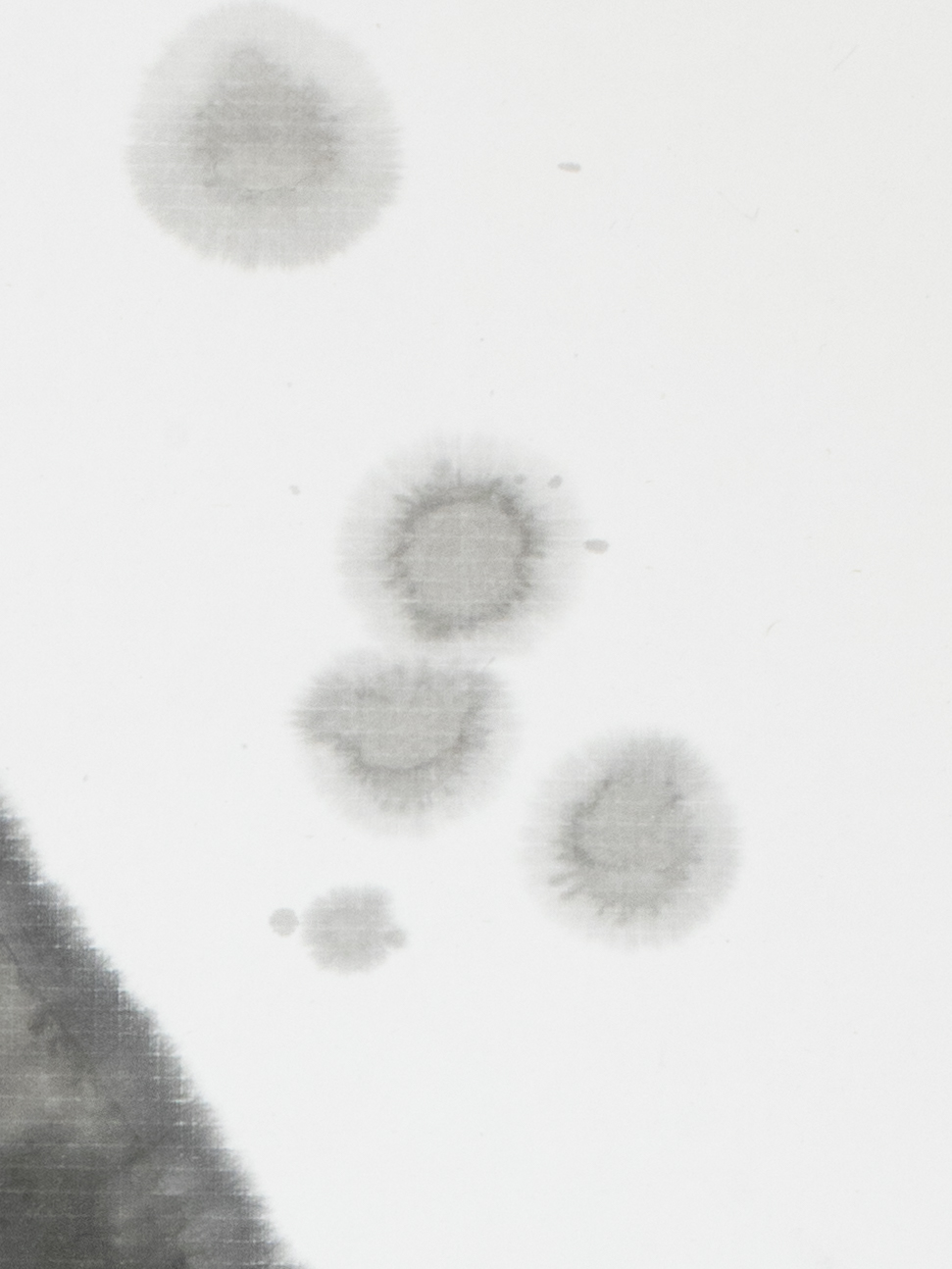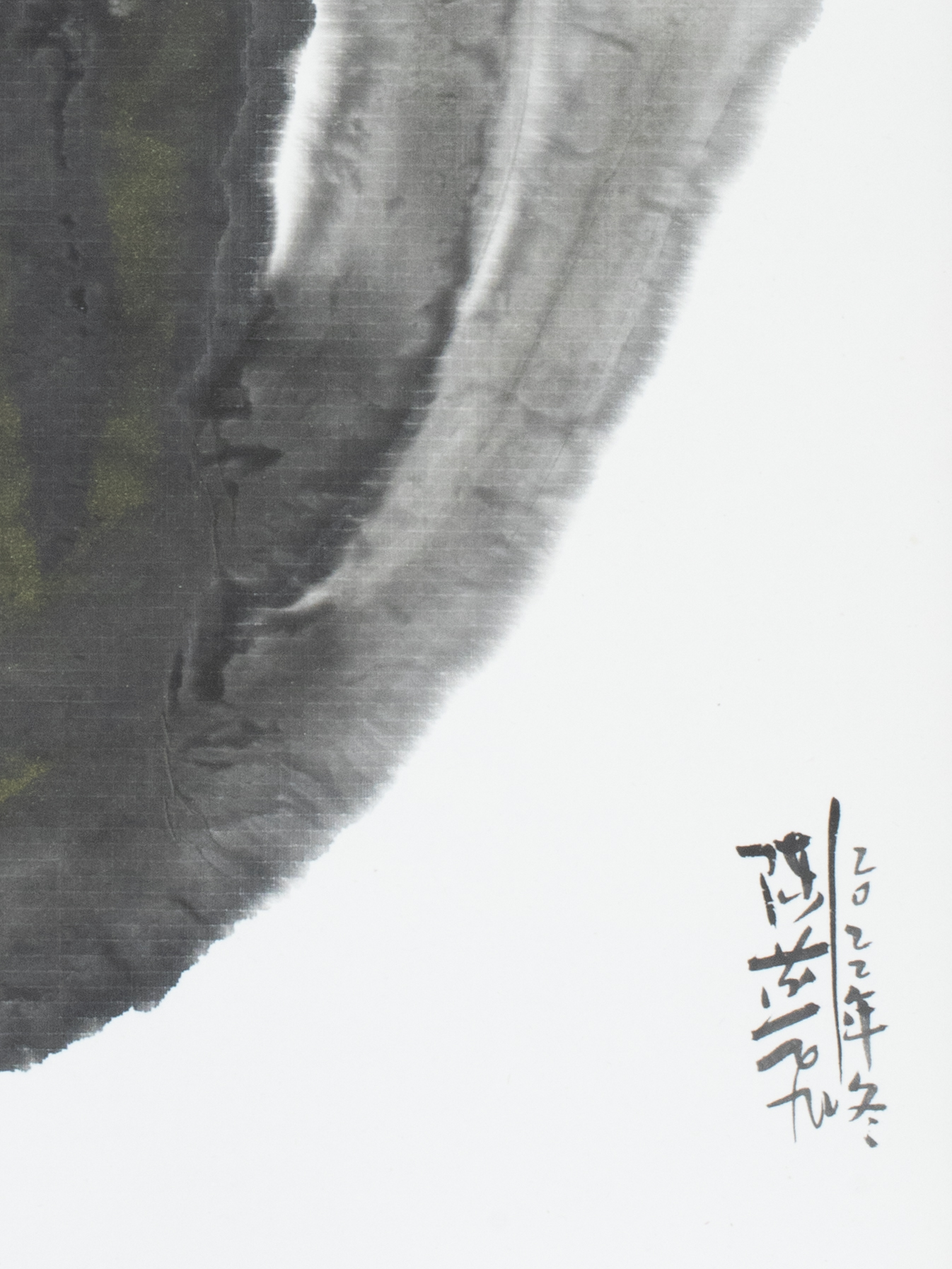 左侧部分笔力饱满,质朴厚重,浓不凝滞,也达成了整幅画面的平衡感,右侧部分以形写意,用墨活气盎然,淡不浮薄,神采奕奕。