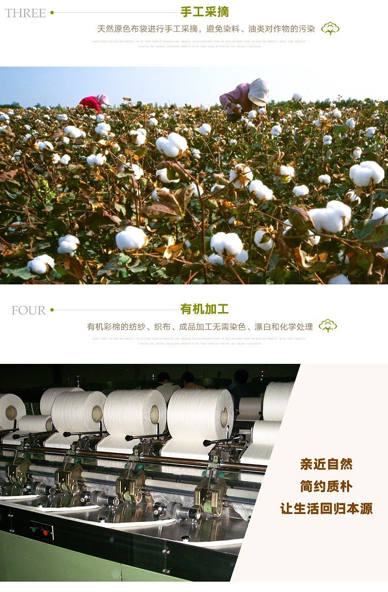 简单来说,原料种植不用化肥农药、不用除草剂、不用落叶剂、不用转基因,纺纱、织造和成品加工全过程不使用有害化学品处理等,遵循国际和国内有机产品生产加工标准和要求,这样生产出来的纺织品就可以叫有机纺织品。