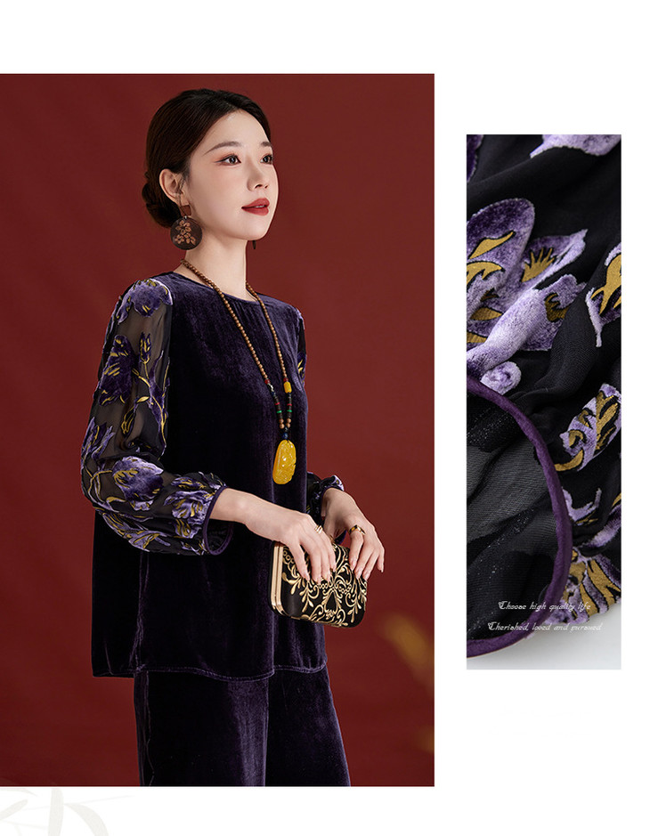 国风印花拼接真丝丝绒,复古上衣圆领气质时尚SM-12501331