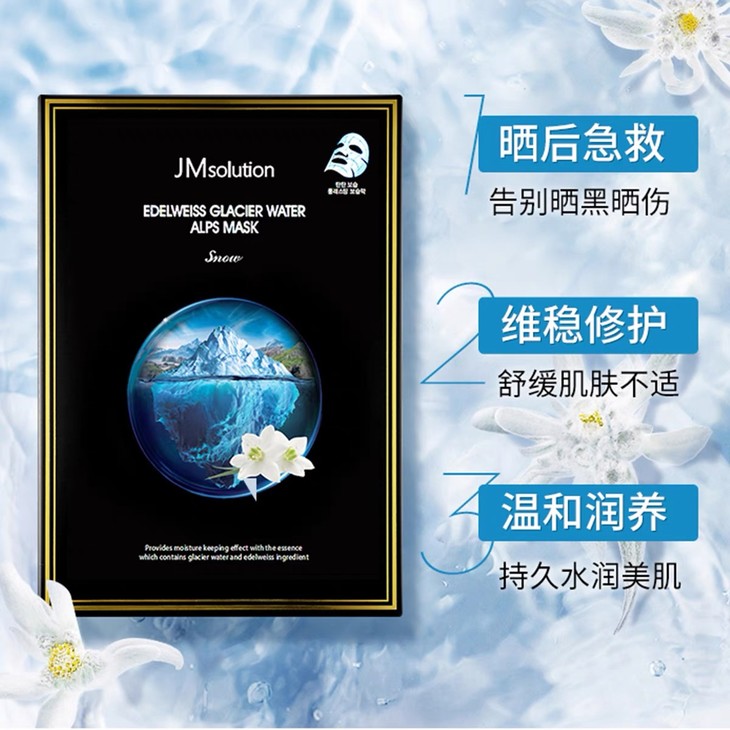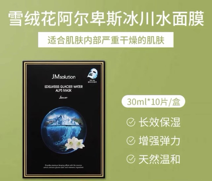 👑JM solution 雪绒花冰川水面膜 10片 👍JM-新品面膜! 🌵蕴含:雪绒花提取物+3种玻尿酸+阿尔卑斯冰川水 ⭐主打:温和补水、舒缓干燥肌肤 ✅有效:紧致细腻、舒缓干燥、增强弹力、补水保湿 💯精华丰富,水润保湿部粘腻 🔅亲肤天丝膜布,软薄服帖,隐形亲肤