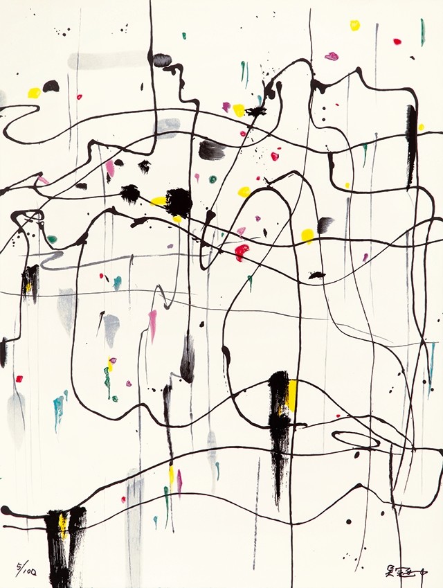 仅用线条来展现春日的明媚,贯穿这个画面的线条,如曲谱,如柳丝,隐约之间似乎可见少女的面颊、少女的倩影,还有那繁星朵朵的花蕾,将抽象艺术与中国画有效结合,给人以充分的遐想空间。