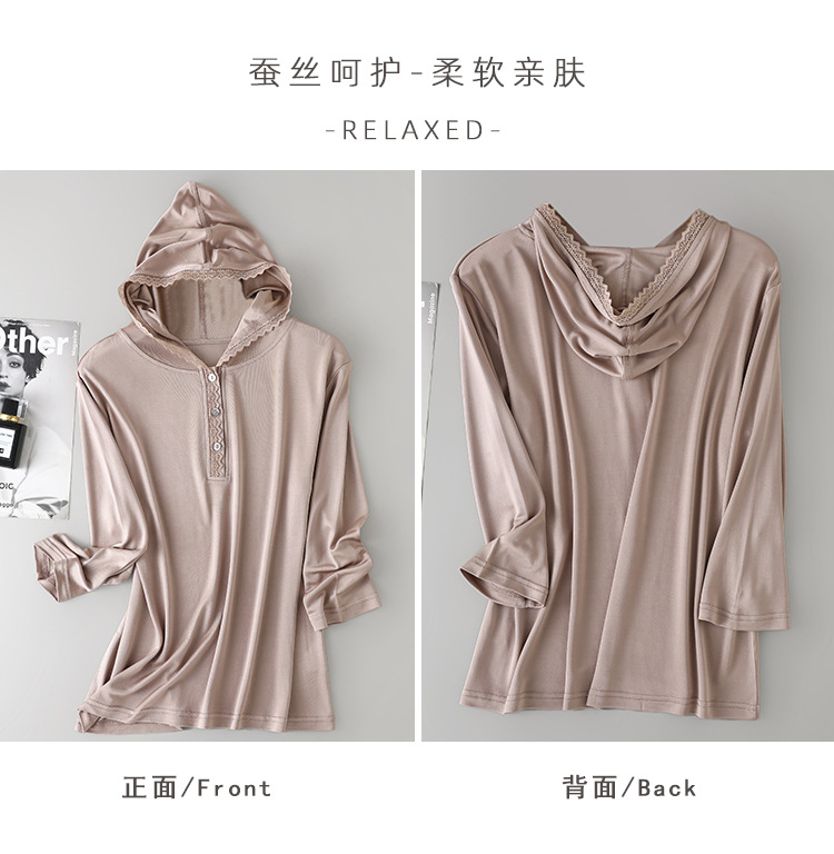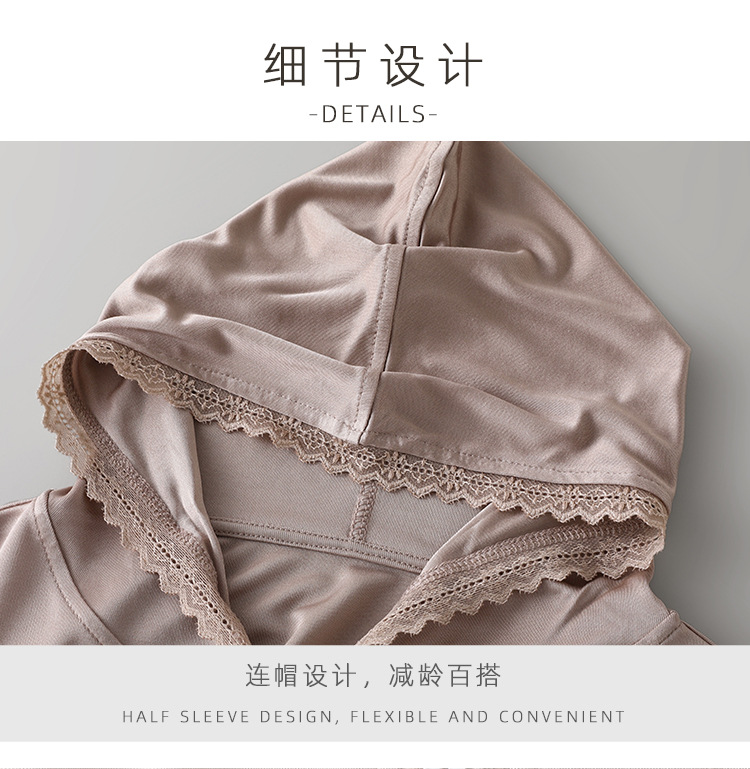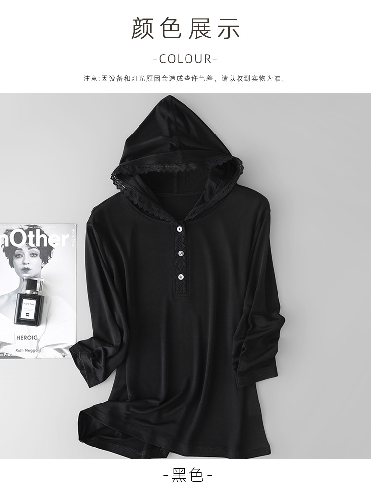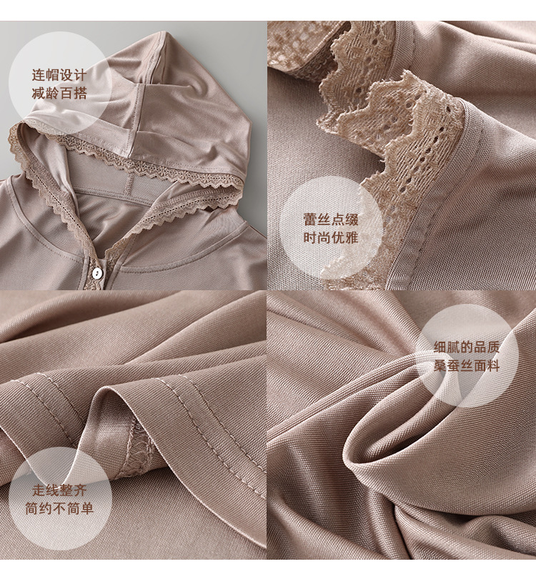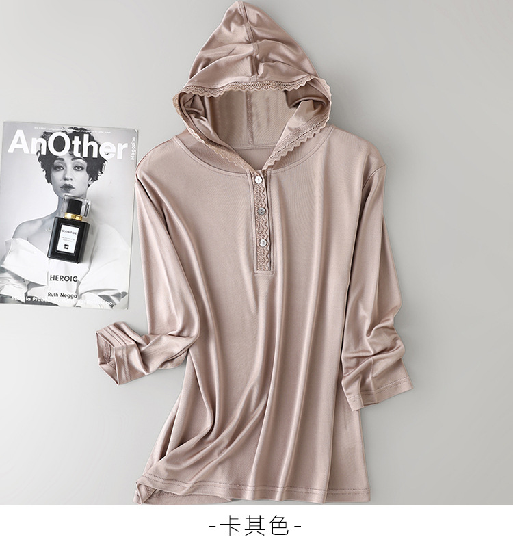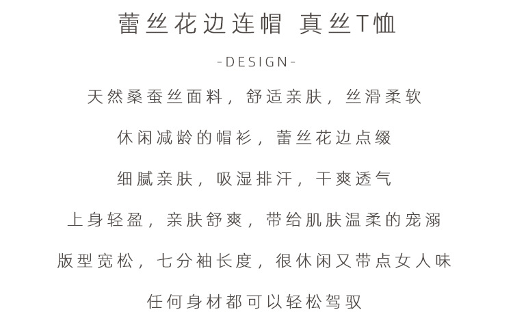 百媚生 重磅针织真丝蕾丝花边连帽七分袖上衣TX-067