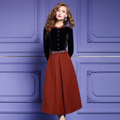 【断码清仓】连衣裙撞色复古收腰过膝中长格子裙