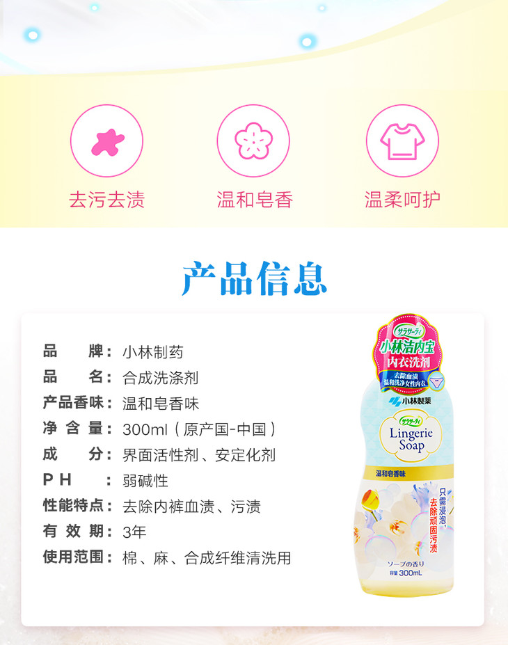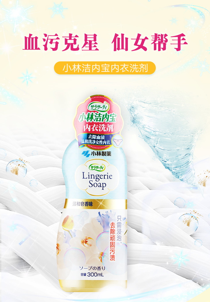 小林制药内裤清洗液 经期生理期专用血渍清洗120ml超给力👍的小林制药生理期专用的清洗液,倒一点点加水💦稍微揉搓再强悍的血渍都能消失无影踪💨。洗的时候温水冷水都可以,生理期血液(经血),分泌物(白带),割伤等血液污渍(内裤以外均可使用)不仅可以用于内衣👙,其他衣服👗👘👕如果染上血渍也可以使它清除。