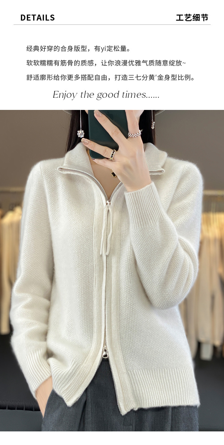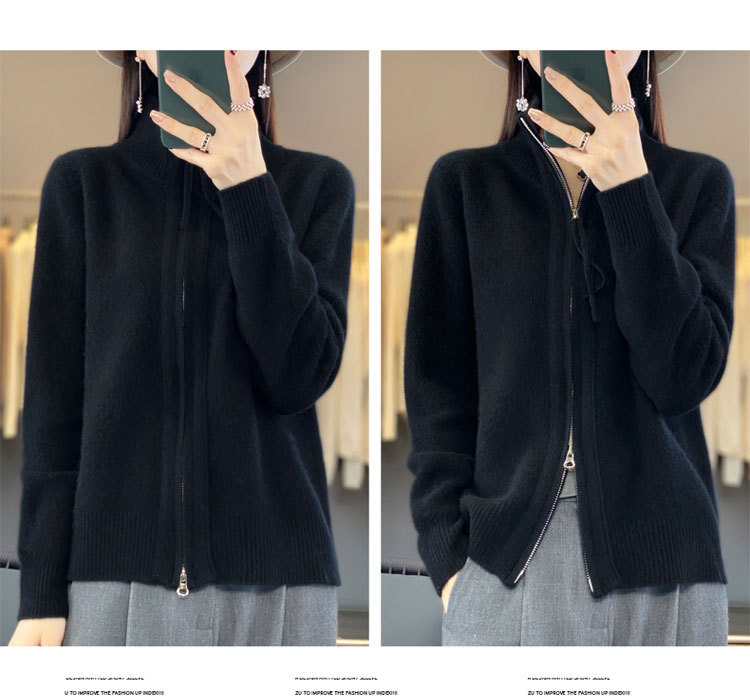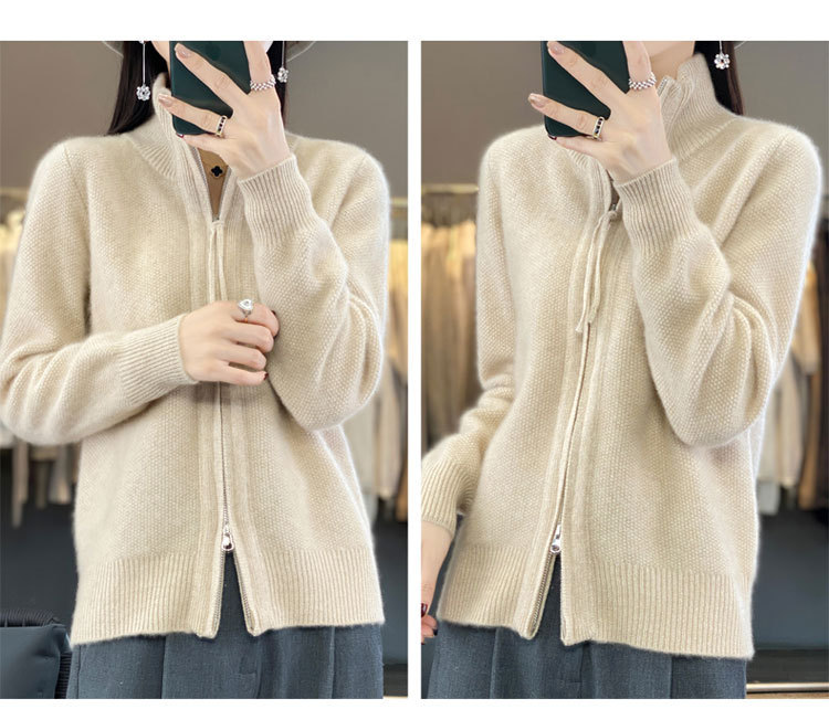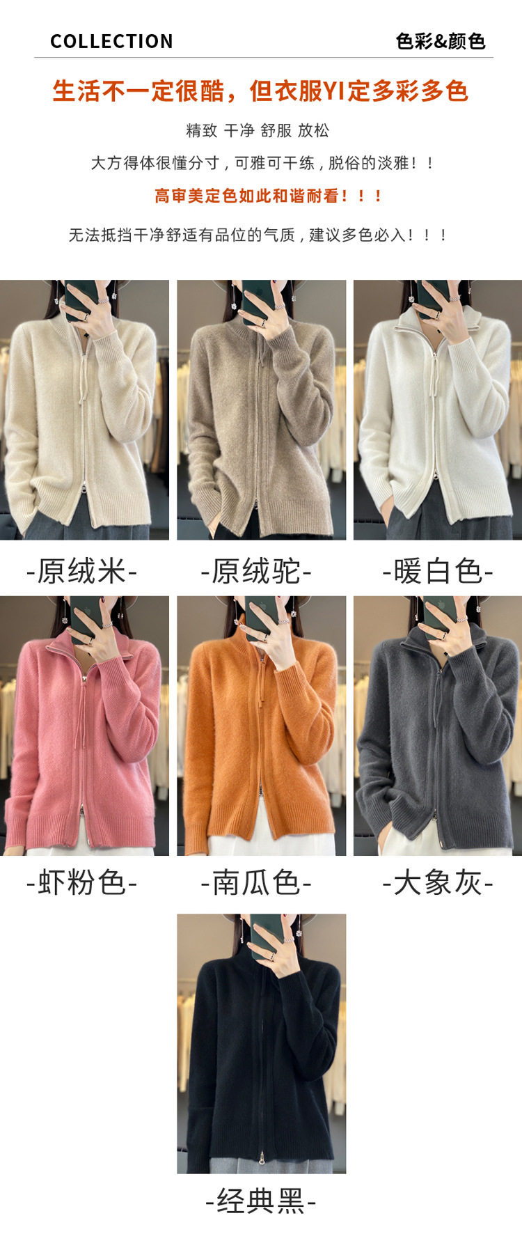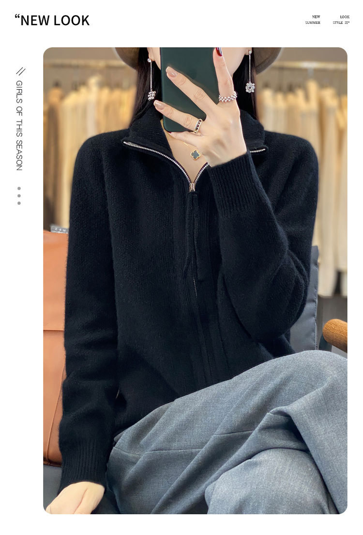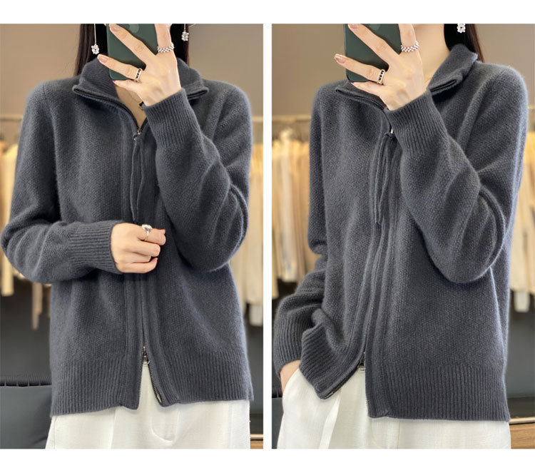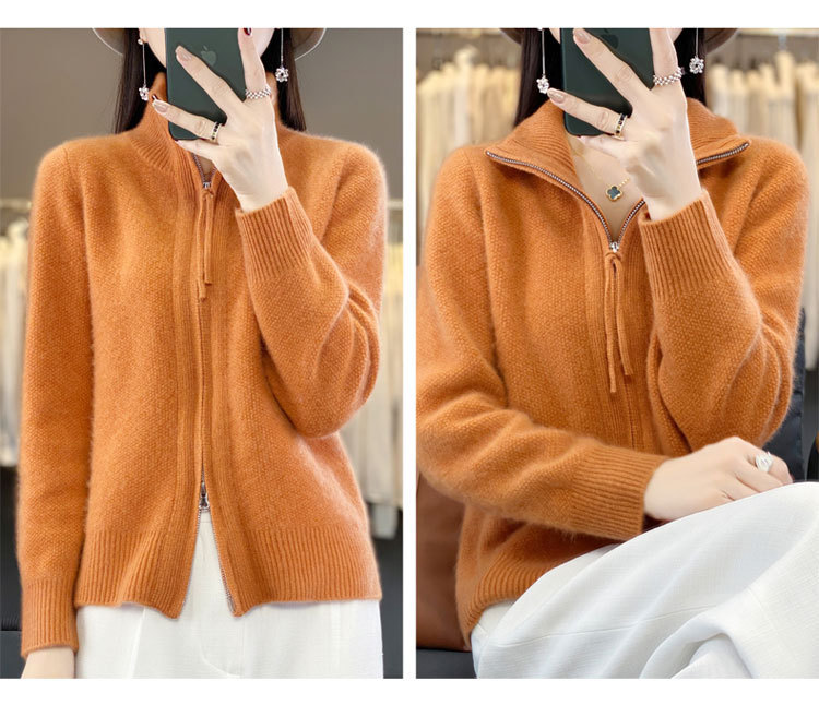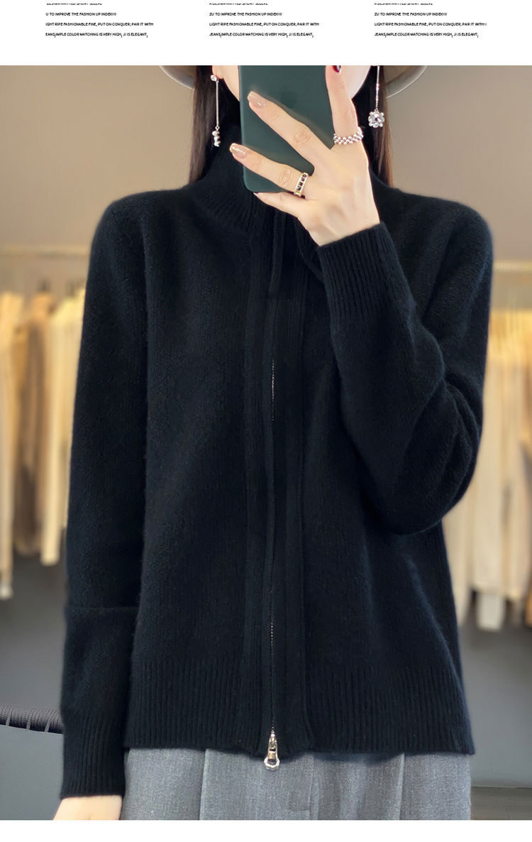QHJY-NJRG851秋冬新款双拉链高领加厚羊毛开衫女纯色显瘦保暖外套针织上衣